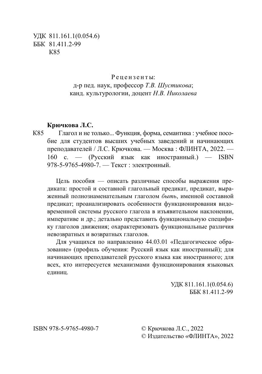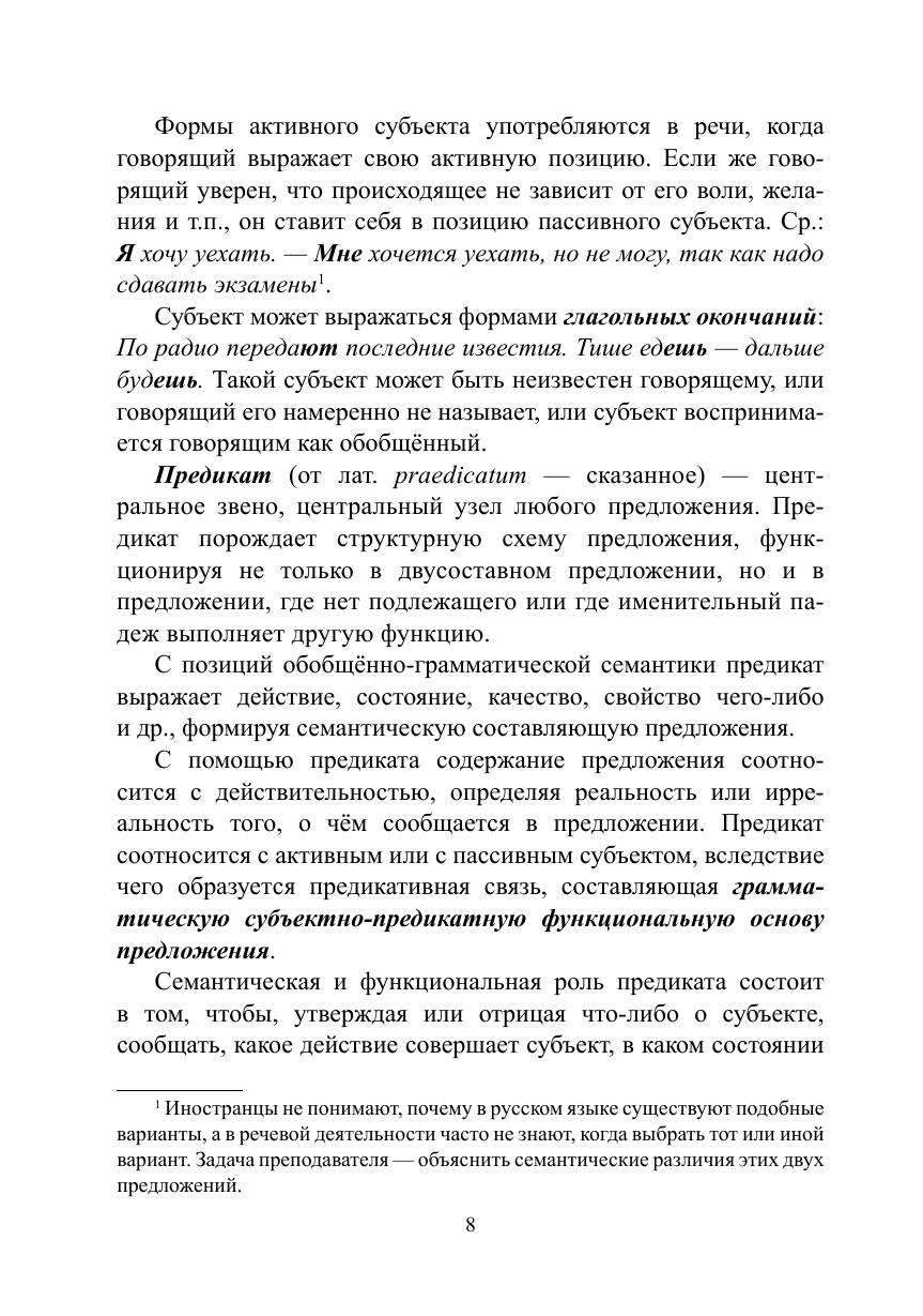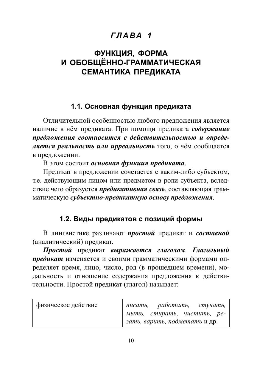 Цель пособия — описать различные способы выражения предиката: простой и составной глагольный предикат, предикат, выраженный полнознаменательным глаголом быть, именной составной предикат; проанализировать особенности функционирования видовременной системы русского глагола в изъявительном наклонении, императиве и др.; детально представить функциональную специфику глаголов движения; охарактеризовать функциональные различия невозвратных и возвратных глаголов.