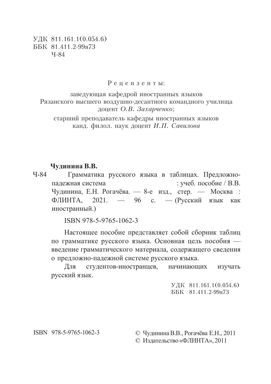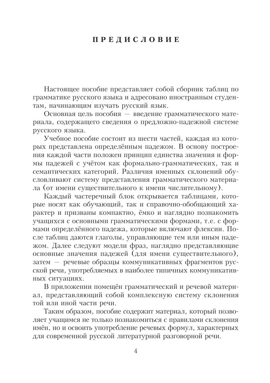 Настоящее пособие представляет собой сборник таблиц по грамматике русского языка. Основная цель пособия — введение грамматического материала, содержащего сведения о предложно-падежной системе русского языка.
