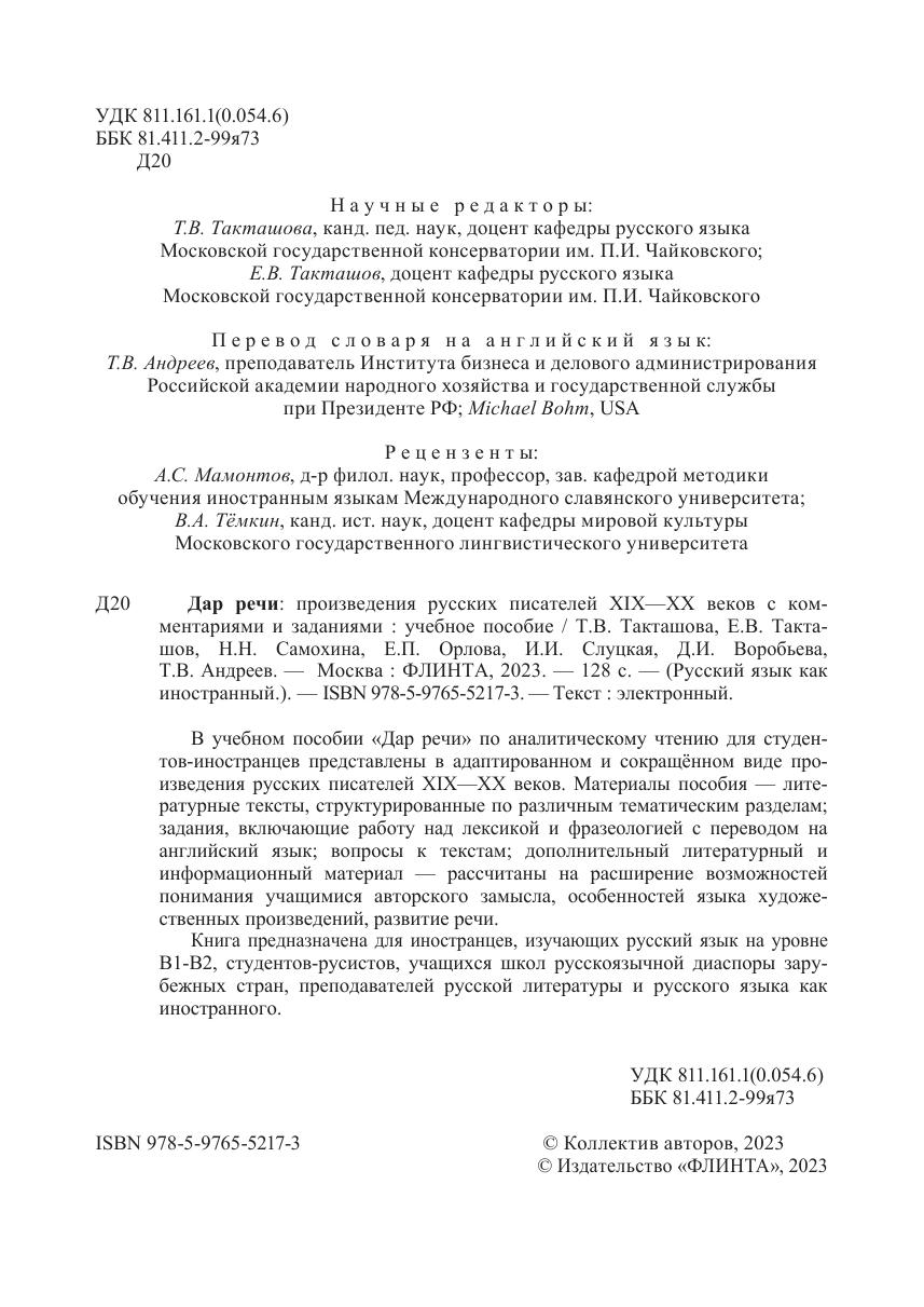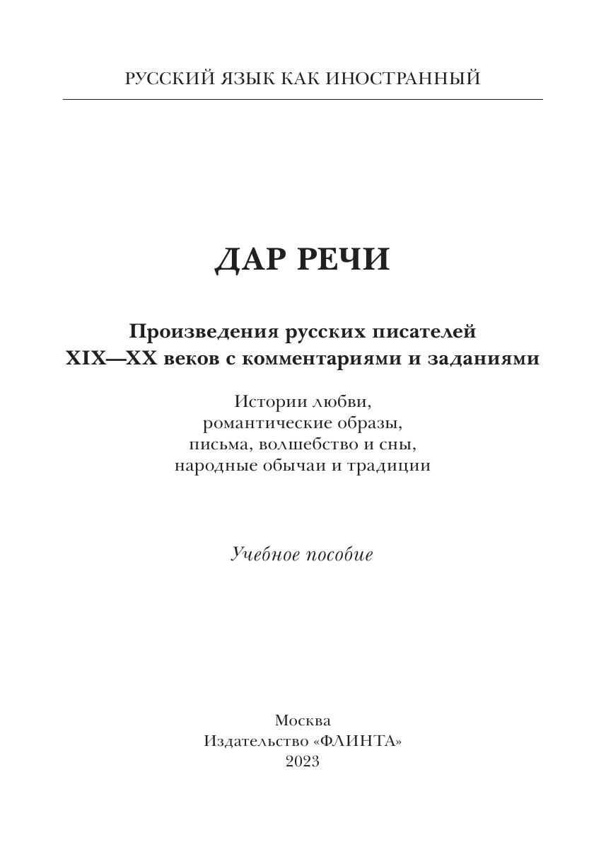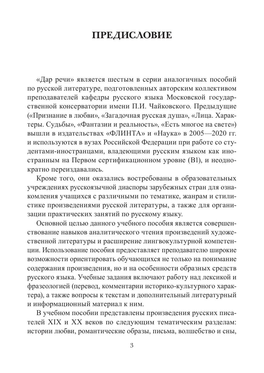 В учебном пособии «Дар речи» по аналитическому чтению для студентов-иностранцев представлены в адаптированном и сокращённом виде произведения русских писателей XIX—XX веков. Материалы пособия — литературные тексты, структурированные по различным тематическим разделам; задания, включающие работу над лексикой и фразеологией с переводом на английский язык; вопросы к текстам; дополнительный литературный и информационный материал — рассчитаны на расширение возможностей понимания учащимися авторского замысла, особенностей языка художественных произведений, развитие речи.