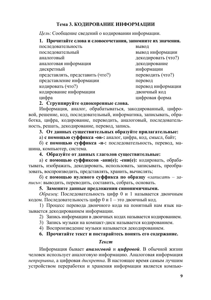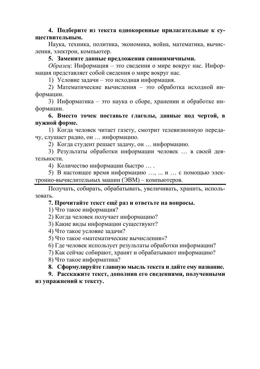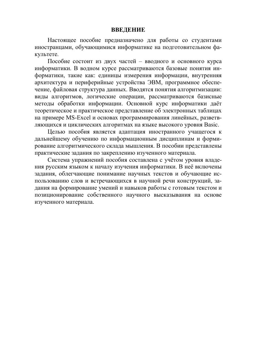 Пособие знакомит иностранных учащихся с языком информатики, содержит адаптированные тексты, лексико-грамматический материал и задания, позволяющие студентам-иностранцам усвоить терминологическую лексику курса информатики и получить основные практические навыки алгоритмизации.