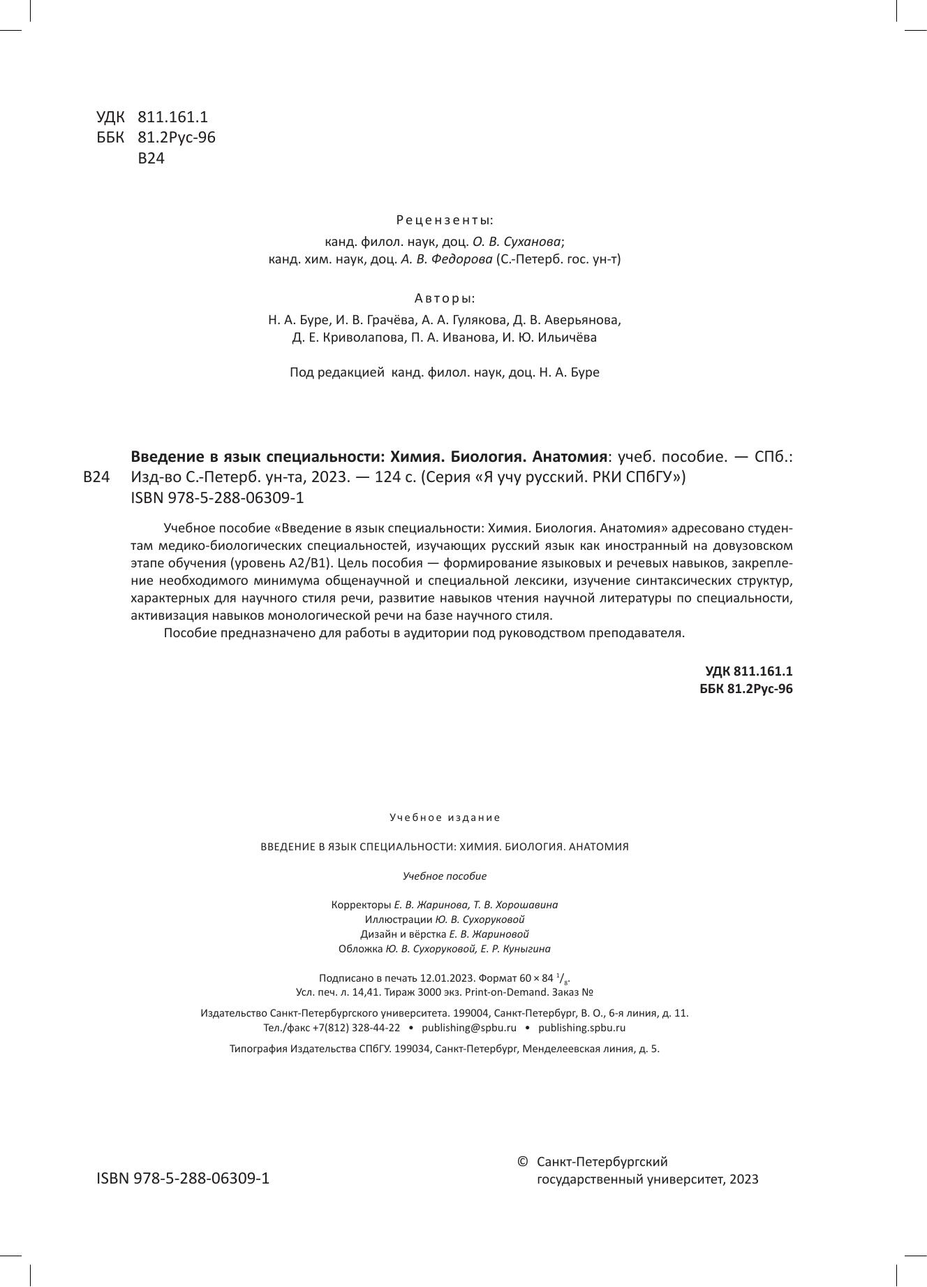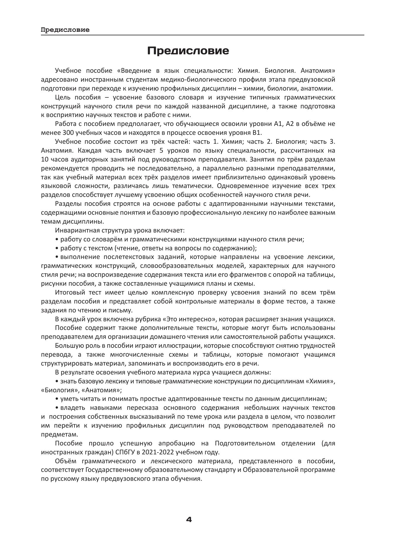 Учебное пособие "Введение в язык специальности: Химия. Биология, Анатомия" адресовано студентам медико-биологических специальностей, изучающих русский язык как иностранный на довузовском этапе обучения ( уровень А2/В1). Цель пособия - формирование языковых и речевых навыков, закрепление необходимого минимума общенаучной и специальной лексики, изучение с синтаксических структур, характерных для научного стиля речи, развитие навыков чтения научной литературы по специальности, активизация навыков монологической речи на базе научного стиля. Пособие предназначено для работы в аудитории под руководством преподавателя.