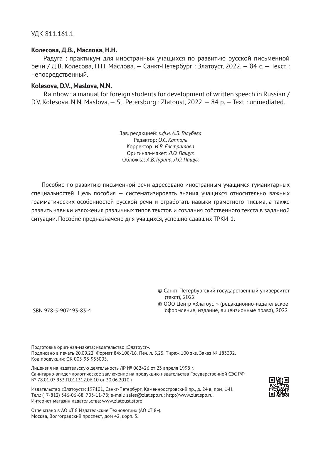 Пособие по развитию письменной речи адресовано иностранным учащимся гуманитарных специальностей. Цель пособия — систематизировать знания учащихся относительно важных грамматических особенностей русской речи и отработать навыки грамотного письма, а также развить навыки изложения различных типов текстов и создания собственного текста в заданной ситуации. Пособие предназначено для учащихся, успешно сдавших ТРКИ-1.