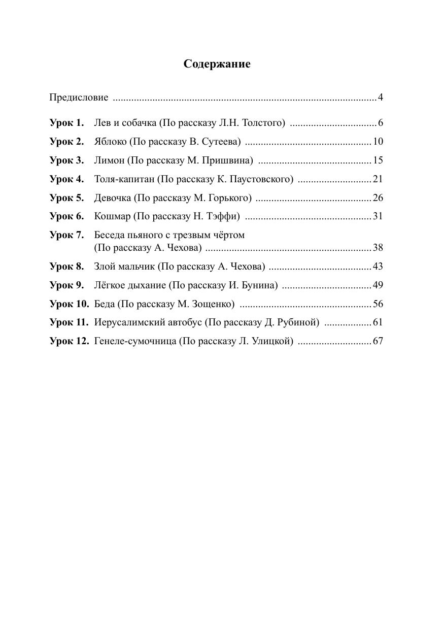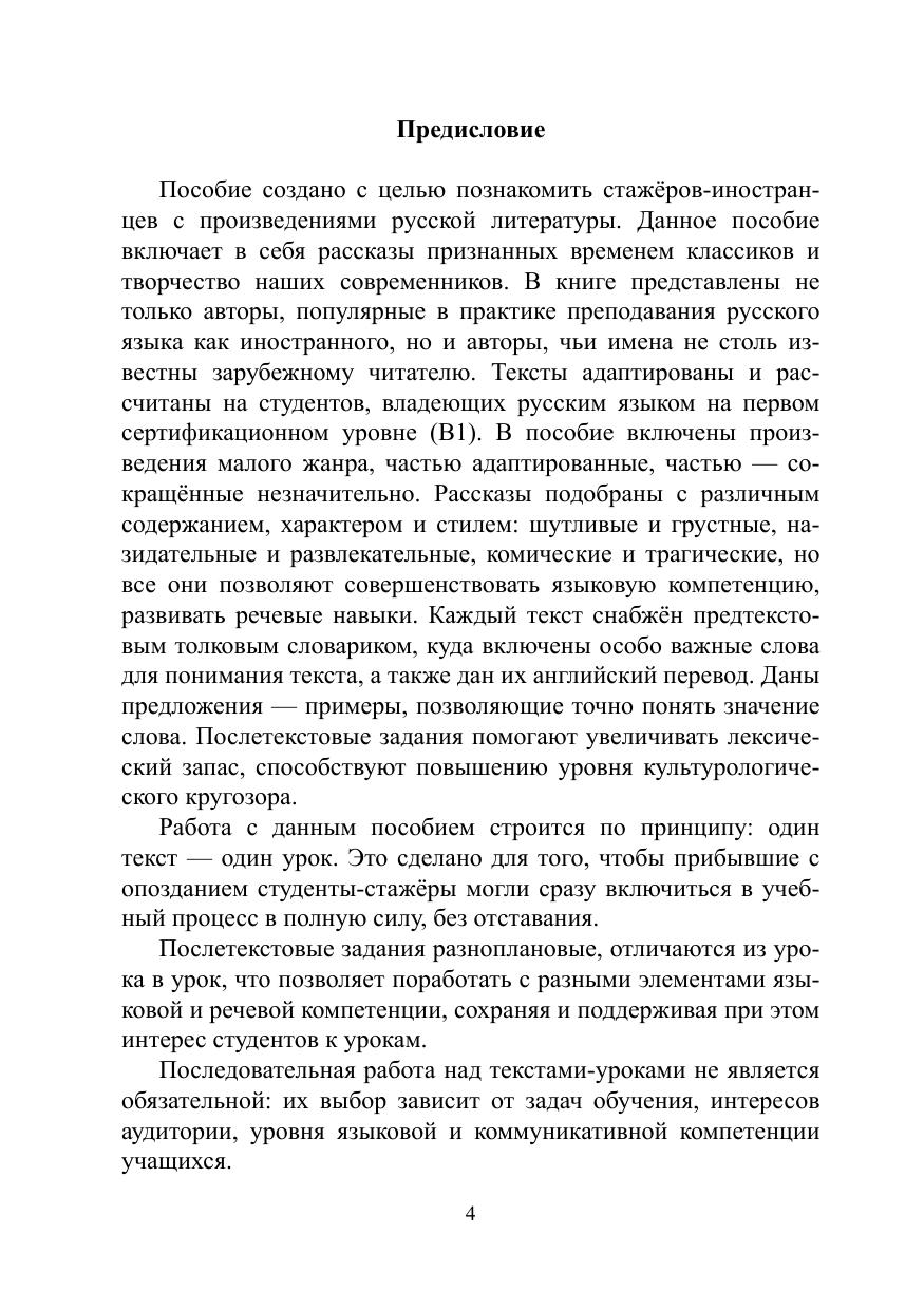 Настоящее учебное пособие включает в себя рассказы русских писателей. Тексты адаптированы и снабжены серией лексико-грамматических упражнений, способствующих повышению уровня языковой компетенции, и упражнений, направленных на развитие речевых навыков.