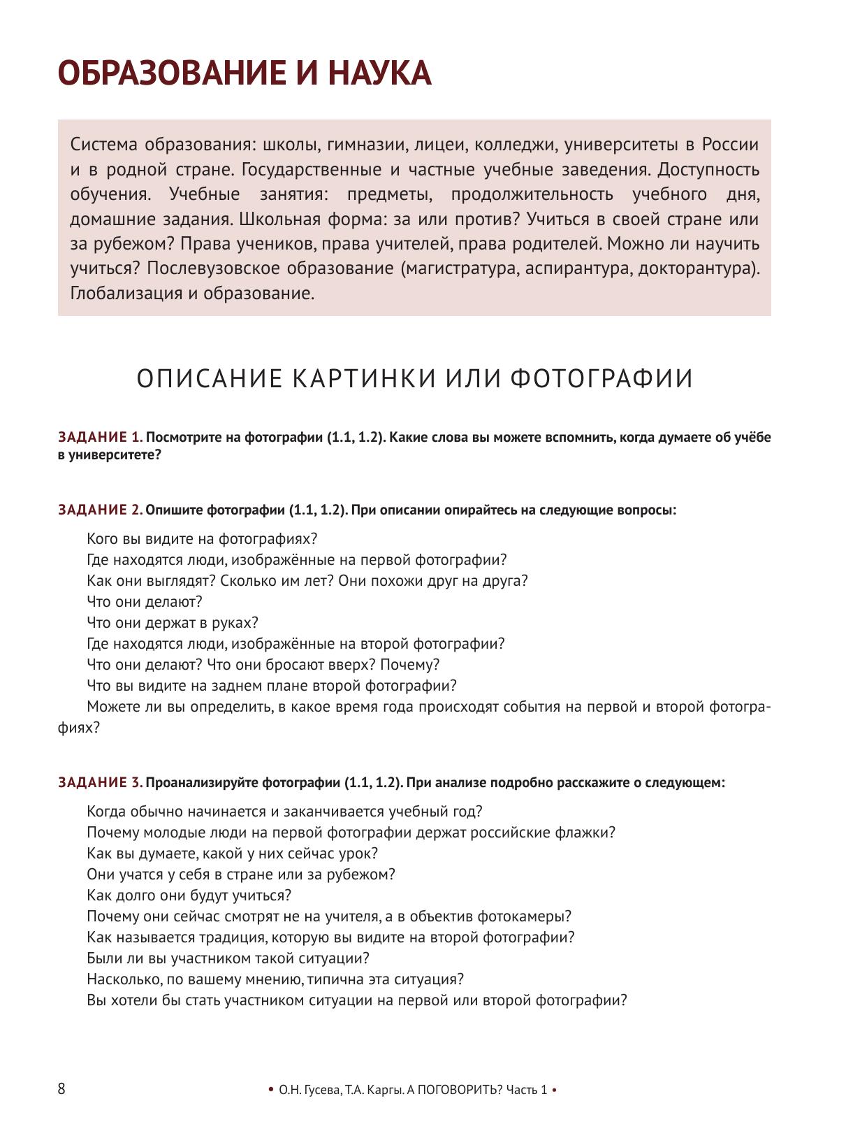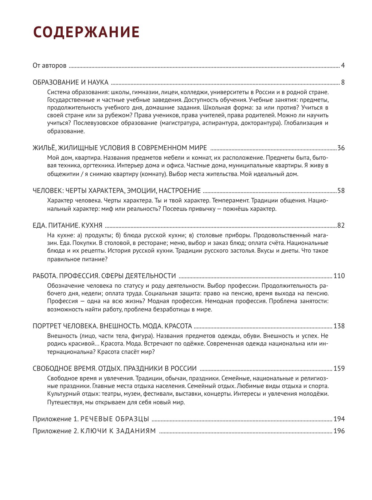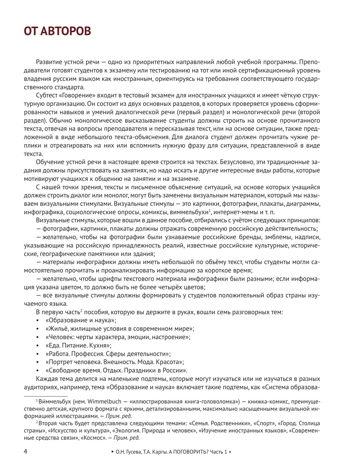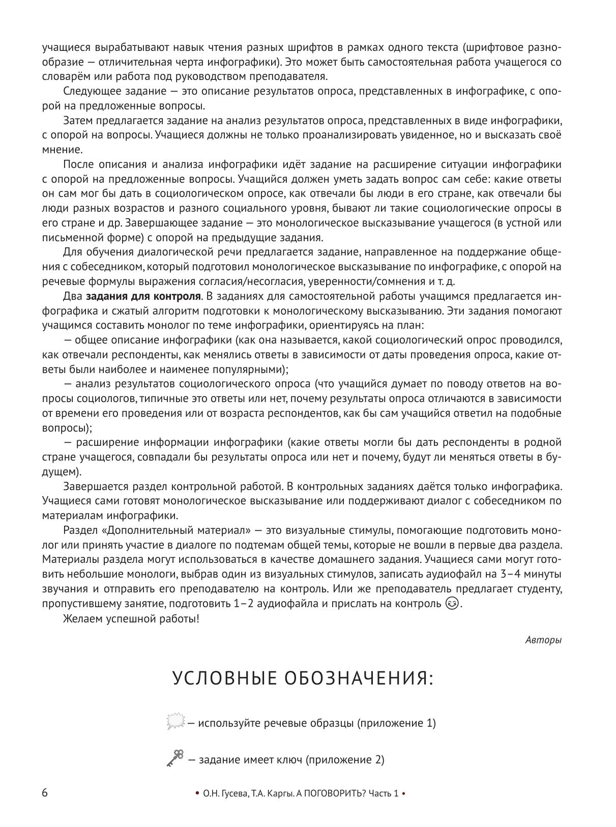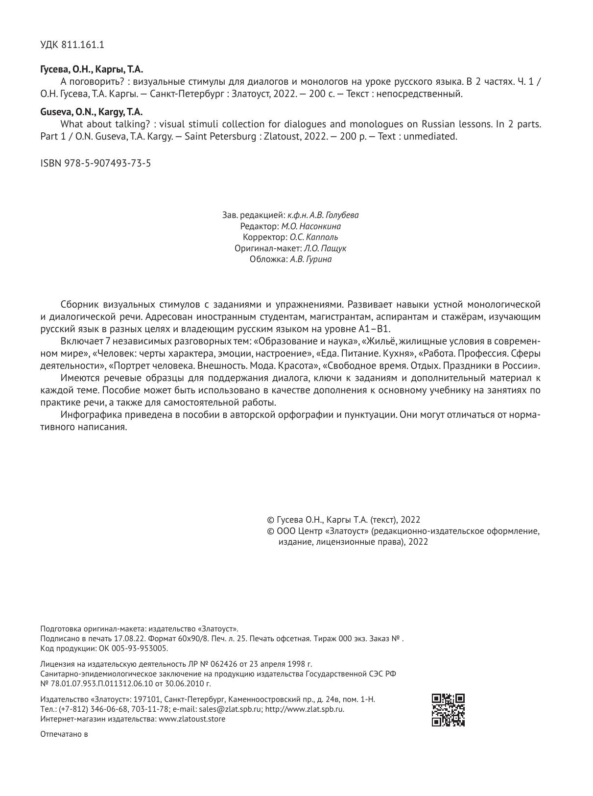 Сборник визуальных стимулов с заданиями и упражнениями. Развивает навыки устной монологической и диалогической речи. Адресован иностранным студентам, магистрантам, аспирантам и стажёрам, изучающим русский язык в разных целях и владеющим русским языком на уровне А1–В1. Включает 7 независимых разговорных тем: «Образование и наука», «Жильё, жилищные условия в современном мире», «Человек: черты характера, эмоции, настроение», «Еда. Питание. Кухня», «Работа. Профессия. Сферы деятельности», «Портрет человека. Внешность. Мода. Красота», «Свободное время. Отдых. Праздники в России». Имеются речевые образцы для поддержания диалога, ключи к заданиям и дополнительный материал к каждой теме. Пособие может быть использовано в качестве дополнения к основному учебнику на занятиях по практике речи, а также для самостоятельной работы. Инфографика приведена в пособии в авторской орфографии и пунктуации. Они могут отличаться от нормативного написания.
