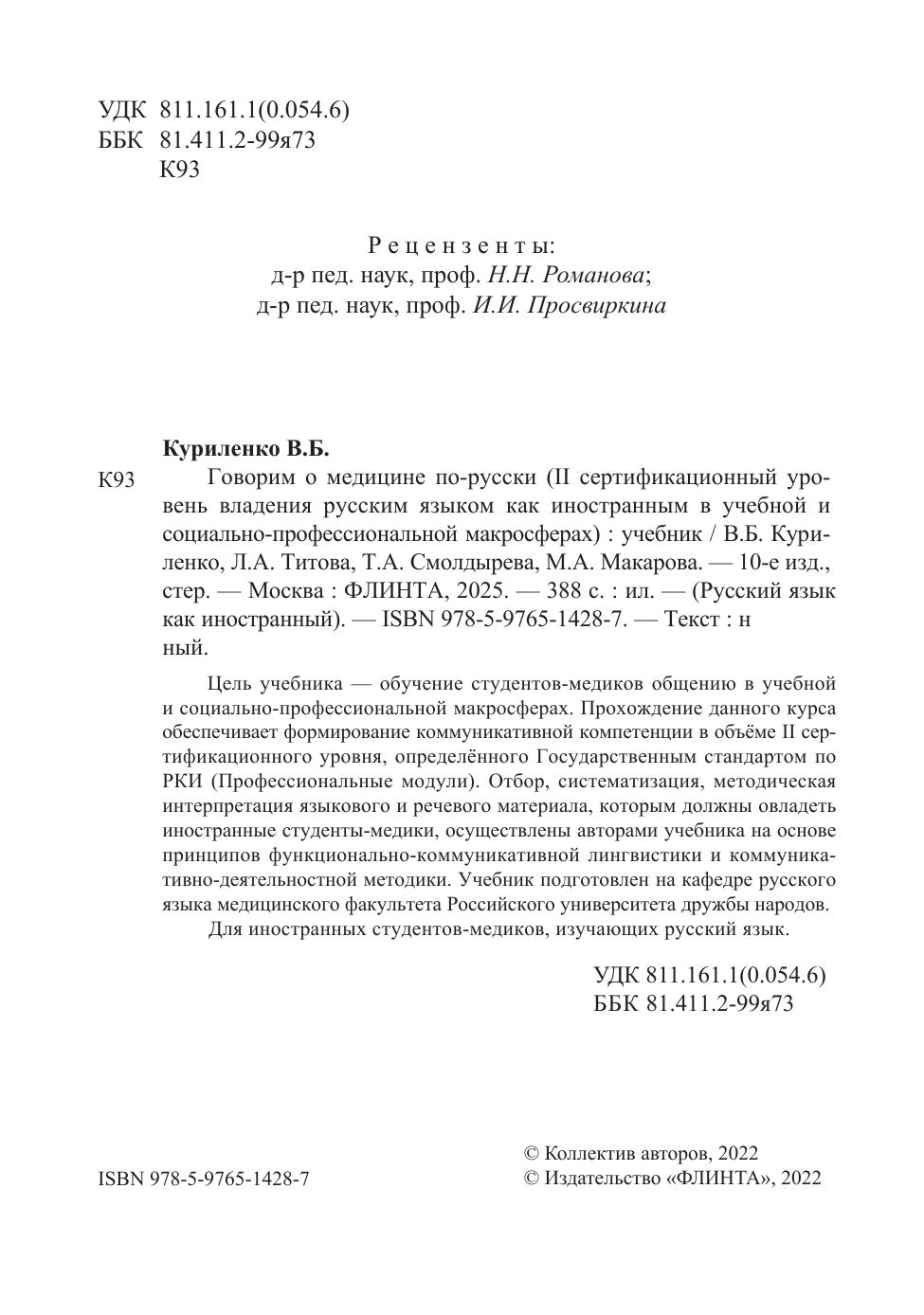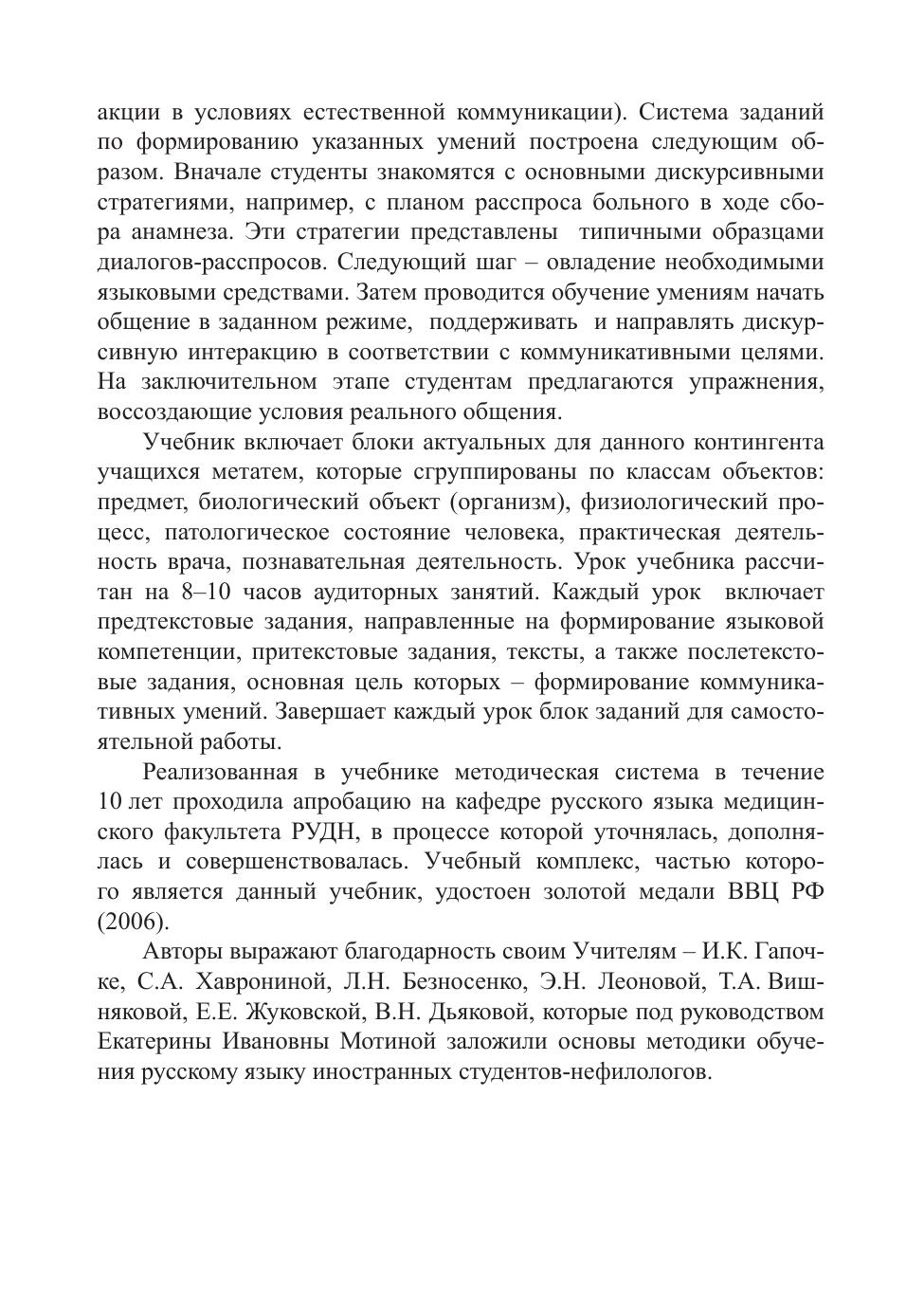 Цель учебника – обучение студентов-медиков общению в учебной и социально-профессиональной макросферах. Прохождение данного курса обеспечивает формирование коммуникативной компетенции в объёме II сертификационного уровня, определённого Государственным стандартом по РКИ (Профессиональные модули). Отбор, систематизация, методическая интерпретация языкового и речевого материала, которым должны овладеть иностранные студенты-медики, осуществлены авторами учебника на основе принципов функционально-коммуникативной лингвистики и коммуникативно-деятельностной методики. Учебник подготовлен на кафедре русского языка медицинского факультета Российского университета дружбы народов. Для иностранных студентов-медиков, изучающих русский язык.