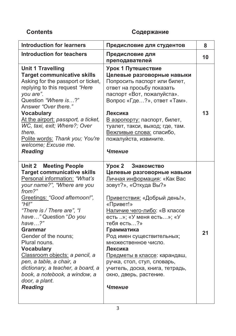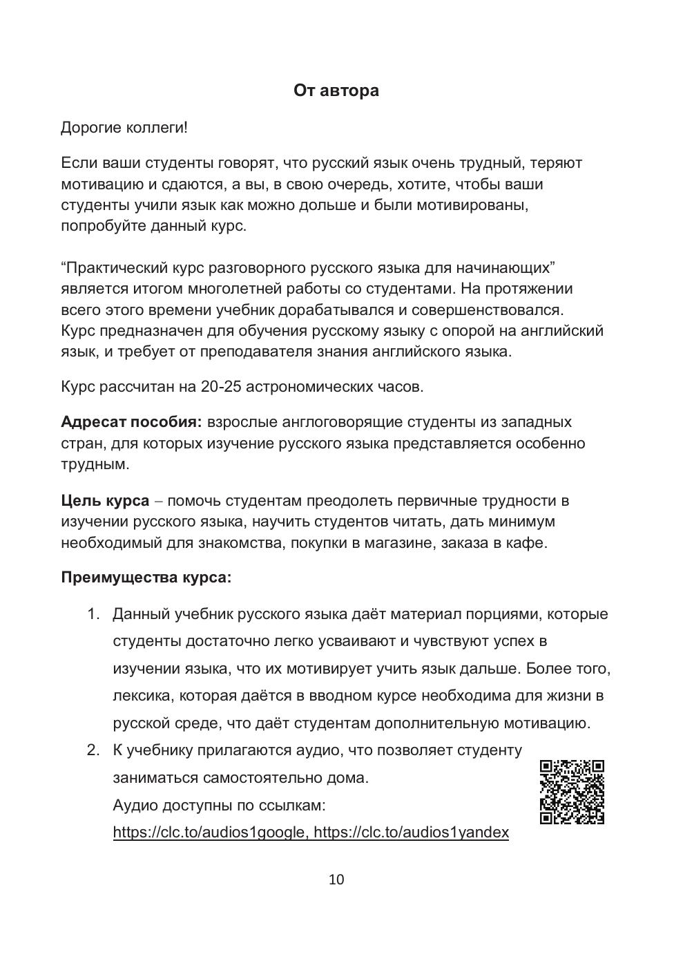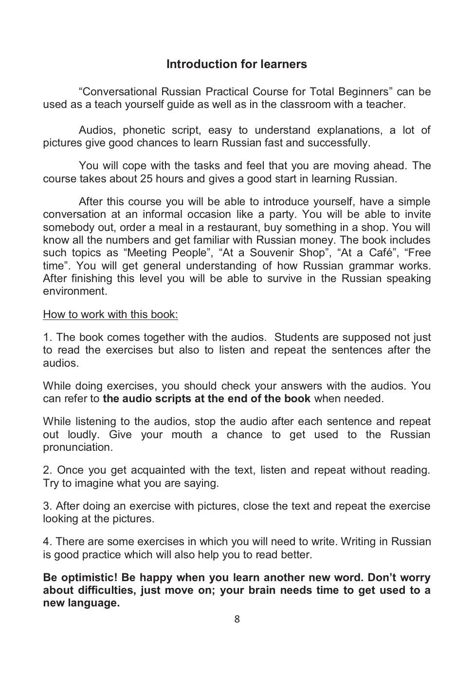Курс рассчитан на 20—25 астрономических часов. Цель курса — преодолеть первичные трудности в изучении русского языка, научиться читать, освоить минимум, необходимый для знакомства, покупки в магазине, заказа в кафе. Пособие познакомит с базовыми грамматическими структурами, научит счёту от 1 до миллиона. Материал пособия даётся порциями, которые студенты достаточно легко усваивают и чувствуют успех в изучении языка и желание двигаться дальше. Лексика, содержащаяся во вводном курсе необходима для жизни в русской среде, что даёт студентам дополнительную мотивацию.
