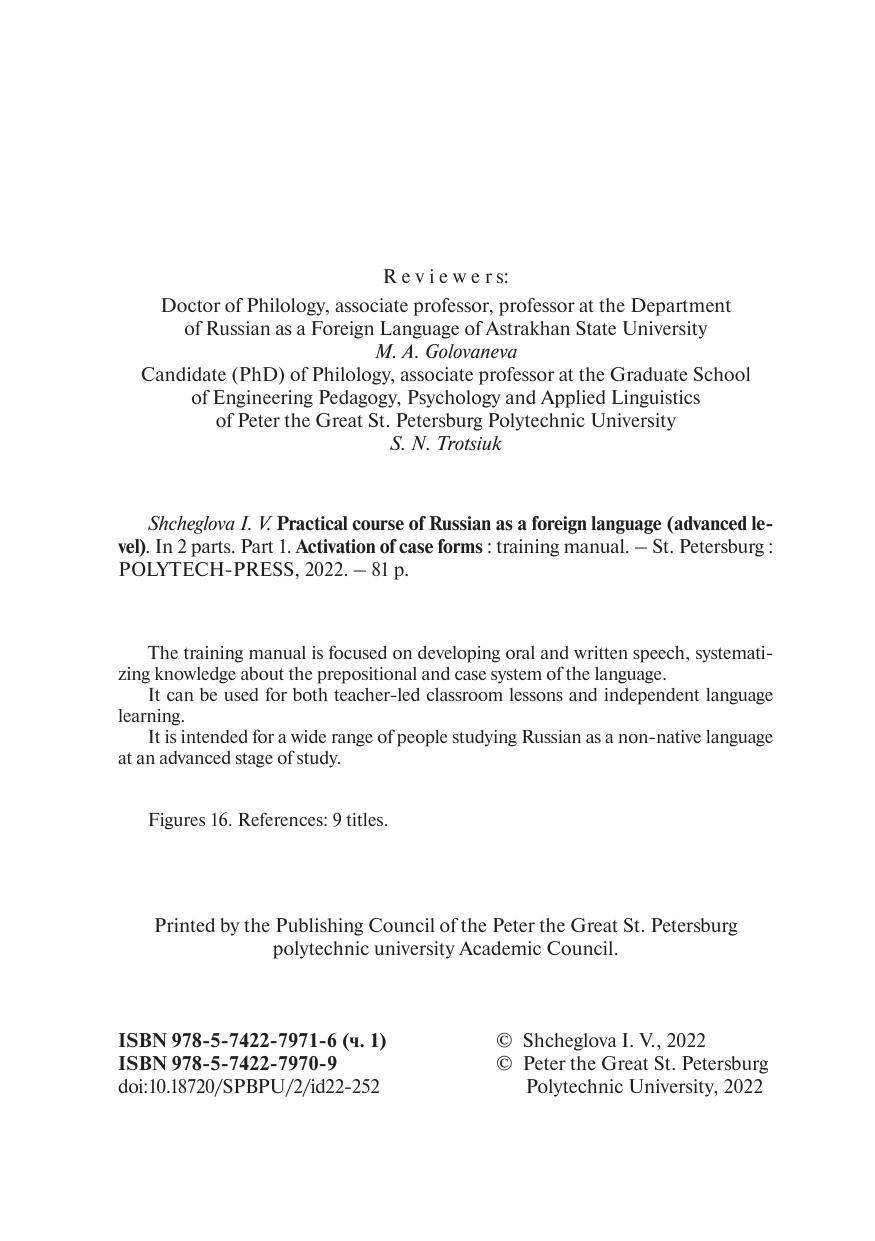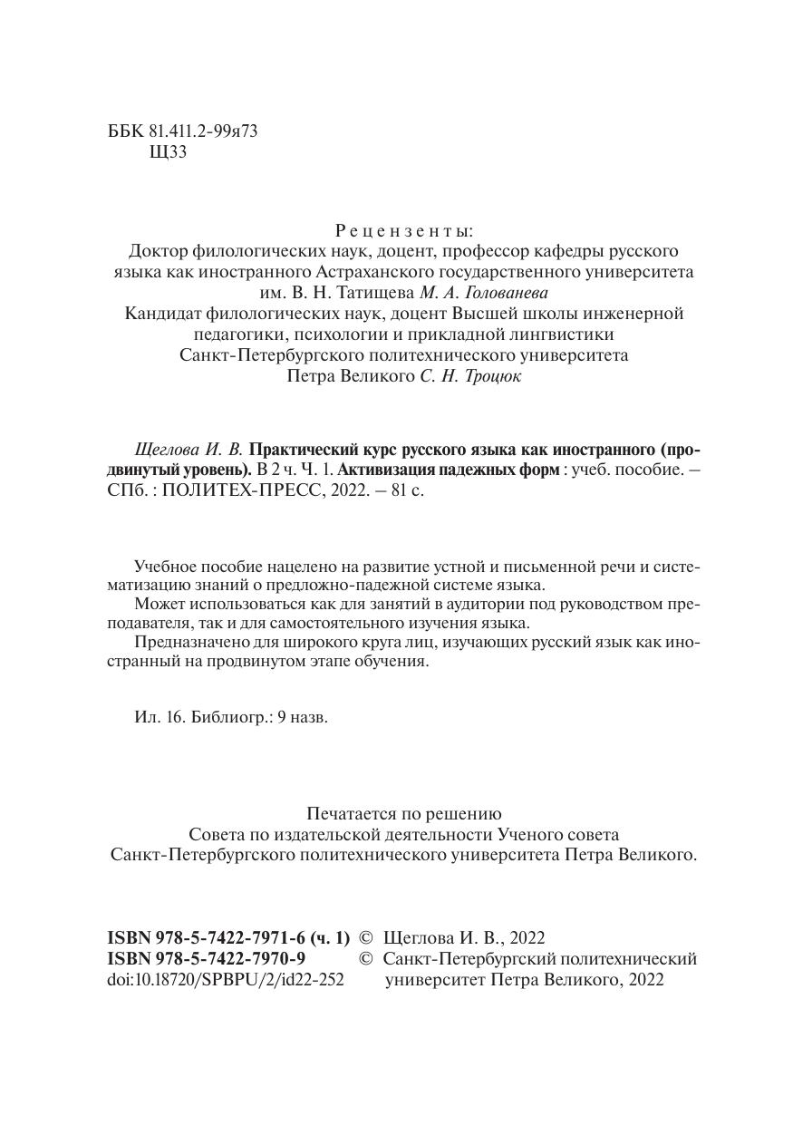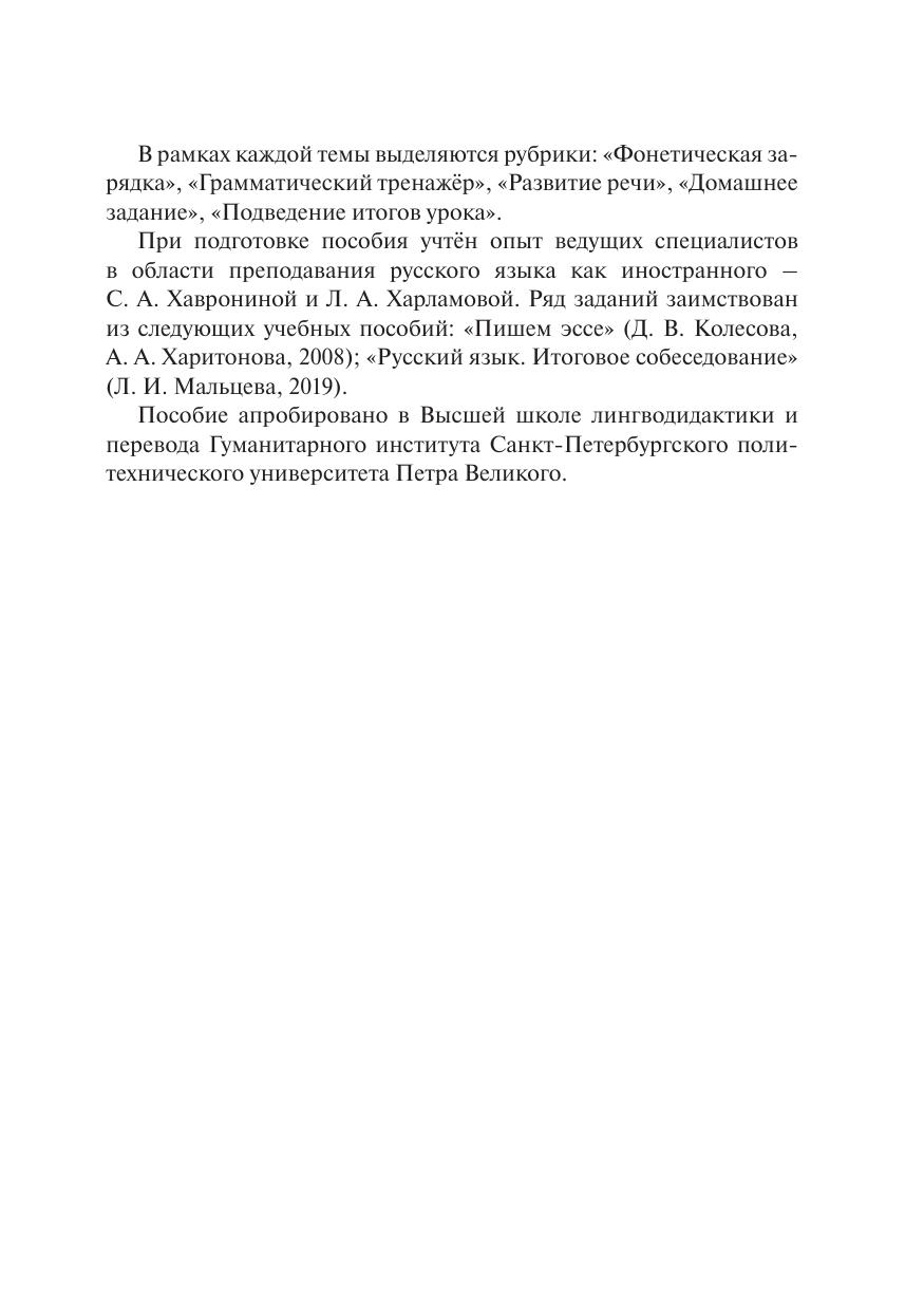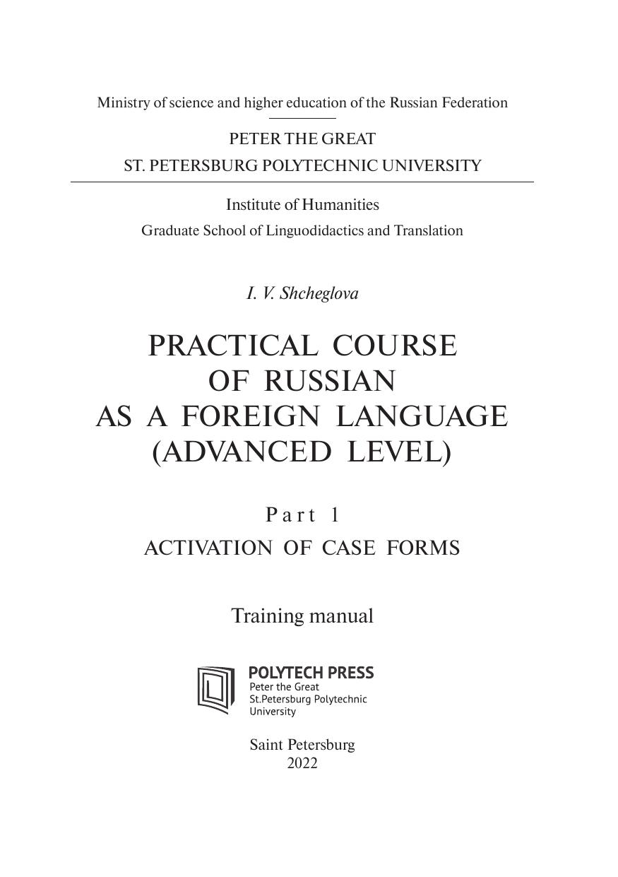 Учебное пособие нацелено на развитие устной и письменной речи и систематизацию знаний о предложно-падежной системе языка. Может использоваться как для занятий в аудитории под руководством преподавателя, так и для самостоятельного изучения языка. Предназначено для широкого круга лиц, изучающих русский язык как иностранный на продвинутом этапе обучения.