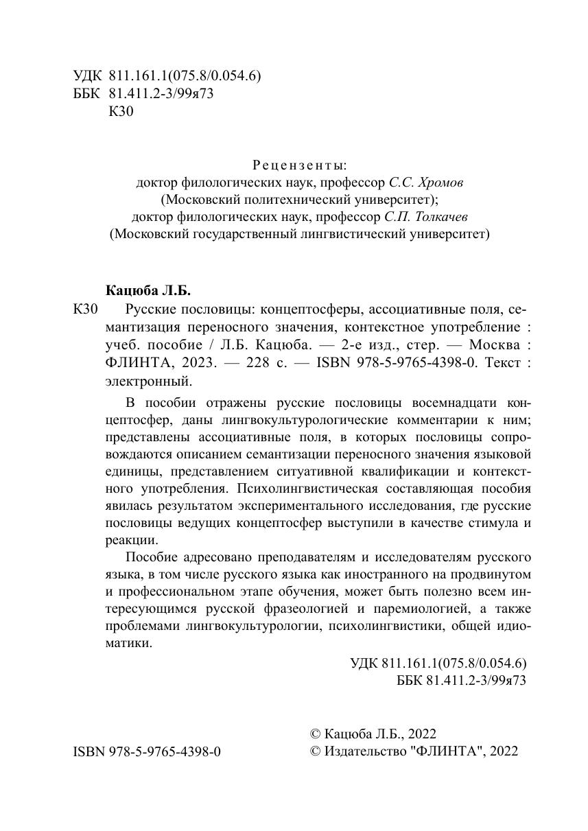 Пособие адресовано преподавателям и исследователям русского языка, в том числе русского языка как иностранного на продвинутом и профессиональном этапе обучения, может быть полезно всем интересующимся русской фразеологией и паремиологией, а также проблемами лингвокультурологии, психолингвистики, общей идиоматики.