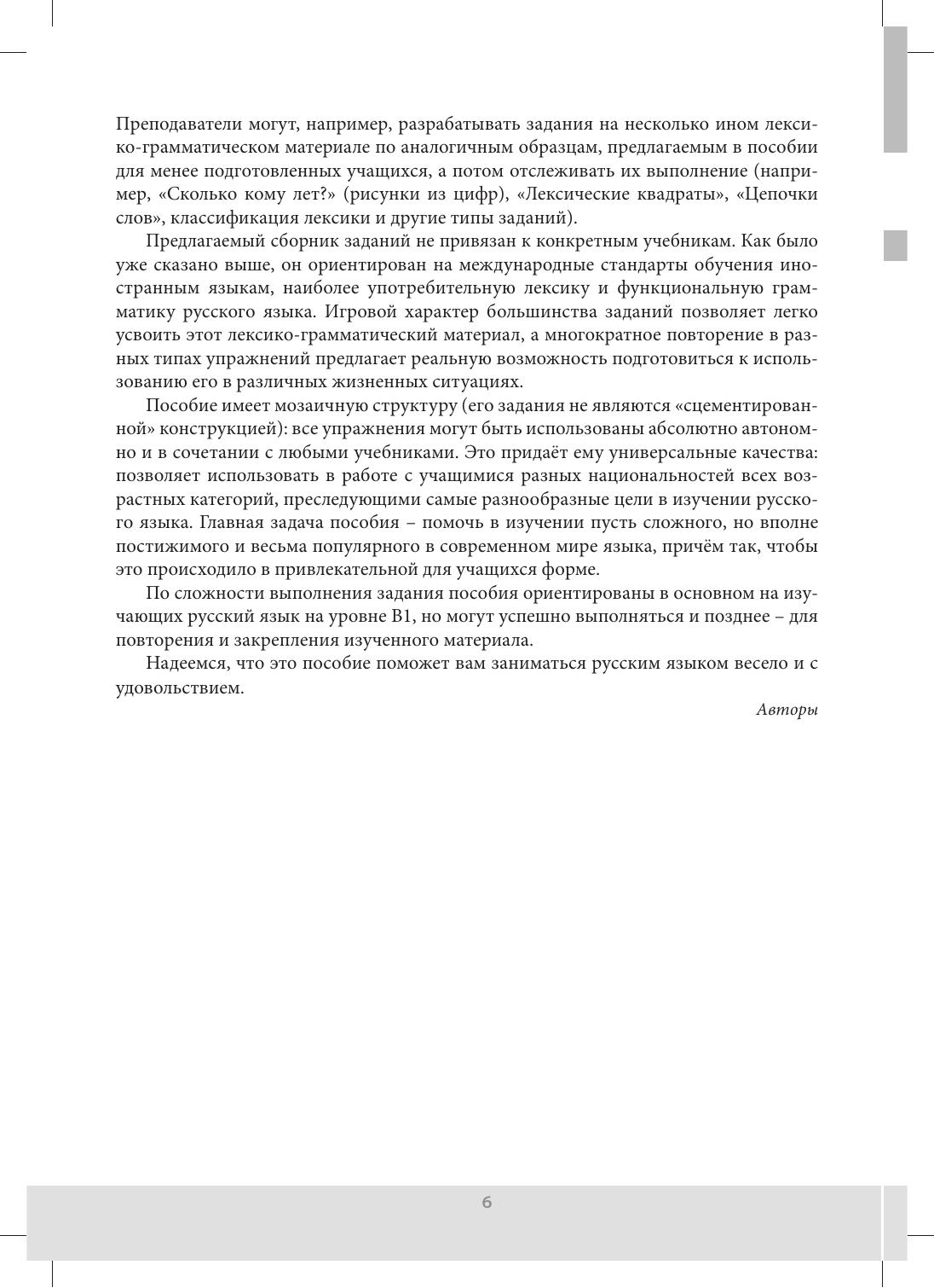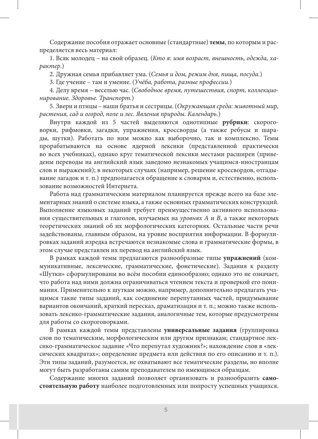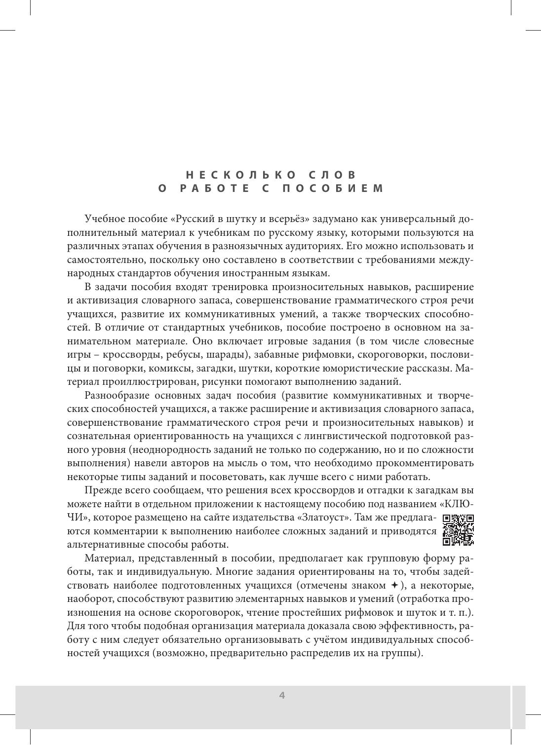 В задачи пособия входят тренировка произносительных навыков, расширение и активизация словарного запаса, совершенствование грамматического строя речи учащихся, развитие их коммуникативных умений, а также творческих способностей. В отличие отстандартных учебников, пособие построено в основном на занимательном материале. Оно включает игровые задания (в том числе словесные игры — кроссворды, ребусы, шарады), забавные рифмовки, скороговорки, пословицы и поговорки, комиксы, загадки, шутки, короткие юмористические рассказы. Материал проиллюстрирован, рисунки помогают выполнению заданий. По сложности выполнения задания пособия ориентированы в основном на изучающих русский язык на уровне В1, но могут успешно выполняться и позднее — для повторения и закрепления изученного материала.