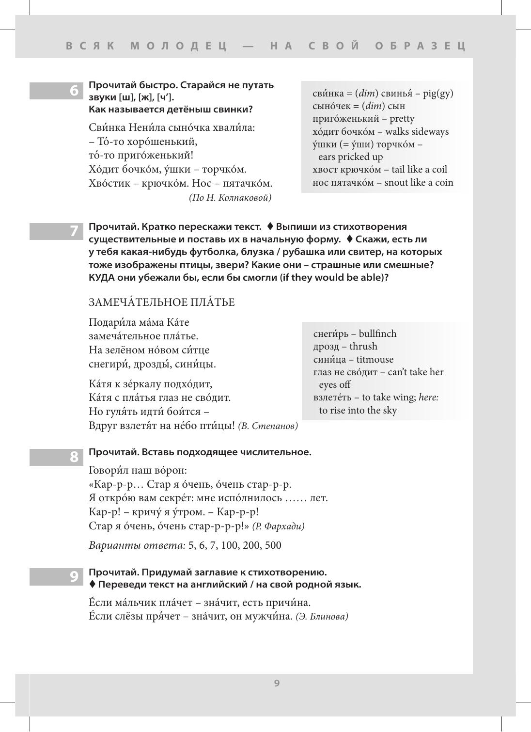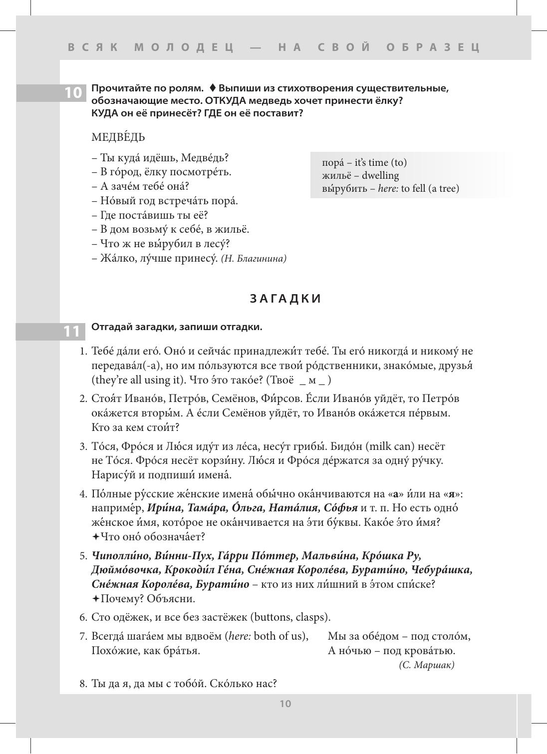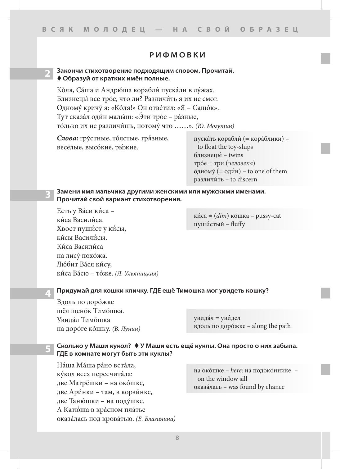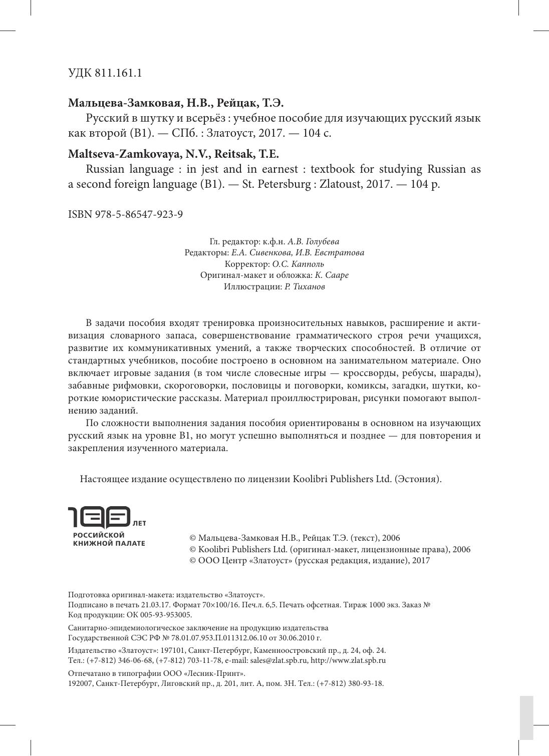В задачи пособия входят тренировка произносительных навыков, расширение и активизация словарного запаса, совершенствование грамматического строя речи учащихся, развитие их коммуникативных умений, а также творческих способностей. В отличие отстандартных учебников, пособие построено в основном на занимательном материале. Оно включает игровые задания (в том числе словесные игры — кроссворды, ребусы, шарады), забавные рифмовки, скороговорки, пословицы и поговорки, комиксы, загадки, шутки, короткие юмористические рассказы. Материал проиллюстрирован, рисунки помогают выполнению заданий. По сложности выполнения задания пособия ориентированы в основном на изучающих русский язык на уровне В1, но могут успешно выполняться и позднее — для повторения и закрепления изученного материала.