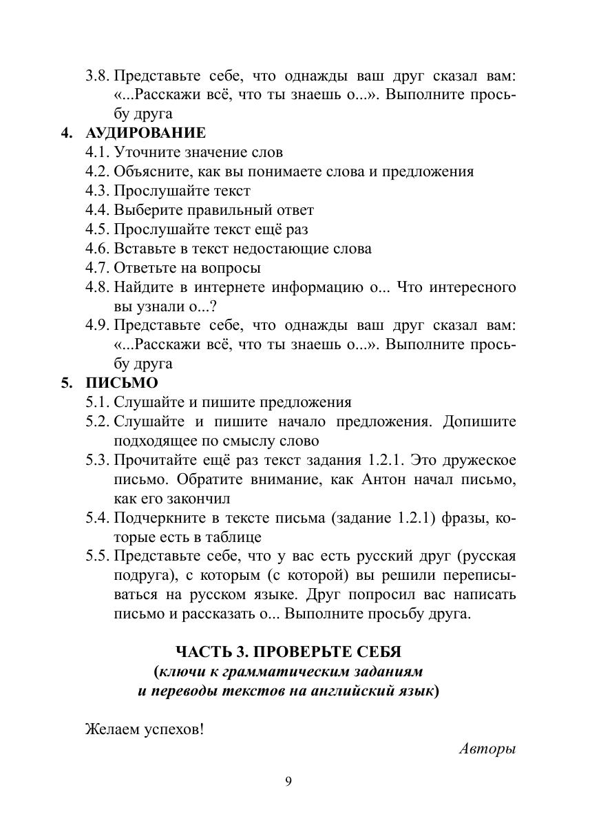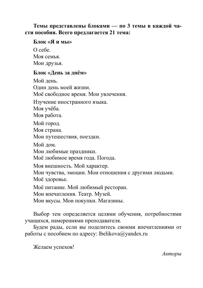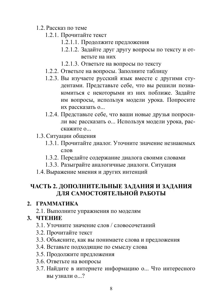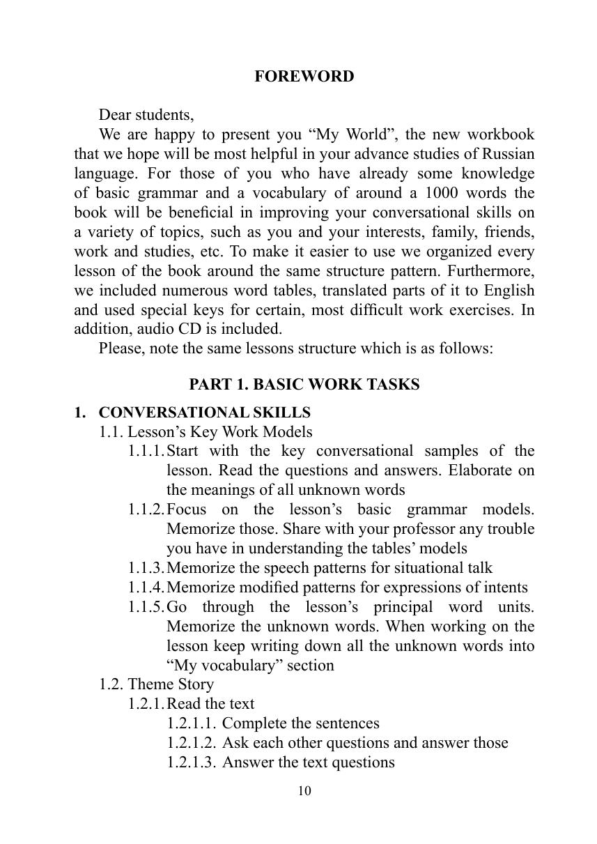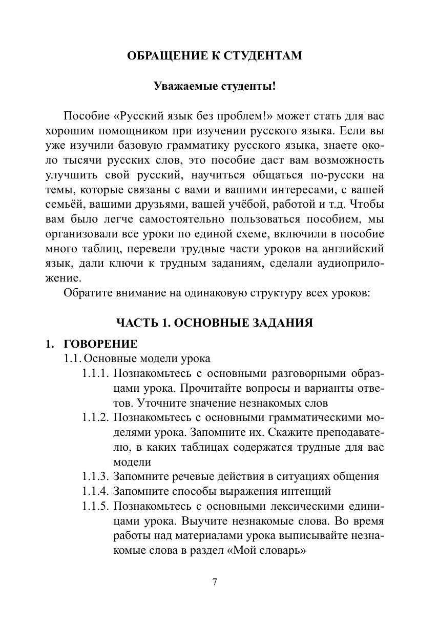 Основная цель пособия — развитие коммуникативной компетенции иностранных учащихся в области русской устной речи путём взаимосвязанного обучения всем видам речевой деятельности, актуализации доминантных для каждой темы грамматических моделей, особой организации учебного материала. Траектория развития КК — от базового уровня владения РКИ (А2) к первому (В1). Темы построены по единому сценарию, в них представлено большое количество вопросно-ответных единств, текстов, служащих образцом для создания самостоятельного высказывания в предлагаемых ситуациях речевого общения. Тексты для чтения и аудирования основаны на культурно значимом для носителей языка материале и отражают общекультурные ценности, доступные для восприятия на указанном уровне. Благодаря особой организации учебного материала пособие предоставляет иностранным учащимся возможность приобрести опыт речевого общения на русском языке как под руководством преподавателя, так и самостоятельно; как в условиях языковой среды, так и вне её. В пособии есть ключи к грамматическим заданиям и заданиям на аудирование, переводы текстов и других материалов на английский язык.