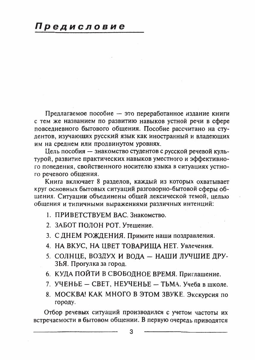 Пособие представляет собой курс по развитию устной русской речи в сфере повседневного общения с учетом коммуникативного принципа. Цель пособия – выработка адекватного речевого пове-дения в ситуациях устного обиходно-бытового общения. Обучение строится на проигрывании ситуаций в условиях, приближенных к естественным, и включает темы: встреча, знакомство, сфера бытового обслуживания, город, экскурсии, в гостях, увлечения, учеба, погода, спорт, здоровье, театр, музыка, кино, друзья, расставания.