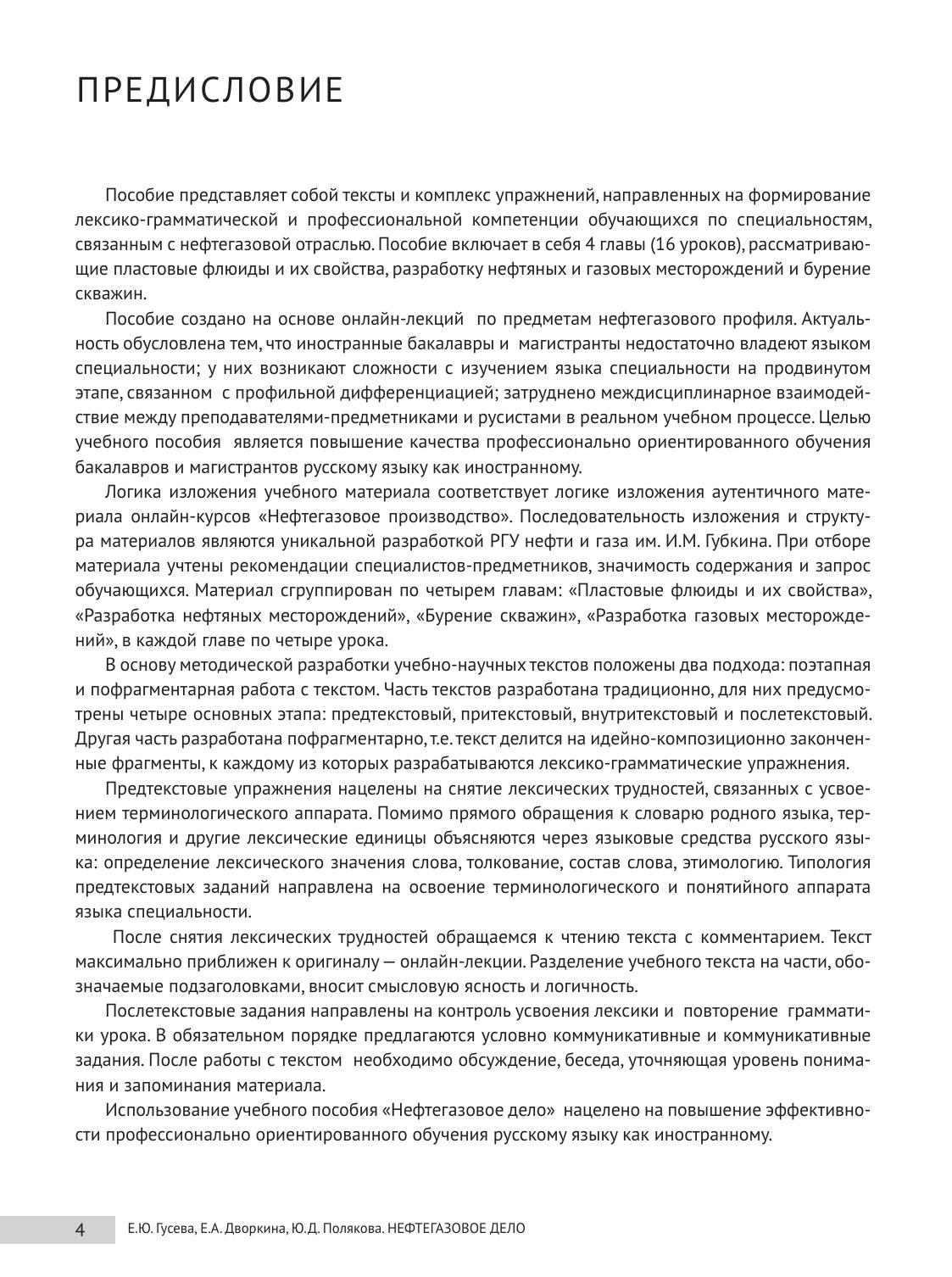 Настоящее издание предназначено для бакалавров и магистрантов, обучающихся в университетах на факультетах, связанных с нефтегазовой отраслью. Пособие рассчитано на подготовку по русскому языку на уровне В1 (ТРКИ-1). Пособие составляют тексты по специальностям нефтегазового профиля. В качестве источника использованы лекции по разработке и бурению нефтяных и газовых скважин,а также по свойствам углеводородных флюидов. Предполагается ознакомление с особенностями научного стиля в его письменной и устной разновидностях, общенаучной лексикой, основными синтаксическими моделями, характерными для языка науки, и формирование языковых и профессиональных компетенций.