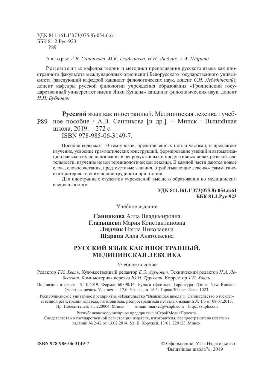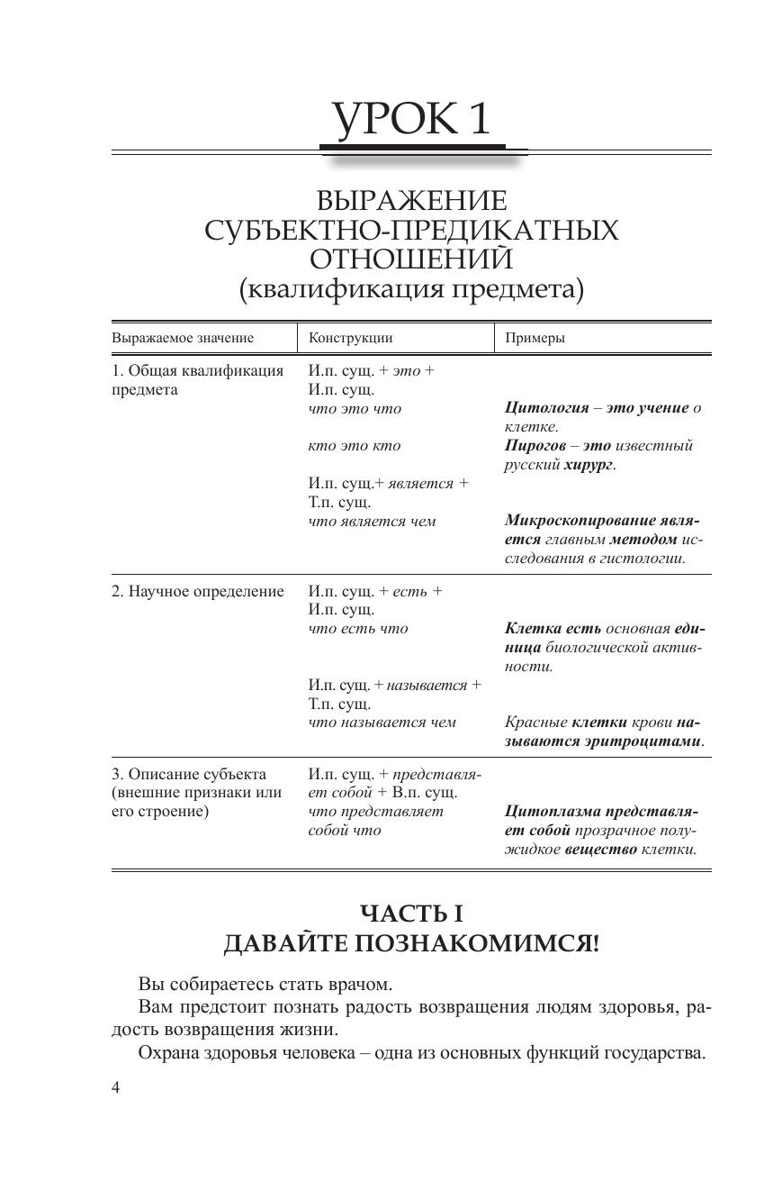 Пособие содержит 10 тем-уроков, представленных пятью частями, и предлагает изучение, усвоение грамматических конструкций, формирование умений и автоматизацию навыков их использования в репродуктивных и продуктивных видах речевой деятельности, изучение новой терминологической лексики. В каждой части даются новые слова, словосочетания, предтекстовые задания, отрабатывающие лексико-грамматический материал и снимающие трудности при чтении. Для иностранных студентов учреждений высшего образования по медицинским специальностям.