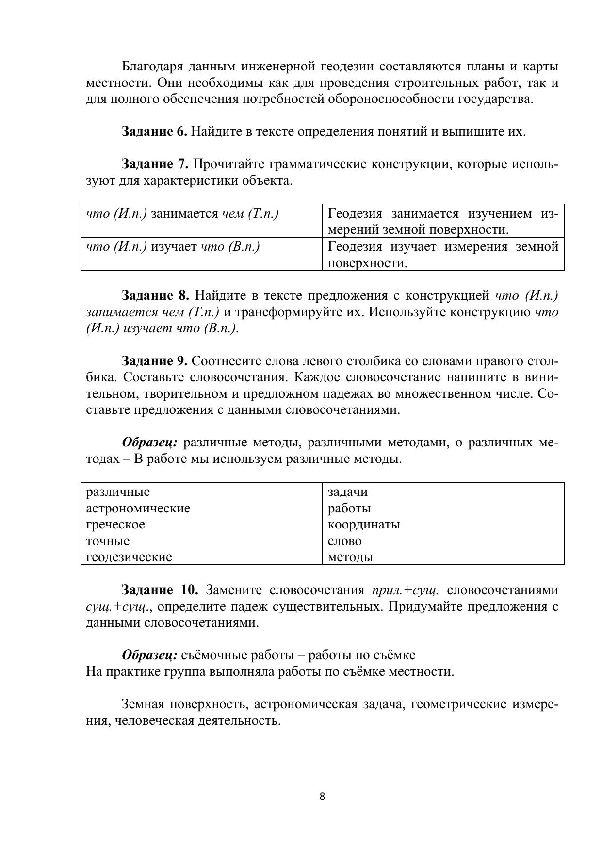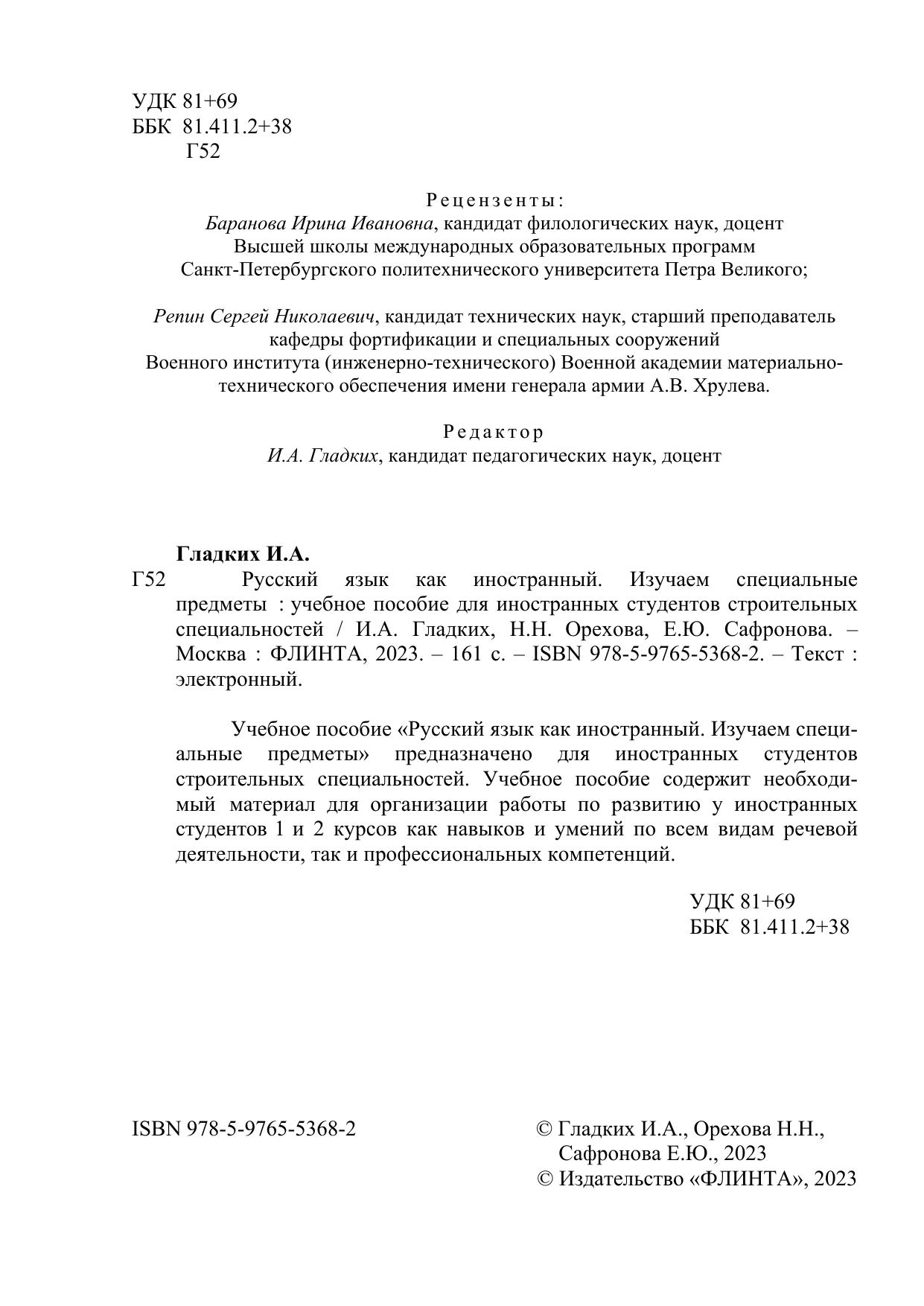Учебное пособие «Русский язык как иностранный. Изучаем специальные предметы» предназначено для иностранных студентов строительных специальностей. Учебное пособие содержит необходимый материал для организации работы по развитию у иностранных студентов 1 и 2 курсов как навыков и умений по всем видам речевой деятельности, так и профессиональных компетенций.