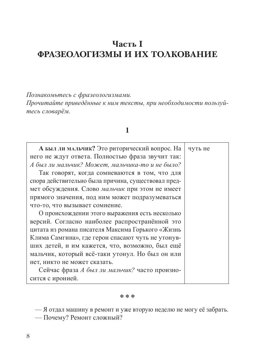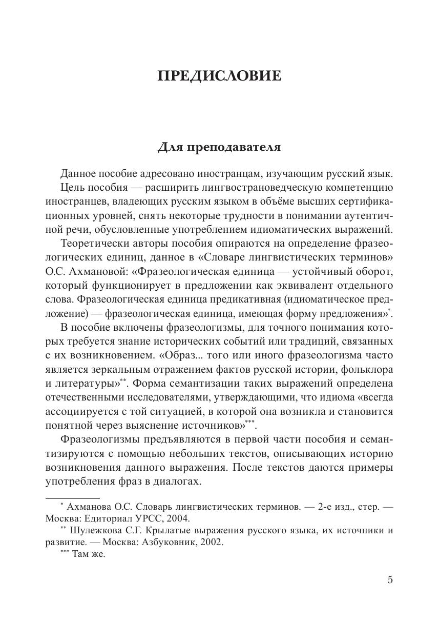 Цель пособия — развить навыки разговорной речи, снять некоторые трудности в понимании речи носителей русского языка, обусловленные употреблением идиоматических выражений и фраз, включающих паремиологические трансформации фразеологизмов. Пособие содержит небольшие тексты, описывающие историю возникновения фразеологизмов и интересные факты, связанные с их употреблением. После текстов даются примеры употребления фраз в реальном общении. В контрольно-тренировочной части пособия предлагаются задания на включение в речь фразеологических выражений или использование их для трансформации выделенной части текста. Особую группу представляют задания, где учащиеся встречаются с паремиологическими трансформациями. Все задания пособия снабжены ключами, что даёт возможность учащимся работать самостоятельно. Данное пособие адресовано иностранным учащимся, чьё владение русским языком соответствует сертификационному уровню В2—С1.