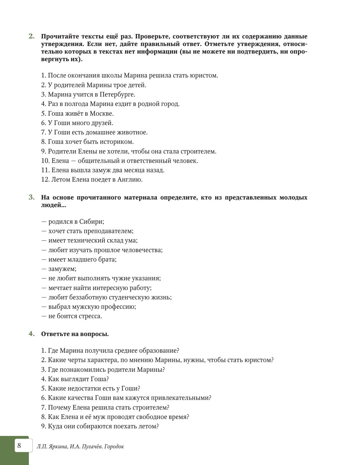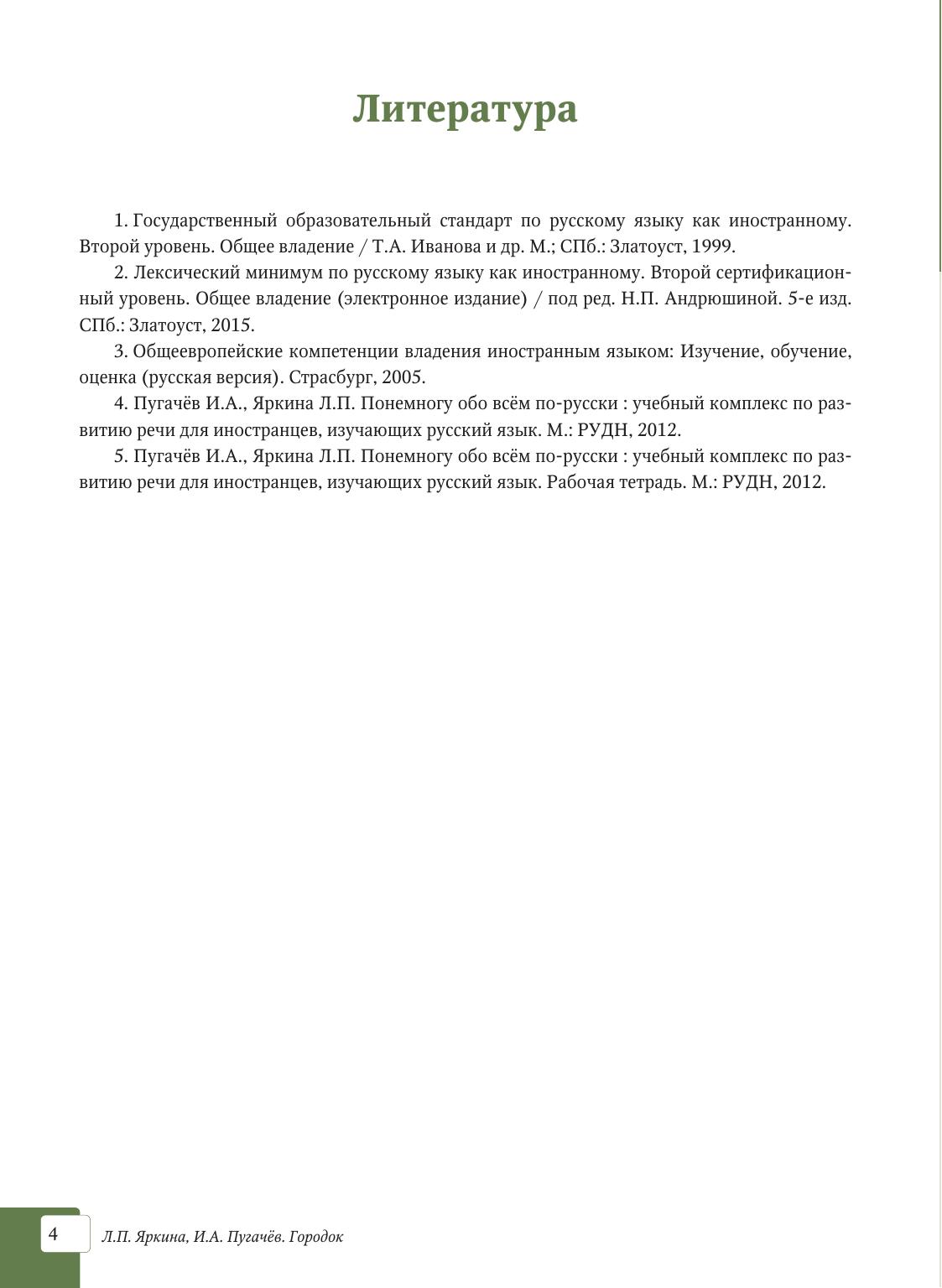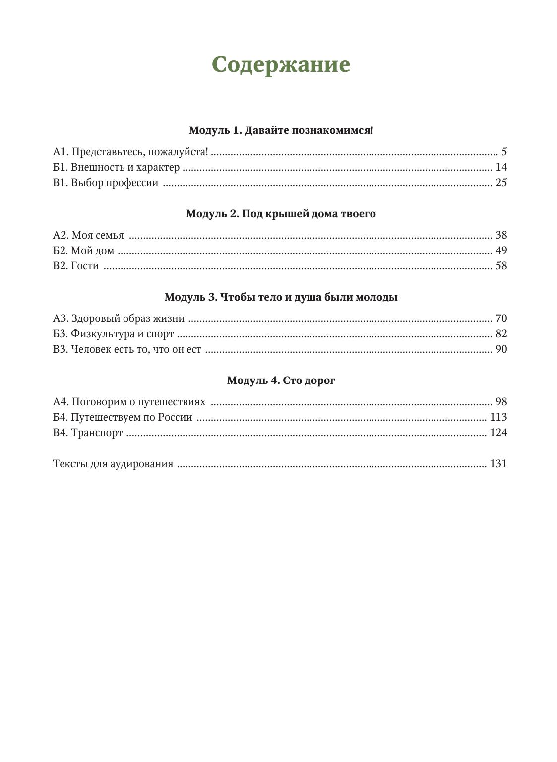 Пособие представляет собой первую ступень на пути к достижению коммуникативной компетенции уровня ТРКИ-2. Разделы книги построены по тематическому принципу и носят модульный характер, допускающий любую последовательность их использования в учебном процессе. Входящие в модули блоки включают задания, направленные на развитие восприятия и понимания аутентичных текстов в рамках изучаемых на этом уровне тем. Существенное место отведено коррекции грамматических навыков, а также расширению лексического запаса учащихся. Подготовлено на кафедре русского языка № 4 Института русского языка РУДН. Издание предназначено для работы в аудитории с преподавателем.