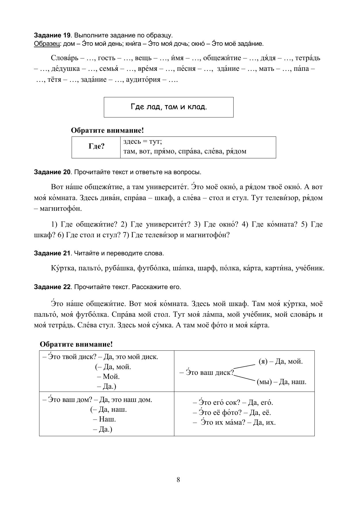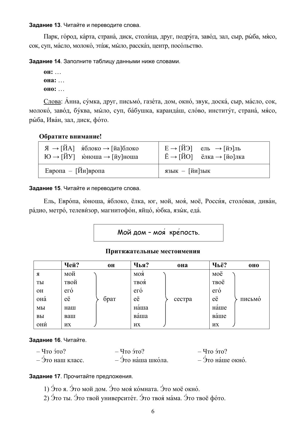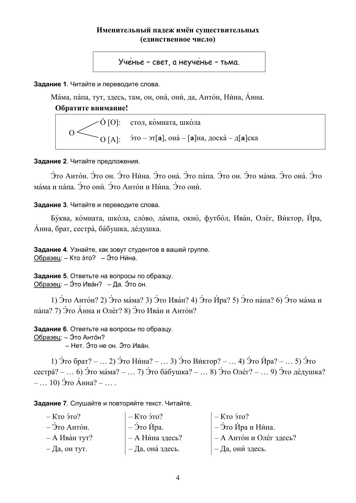 Предлагаемое пособие включает грамматические таблицы, речевые образцы, разнообразные упражнения и учебные тексты. В пособие включены русские пословицы и поговорки в соответствии с грамматическими темами. Цель пособия – выработка, развитие и закрепление, прочных навыков и умений говорения, чтения и письма у слушателей подготовительного отделения. Пособие имеет учебно-практическую направленность и является дополнением к любому начальному курсу русского языка как иностранного. Для иностранных слушателей подготовительных факультетов вузов России, а также лиц, изучающих русский язык на курсах или самостоятельно.