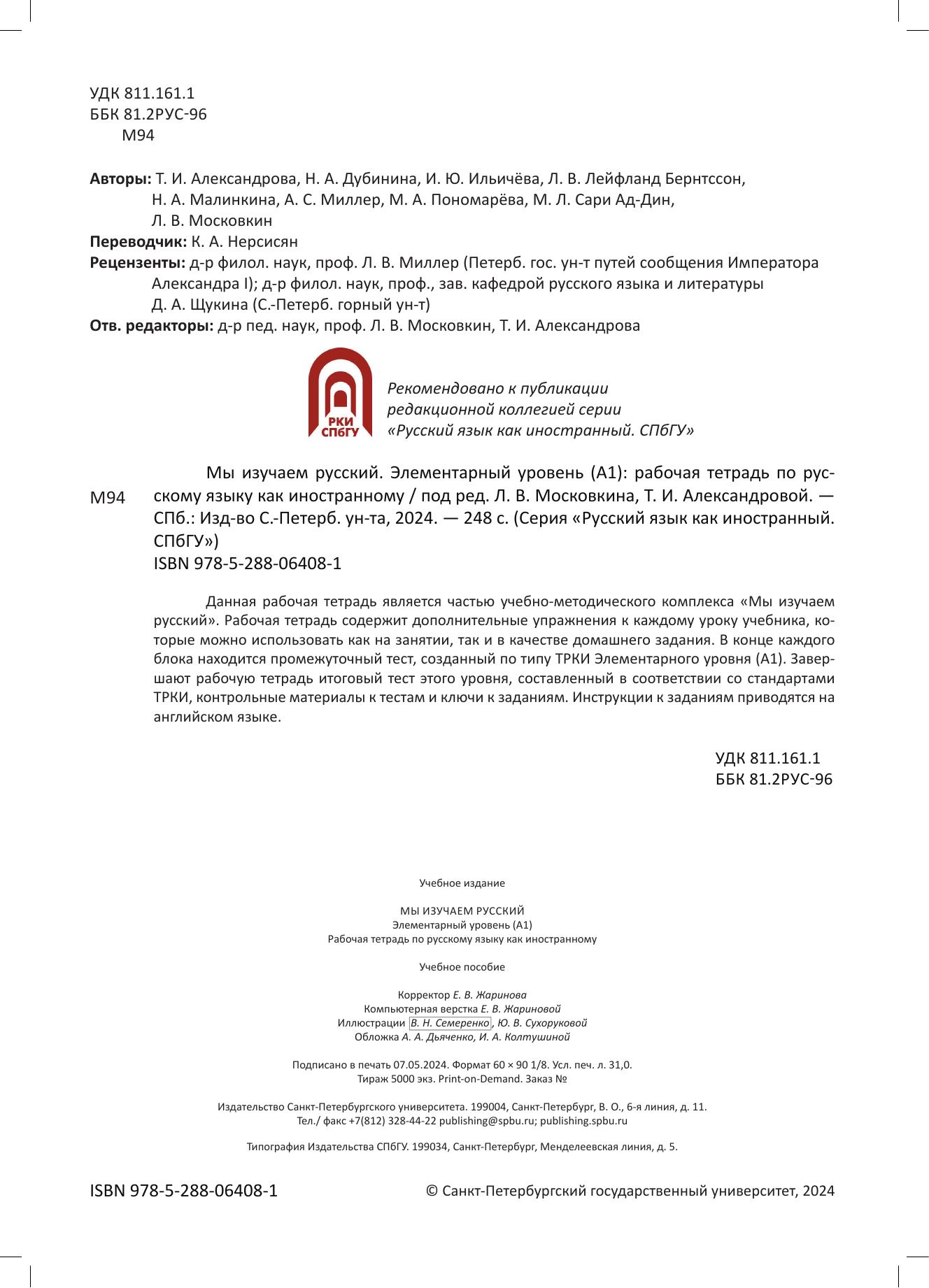 Данная рабочая тетрадь является частью учебно-методического комплекса "Мы изучаем русский". Рабочая тетрадь содержит дополнительные упражнения к каждому уроку учебника, которые можно использовать как на занятии, так и в качестве домашнего задания. В конце каждого блока находится промежуточный тест, созданный по типу ТРКИ Элементарного уровня (Ф1). Завершают рабочую тетрадь итоговый тест этого уровня, составленный в соответствии со стандартами ТРКИ, контрольные материалы к текстам и ключи к заданиям. Инструкции к заданиям приводятся на английском языке.