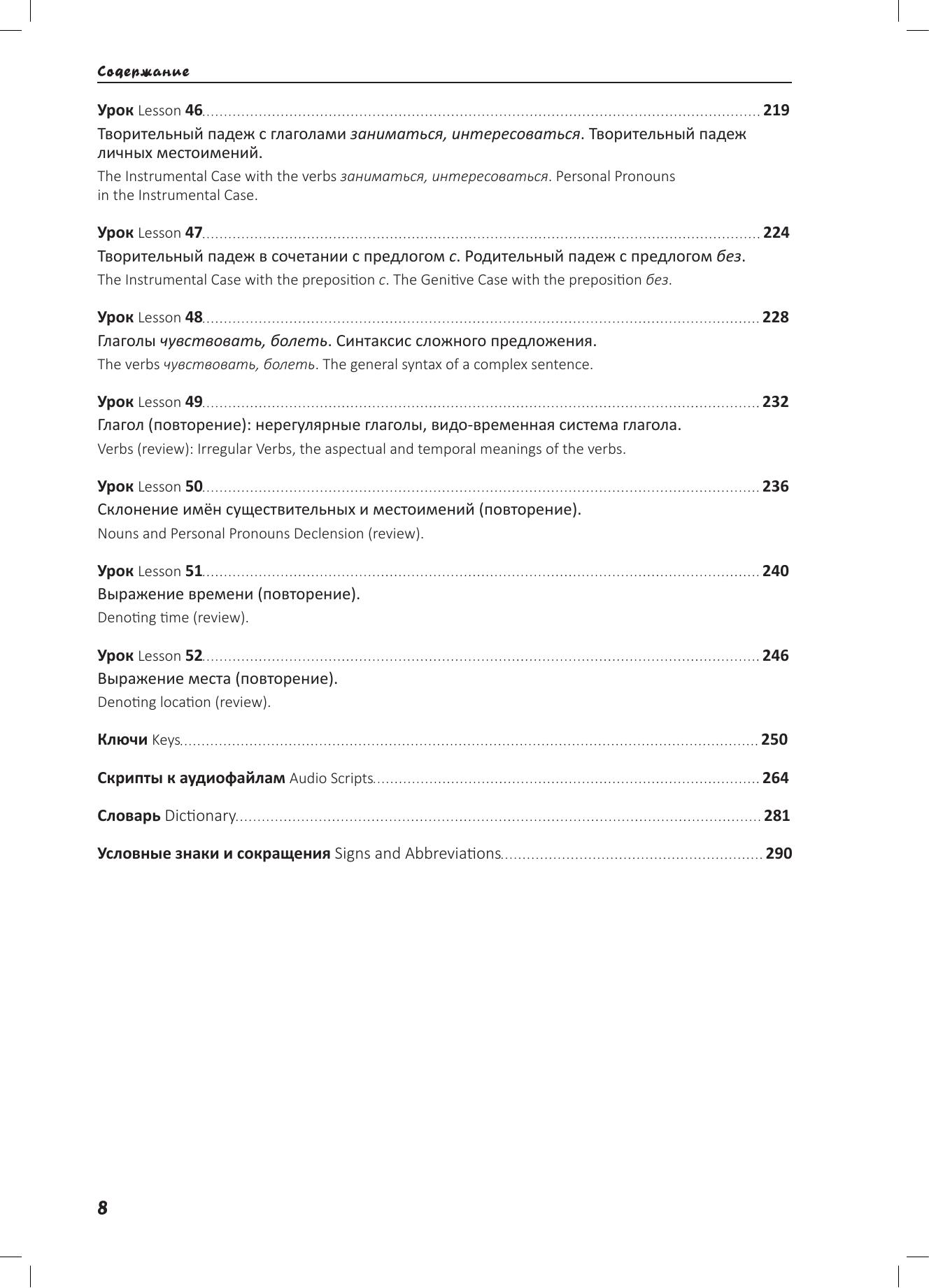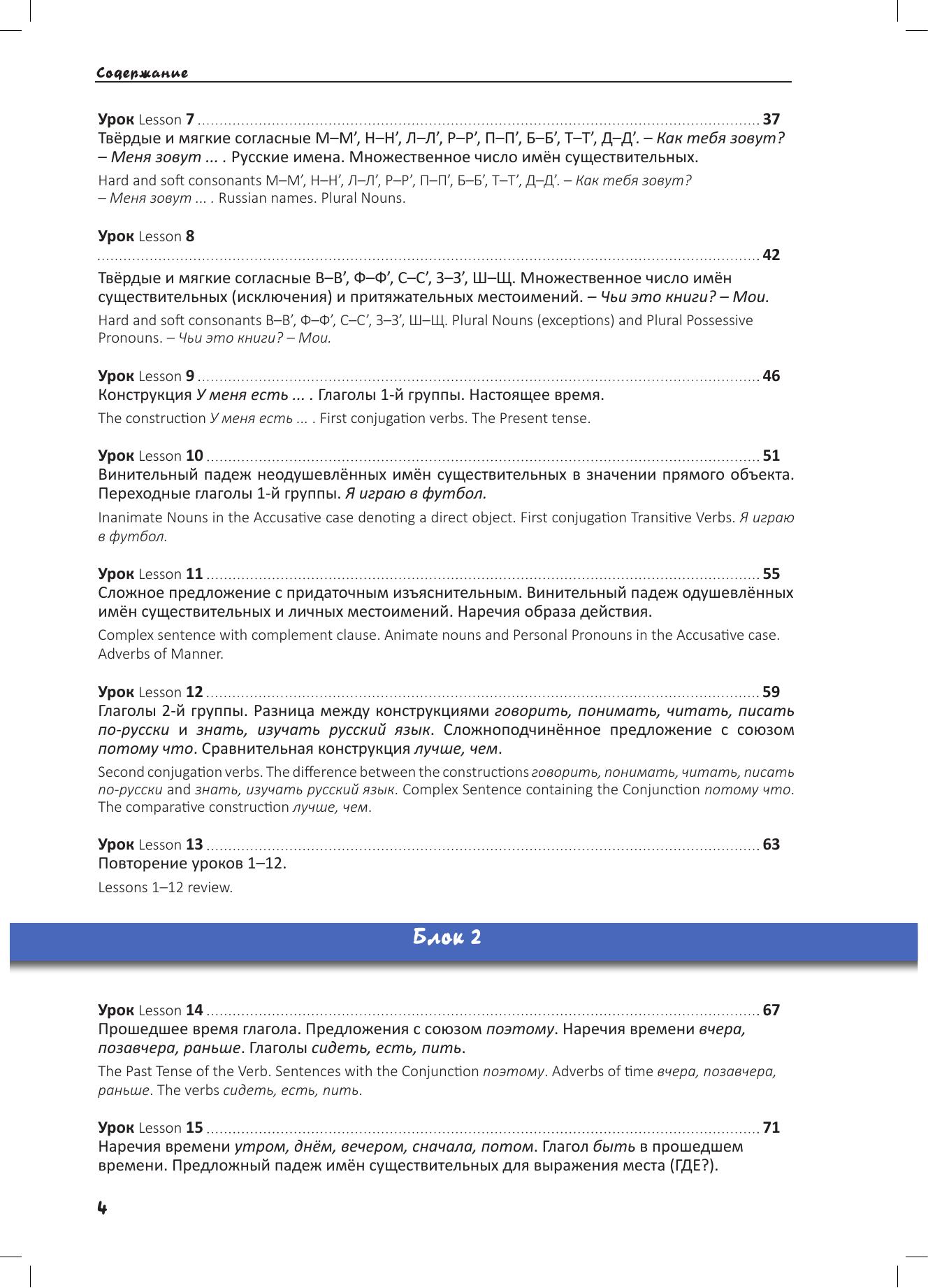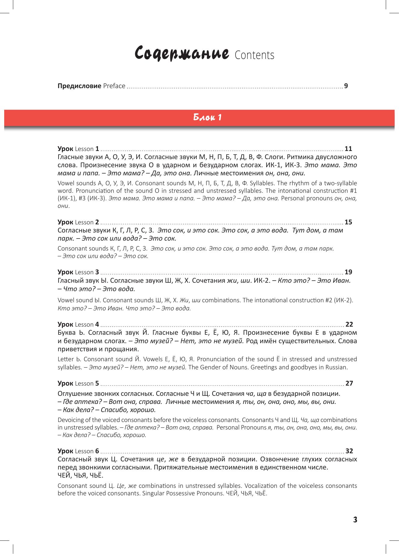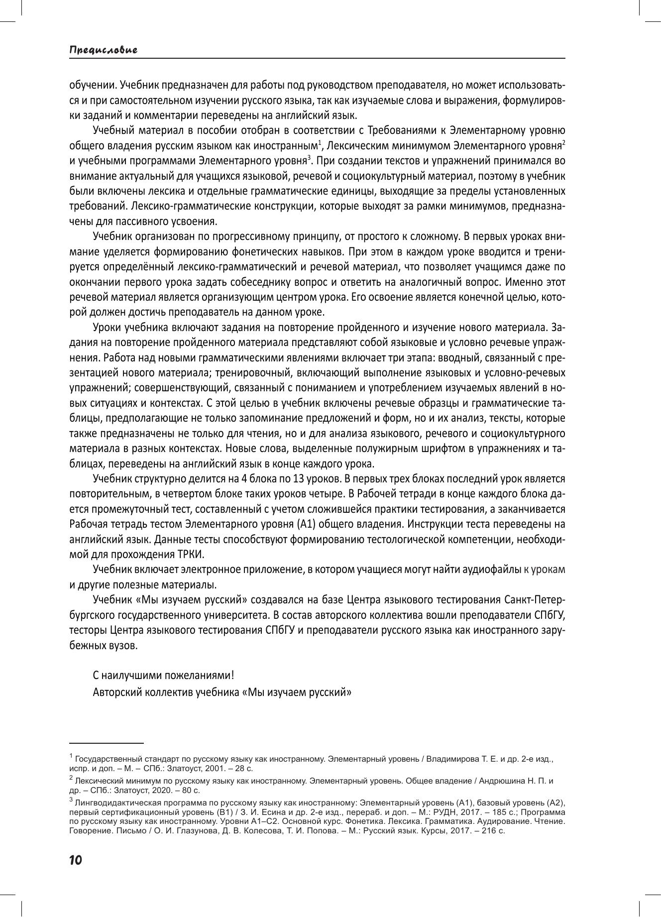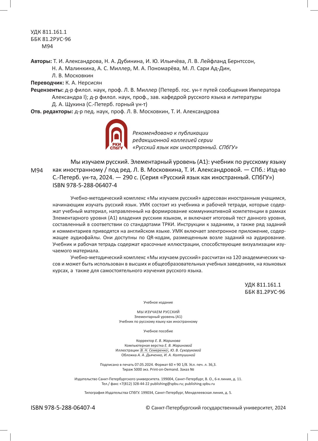 Учебно-методический комплекс "Мы изучаем русский" адресован иностранным учащимся, начинающим изучать русский язык. УМК состоит из учебника и рабочей тетради, которые содержат учебный материал, направленный на формирование коммуникативной компетенции в рамках Элементарного уровня (А1) владения русским языком, и включает итоговый тест данного уровня, составленный в соответствии со стандартами ТРКИ. Инструкции к заданиям, а также ряд заданий и комментариев приводятся на английском языке. УМК включает электронное5 приложение, содержащее аудиофайлы. Они доступны по QR-кодам, размещенным возле заданий на аудирование. Учебник и рабочая тетрадь содержат красочные иллюстрации, способствующие визуализации изучаемого материала. Учебно-методический комплекс "Мы изучаем русский" рассчитан на 120 академических часов и может быть использован в высших и общеобразовательных учебных заведениях, на языковых курсах, а также для самостоятельного изучения русского языка.