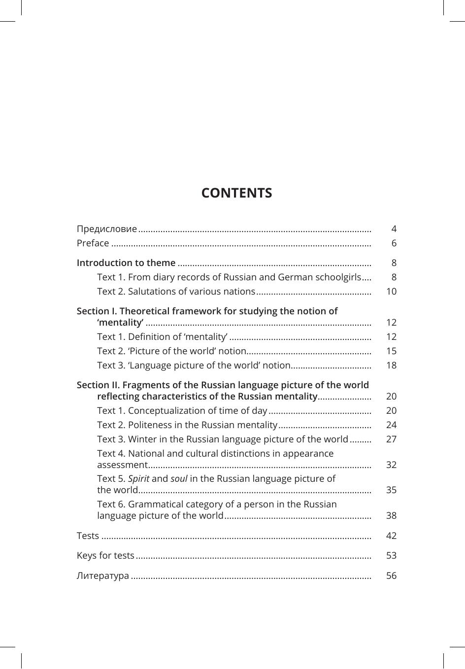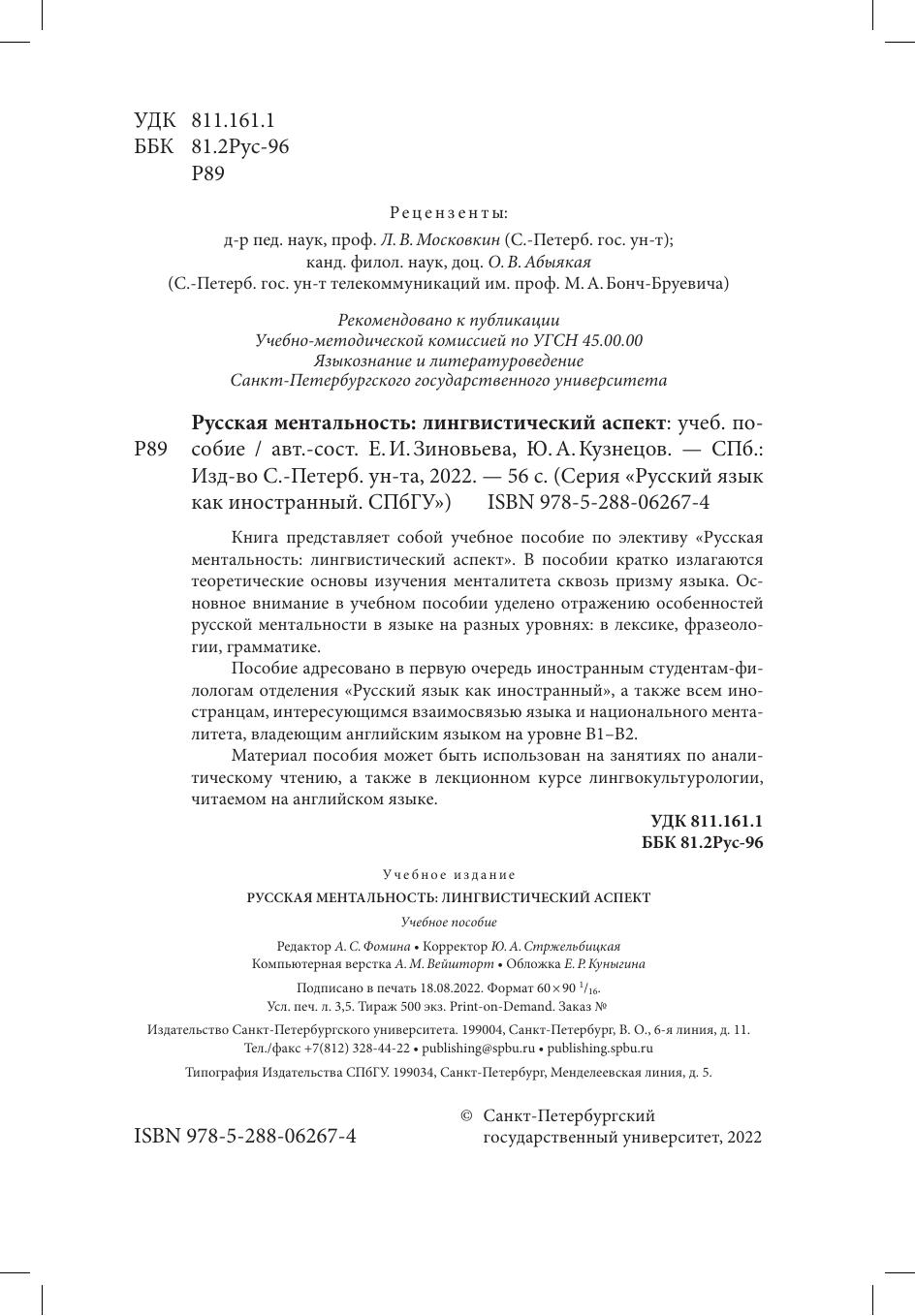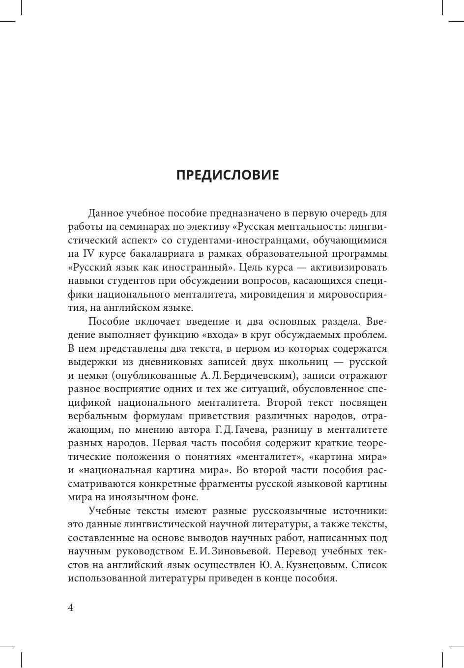 Книга представляет собой учебное пособие по элективу "Русская ментальность: лингвистический аспект". В пособии кратко излагаются теоретические основы изучения менталитета сквозь призму языка. Основное внимание у учебном пособии уделено отражению особенностей русской ментальности в языке на разных уровнях: в лексике, фразеологии, грамматике. Пособие адресовано в первую очередь иностранным студентам-филологам отделения "Русский язык как иностранный", а также всем иностранцам интересующимся взаимосвязью языка и национального менталитета, владеющим английским языком на уровне В1-В2. материал пособия может быть использован на занятиях по аналитическому чтению, а также в лекционном курсе лингвокультурологии, читаемом на английском языке.