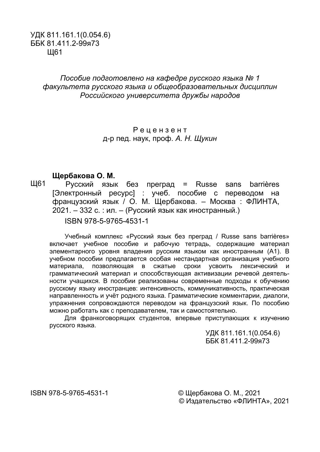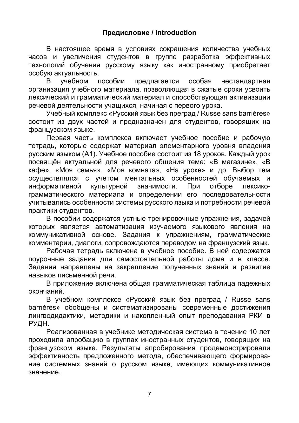 Учебный комплекс «Русский язык без преград / Russe sans barrières» включает учебное пособие и рабочую тетрадь, содержащие материал элементарного уровня владения русским языком как иностранным (А1). В учебном пособии предлагается особая нестандартная организация учебного материала, позволяющая в сжатые сроки усвоить лексический и грамматический материал и способствующая активизации речевой деятельности учащихся. В пособии реализованы современные подходы к обучению русскому языку иностранцев: интенсивность, коммуникативность, практическая направленность и учёт родного языка. Грамматические комментарии, диалоги, упражнения сопровождаются переводом на французский язык. По пособию можно работать как с преподавателем, так и самостоятельно.