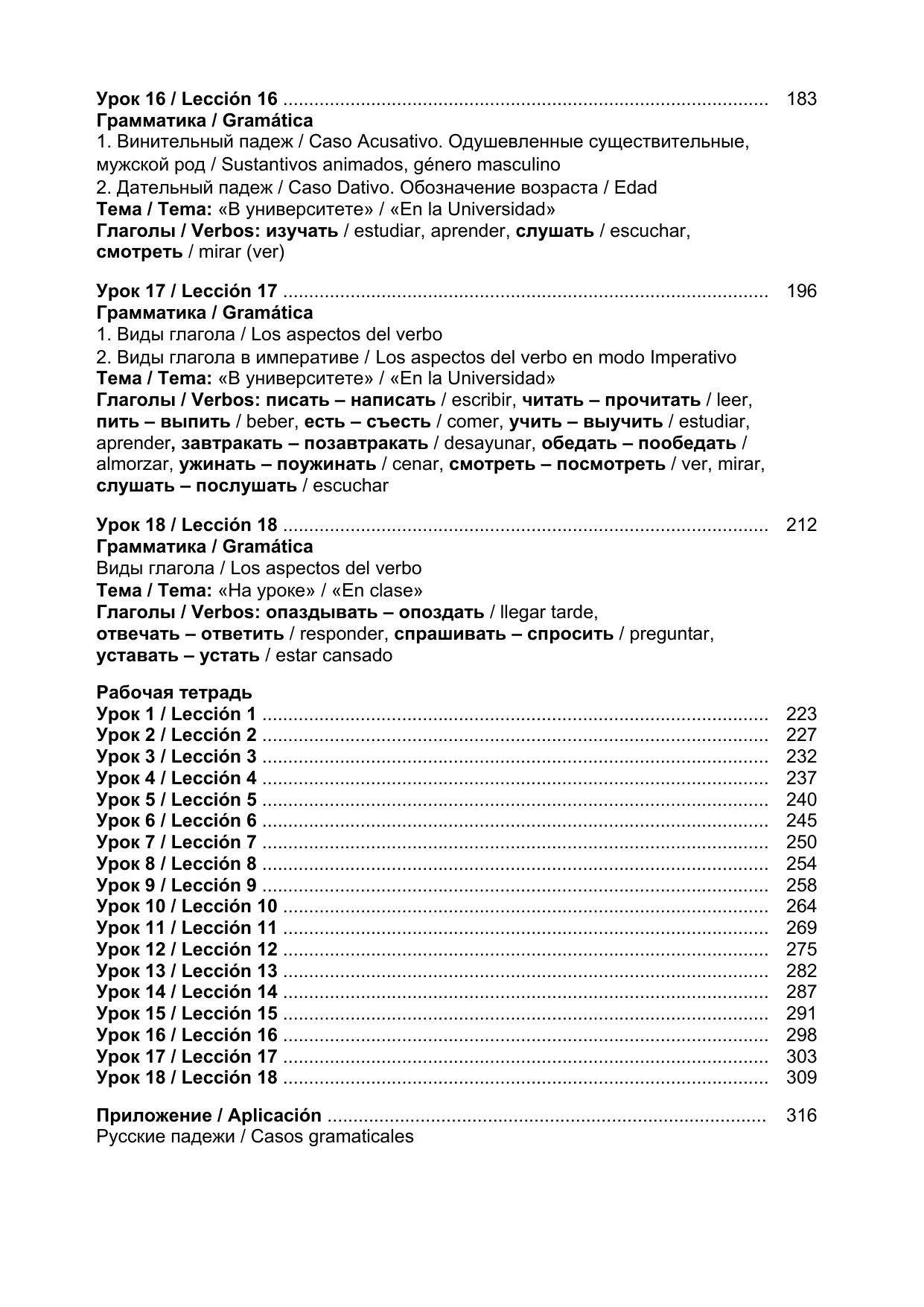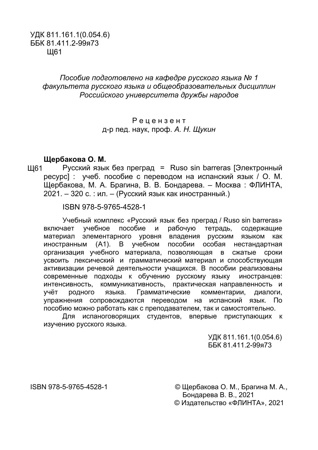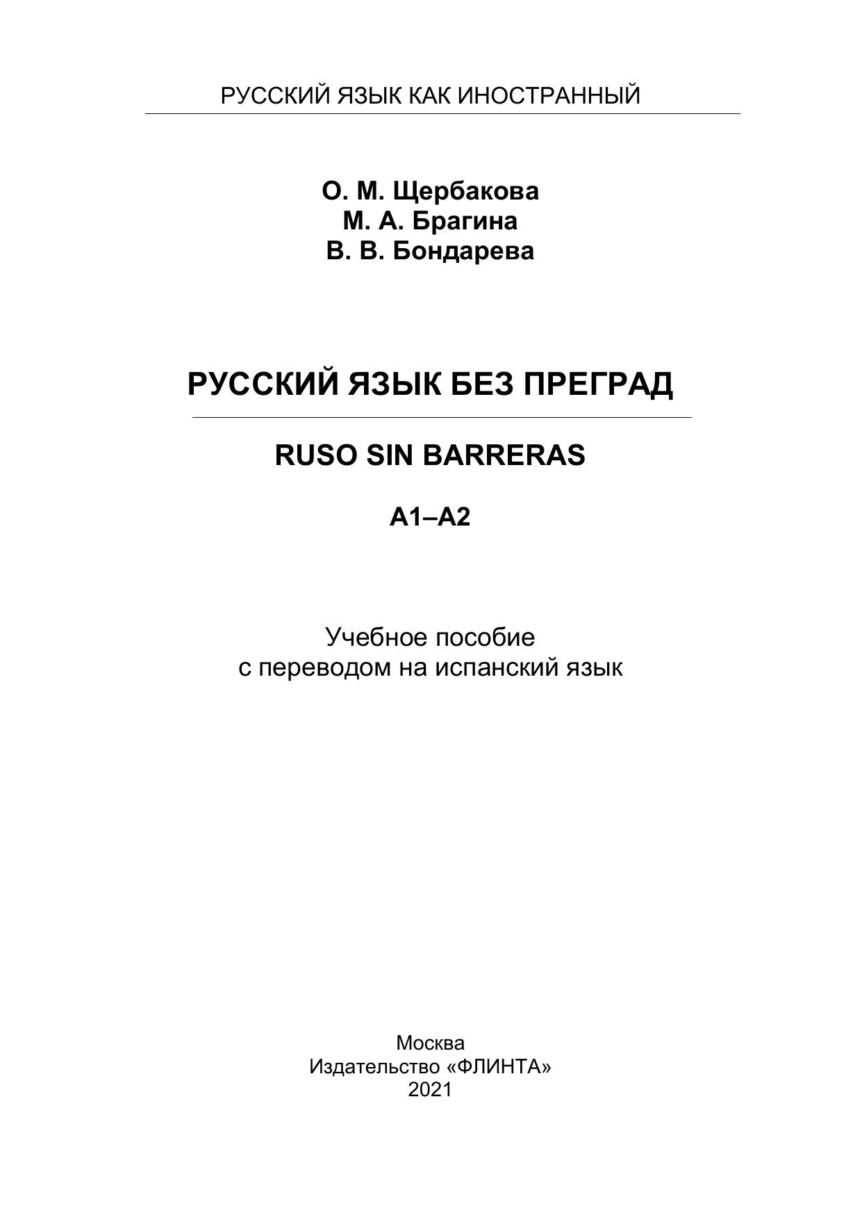 Учебный комплекс «Русский язык без преград / Ruso sin barreras» включает учебное пособие и рабочую тетрадь, содержащие материал элементарного уровня владения русским языком как иностранным (А1). В учебном пособии особая нестандартная организация учебного материала, позволяющая в сжатые сроки усвоить лексический и грамматический материал и способствующая активизации речевой деятельности учащихся. В пособии реализованы современные подходы к обучению русскому языку иностранцев: интенсивность, коммуникативность, практическая направленность и учёт родного языка. Грамматические комментарии, диалоги, упражнения сопровождаются переводом на испанский язык. По пособию можно работать как с преподавателем, так и самостоятельно.