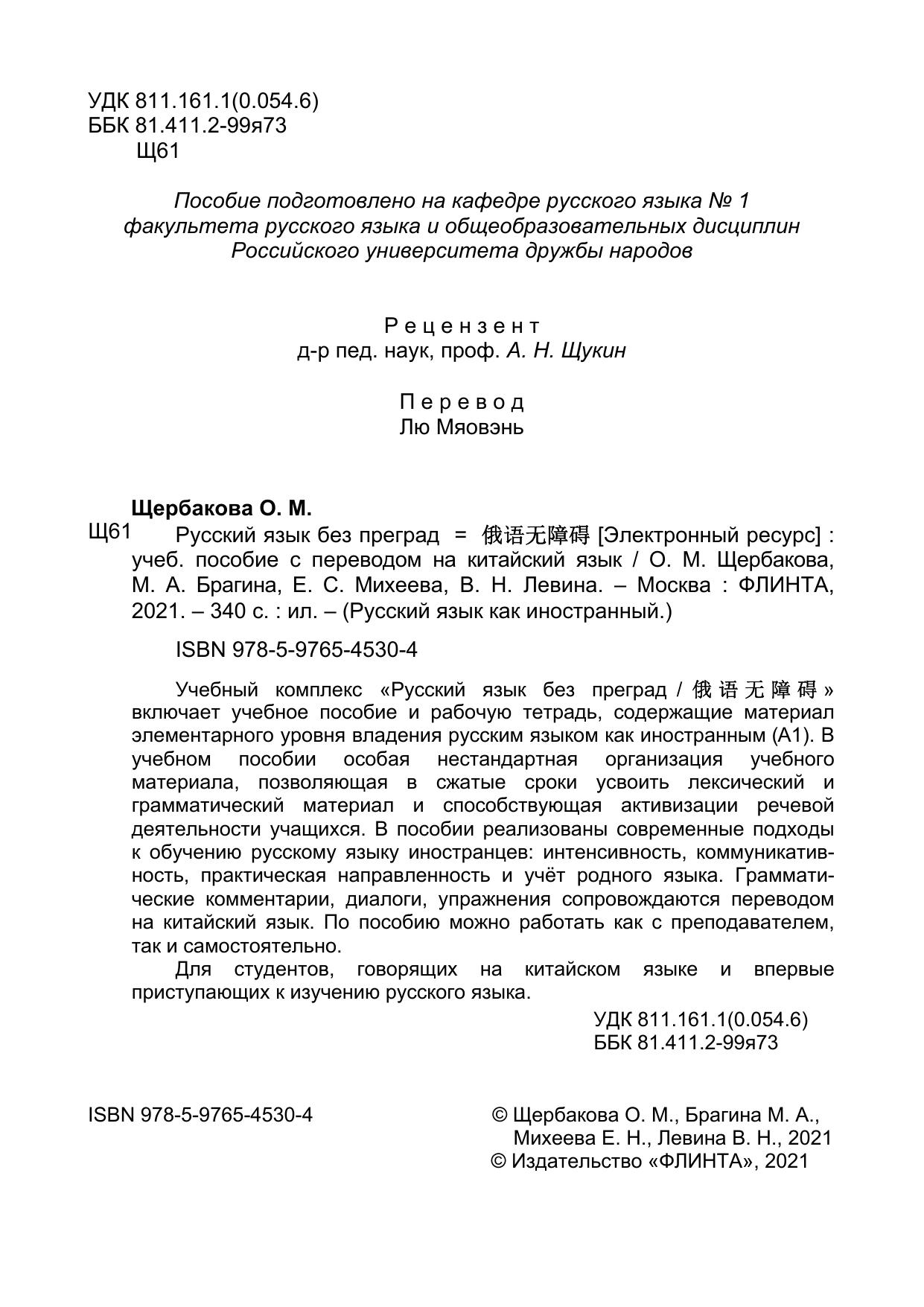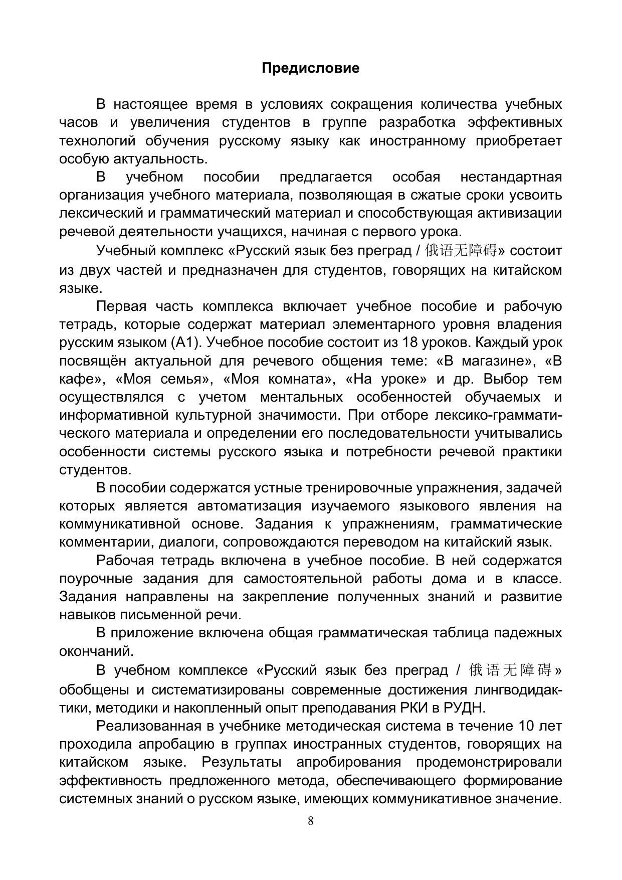 Учебный комплекс «Русский язык без преград / 俄语无障碍» включает учебное пособие и рабочую тетрадь, содержащие материал элементарного уровня владения русским языком как иностранным (А1). В учебном пособии особая нестандартная организация учебного материала, позволяющая в сжатые сроки усвоить лексический и грамматический материал и способствующая активизации речевой деятельности учащихся. В пособии реализованы современные подходы к обучению русскому языку иностранцев: интенсивность, коммуникативность, практическая направленность и учёт родного языка. Грамматические комментарии, диалоги, упражнения сопровождаются переводом на китайский язык. По пособию можно работать как с преподавателем, так и самостоятельно.