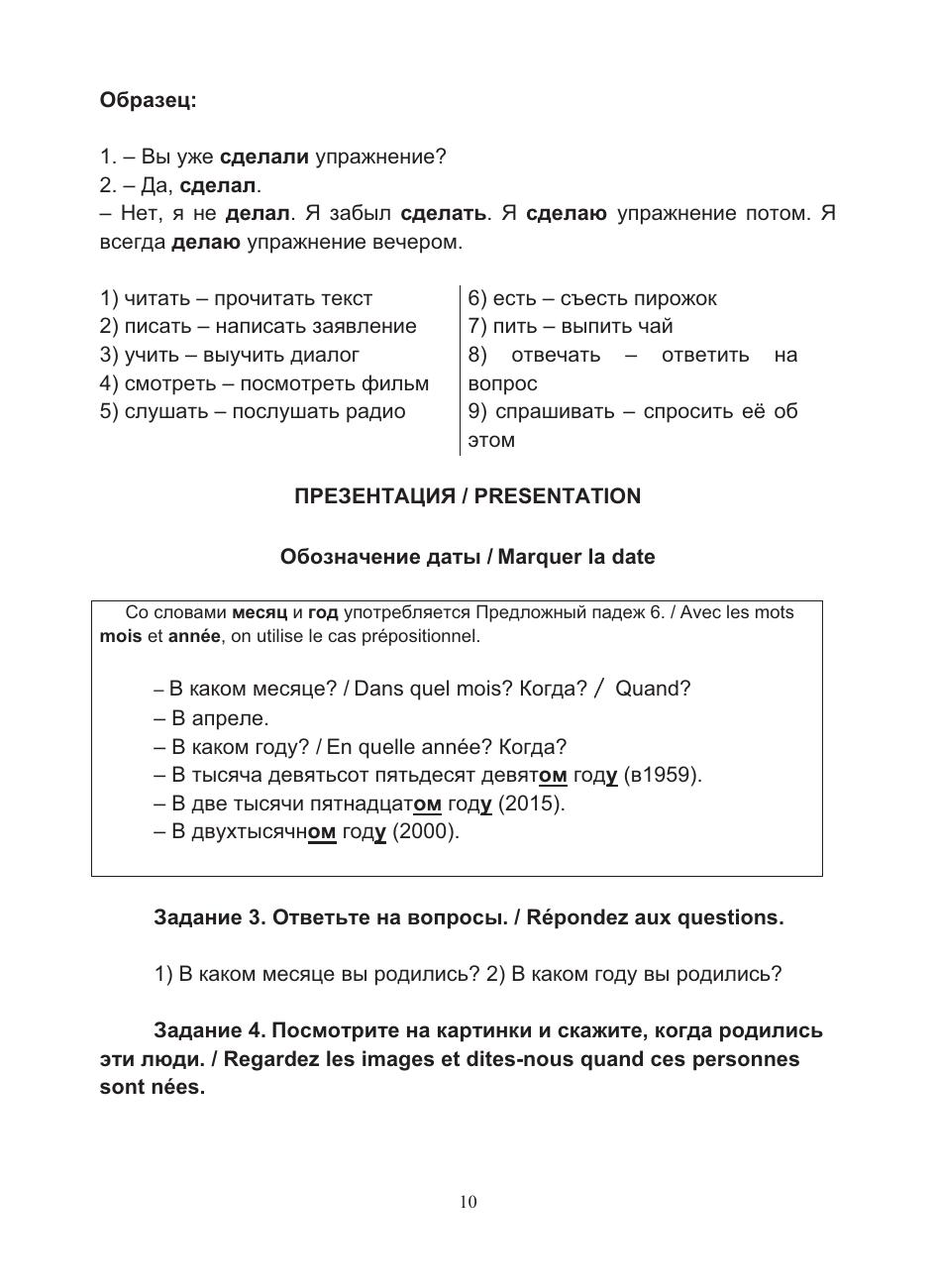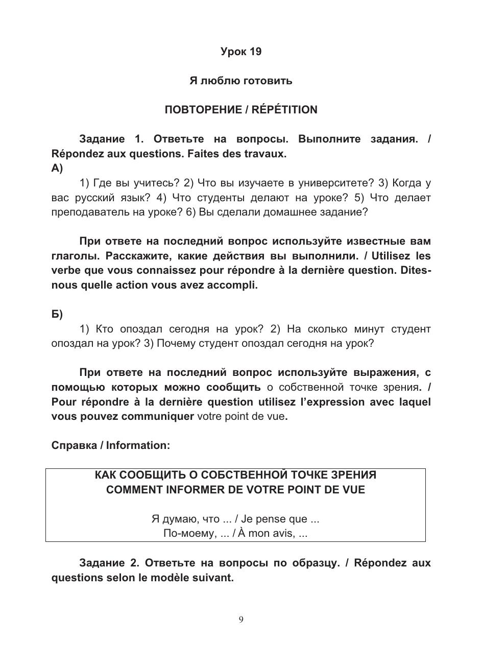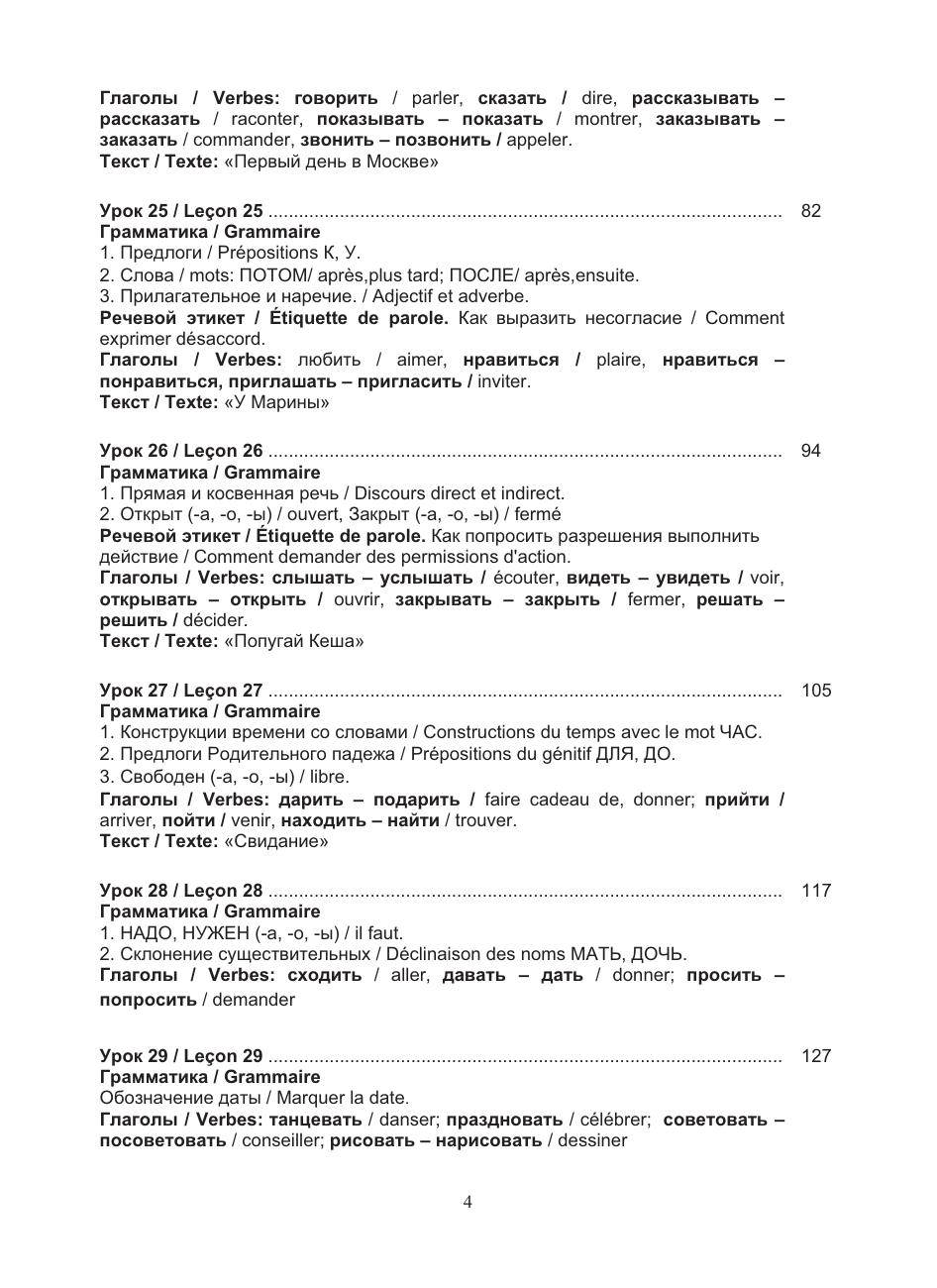 Учебный комплекс включает учебное пособие и рабочую тетрадь, содержащие материал базового уровня владения русским языком как иностранным (А2). B пособии предлагается особая нестандартная организация учебного материала, позволяющая в сжатые сроки усвоить лексический и грамматический материал и способствующая активизации речевой деятельности учащихся. В пособии реализованы современные подходы к обучению русскому языку иностранцев: интенсивность, коммуникативность, практическая направленность и учёт родного языка. Грамматические комментарии, диалоги, упражнения сопровождаются переводом на французский язык. По пособию можно работать как с преподавателем, так и самостоятельно.