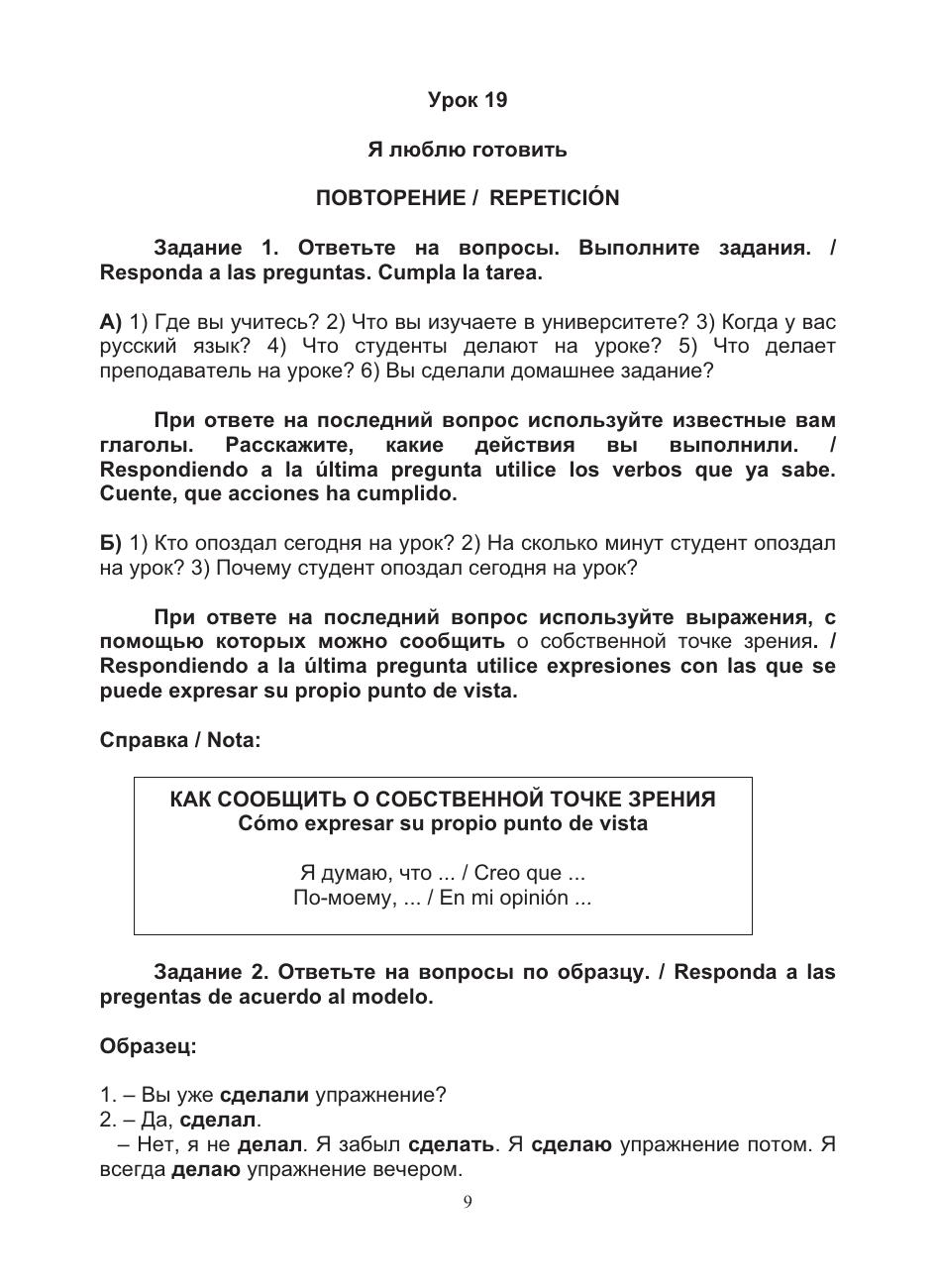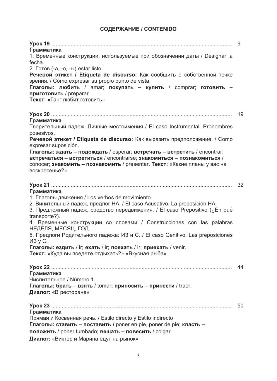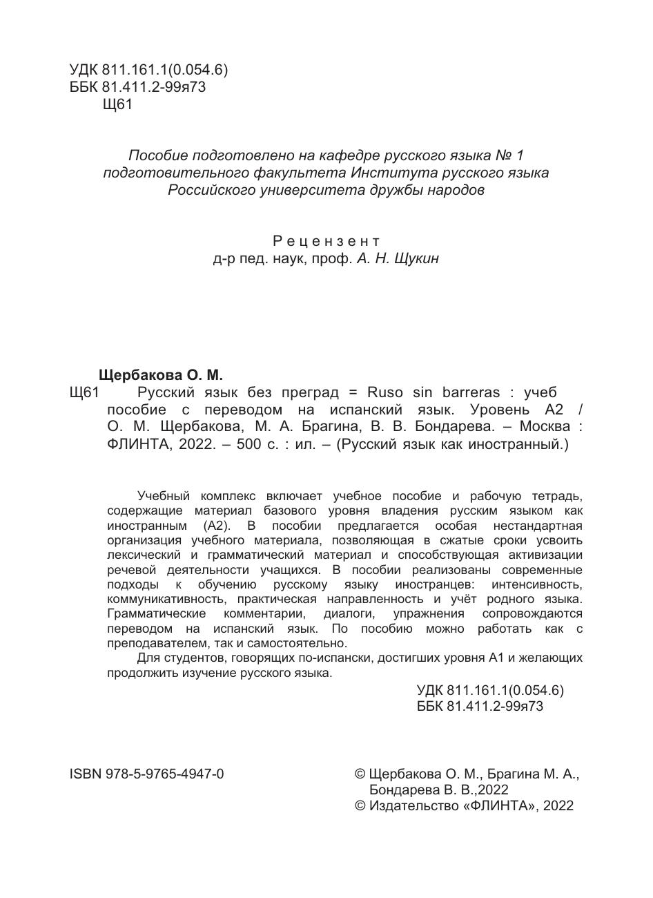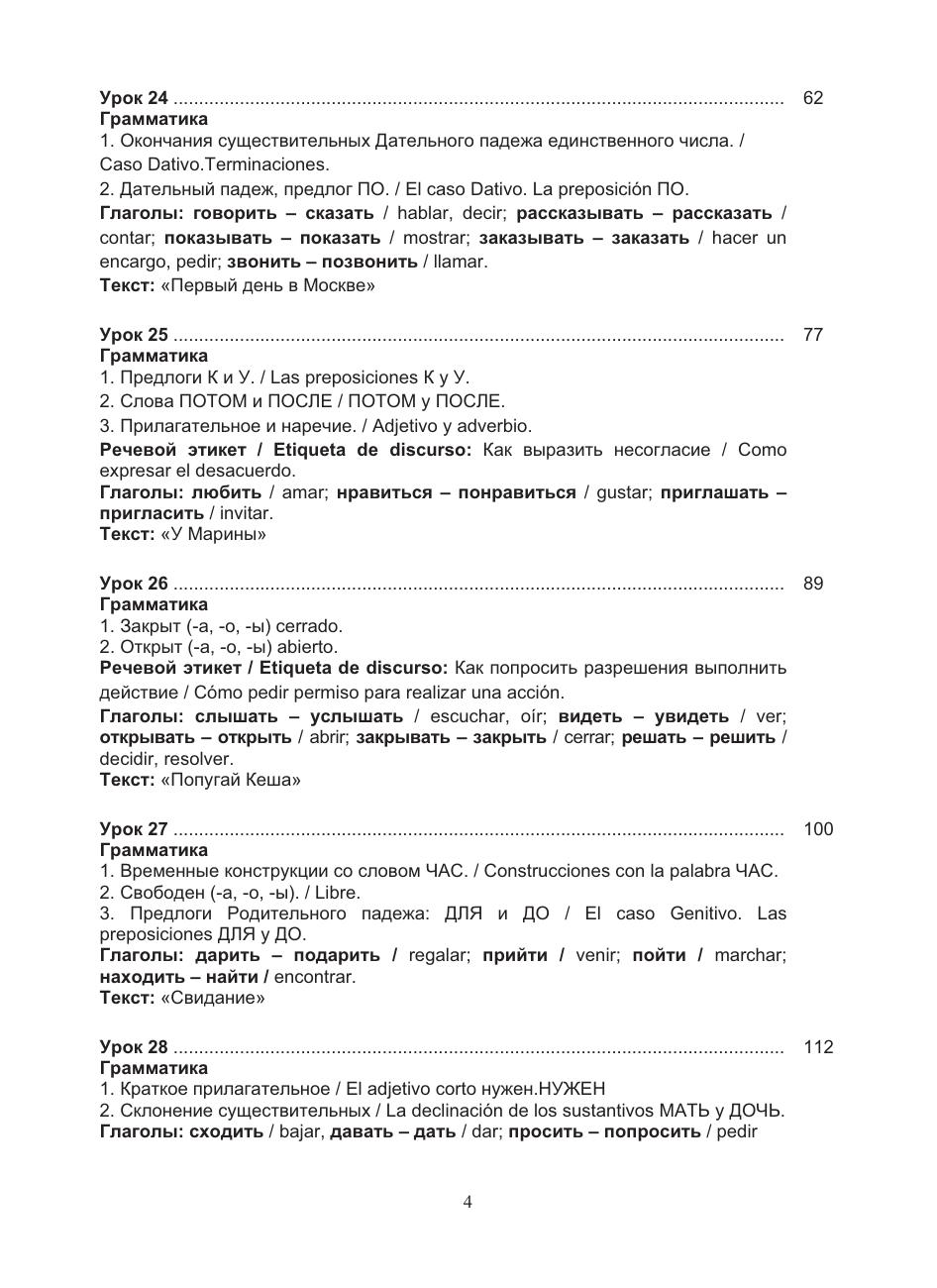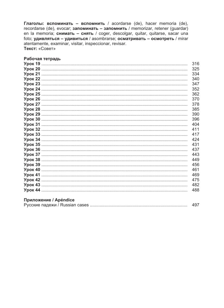 Учебный комплекс включает учебное пособие и рабочую тетрадь, содержащие материал базового уровня владения русским языком как иностранным (А2). B пособии предлагается особая нестандартная организация учебного материала, позволяющая в сжатые сроки усвоить лексический и грамматический материал и способствующая активизации речевой деятельности учащихся. В пособии реализованы современные подходы к обучению русскому языку иностранцев: интенсивность, коммуникативность, практическая направленность и учёт родного языка. Грамматические комментарии, диалоги, упражнения сопровождаются переводом на испанский язык. По пособию можно работать как с преподавателем, так и самостоятельно.
