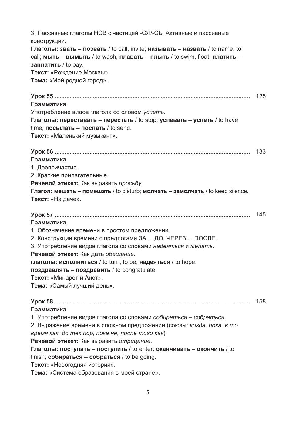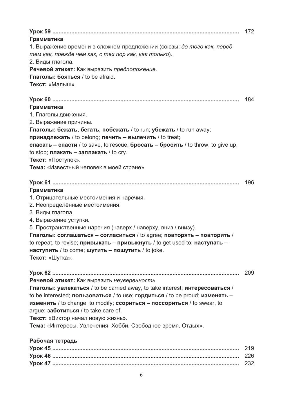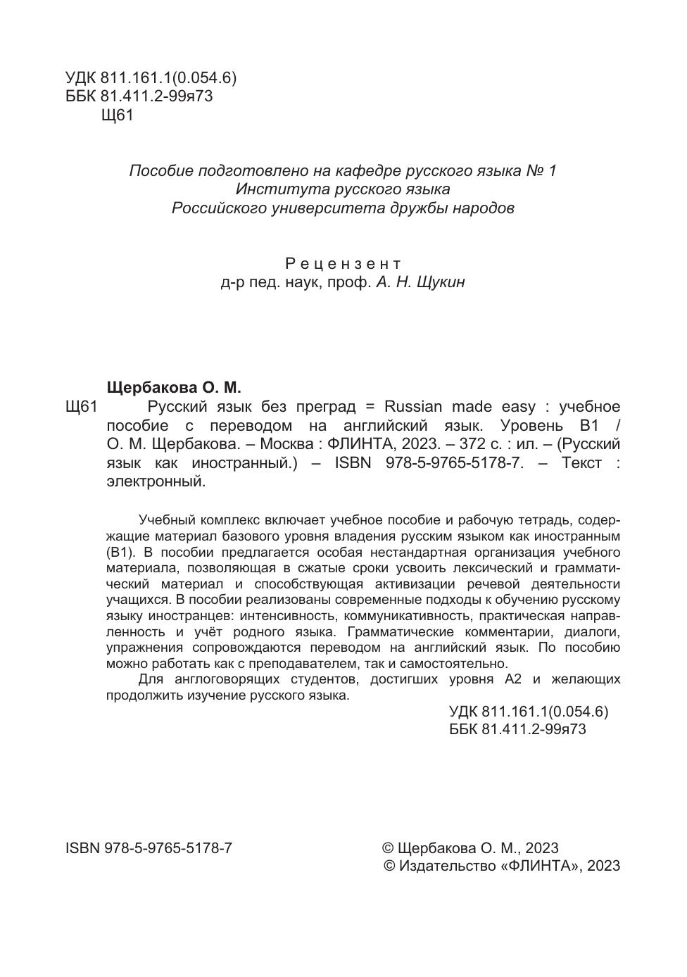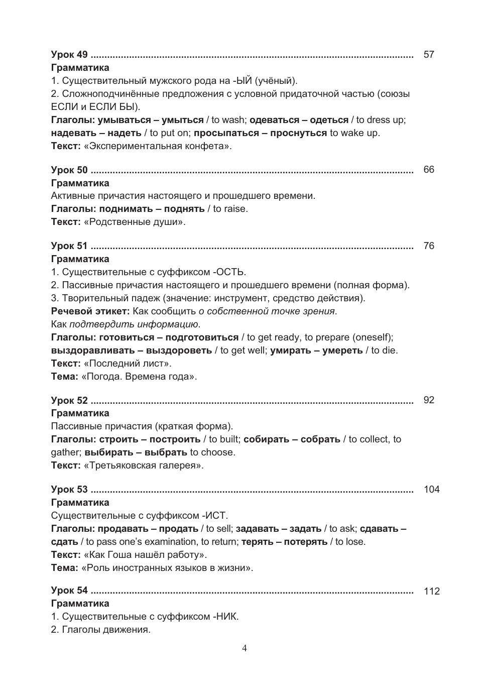 Учебный комплекс включает учебное пособие и рабочую тетрадь, содержащие материал базового уровня владения русским языком как иностранным (В1). В пособии предлагается особая нестандартная организация учебного материала, позволяющая в сжатые сроки усвоить лексический и грамматический материал и способствующая активизации речевой деятельности учащихся. В пособии реализованы современные подходы к обучению русскому языку иностранцев: интенсивность, коммуникативность, практическая направленность и учёт родного языка. Грамматические комментарии, диалоги, упражнения сопровождаются переводом на английский язык. По пособию можно работать как с преподавателем, так и самостоятельно.