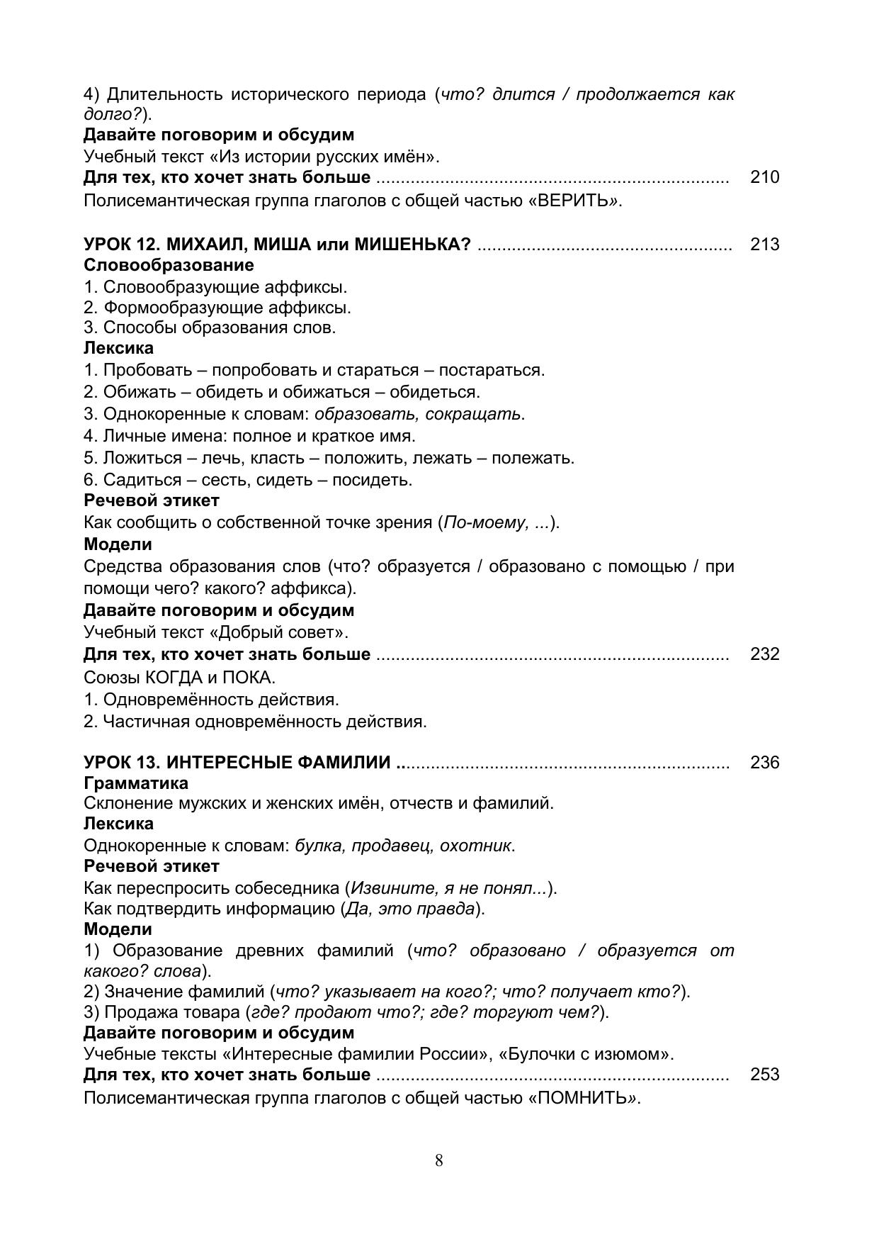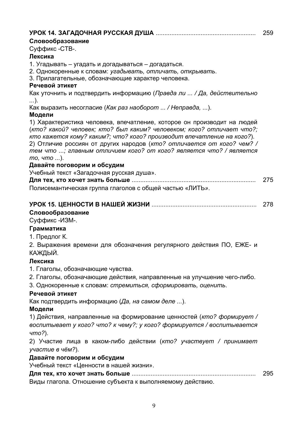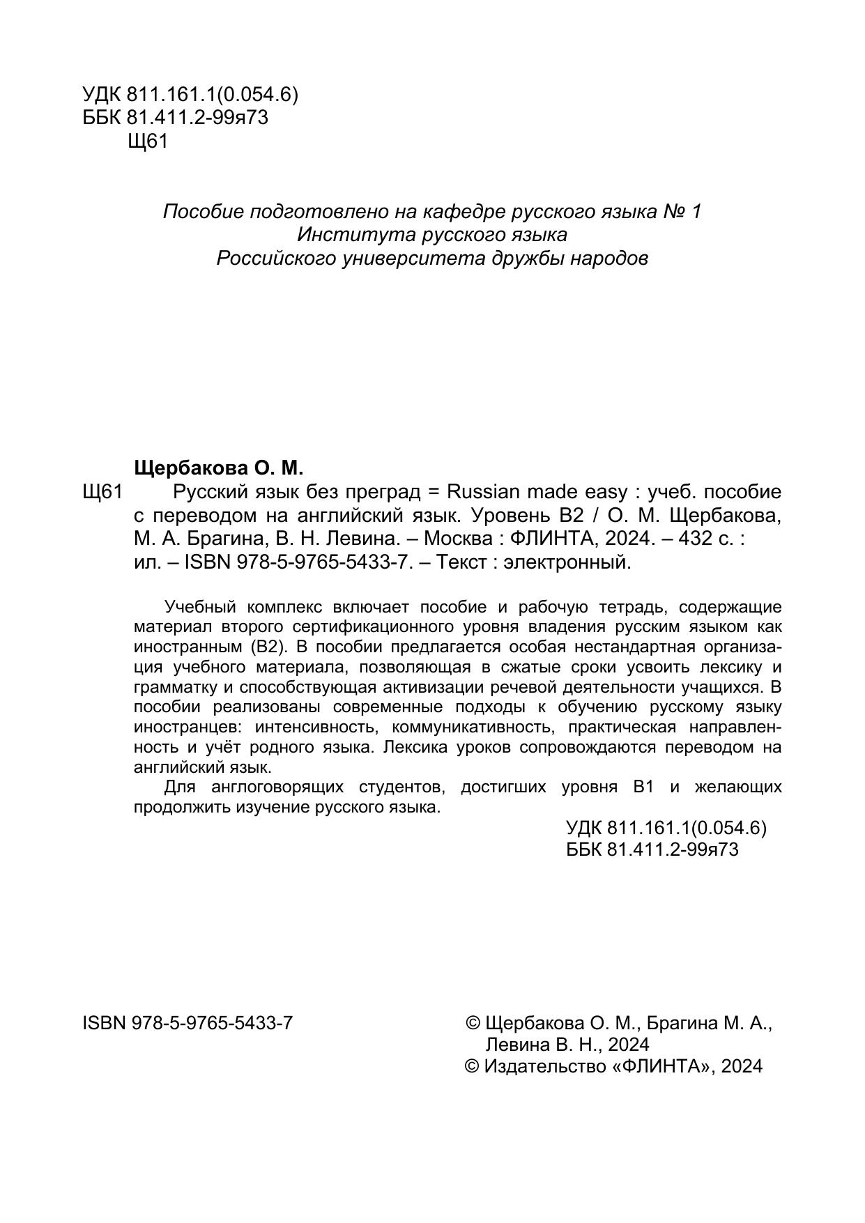 Учебный комплекс включает пособие и рабочую тетрадь, содержащие материал второго сертификационного уровня владения русским языком как иностранным (В2). В пособии предлагается особая нестандартная организация учебного материала, позволяющая в сжатые сроки усвоить лексику и грамматку и способствующая активизации речевой деятельности учащихся. В пособии реализованы современные подходы к обучению русскому языку иностранцев: интенсивность, коммуникативность, практическая направленность и учёт родного языка. Лексика уроков сопровождаются переводом на английский язык. Для англоговорящих студентов, достигших уровня В1 и желающих продолжить изучение русского языка.