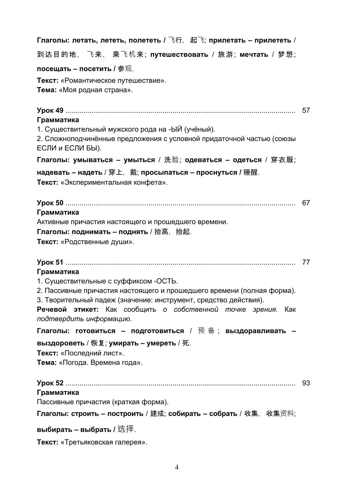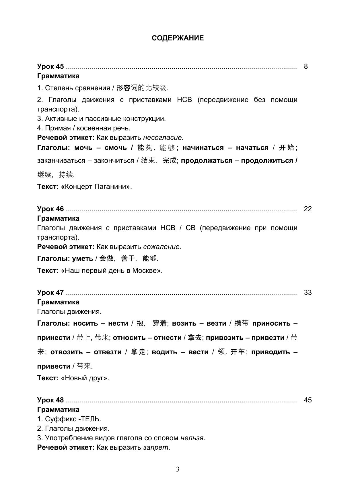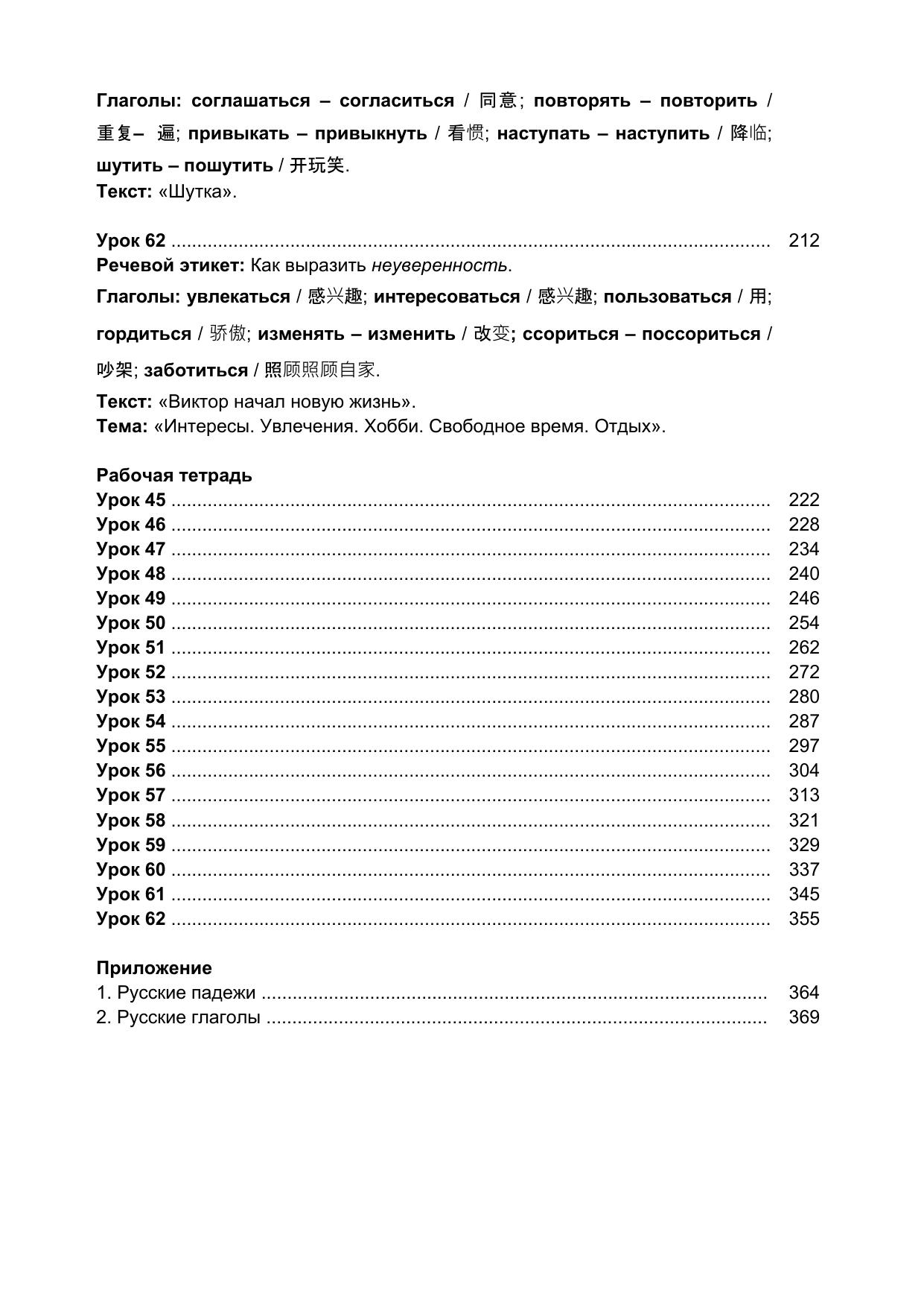 Учебный комплекс включает пособие и рабочую тетрадь, содержащие материал базового уровня владения русским языком как иностранным (В1). В пособии предлагается особая нестандартная организация учебного материала, позволяющая в сжатые сроки усвоить лексику и грамматику и способствующая активизации речевой деятельности учащихся. В пособии реализованы современные подходы к обучению русскому языку иностранцев: интенсивность, коммуникативность, практическая направленность и учёт родного языка. Грамматические комментарии, диалоги, упражнения сопровождаются переводом на китайский язык. По пособию можно работать как с преподавателем, так и самостоятельно. Для студентов, говорящих по-китайски, достигших уровня А2 и желающих продолжить изучение русского языка.