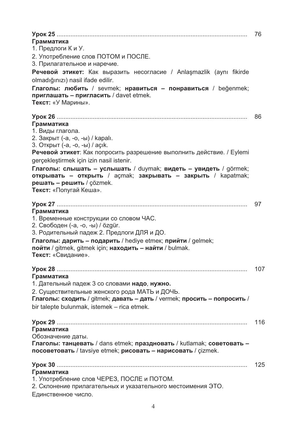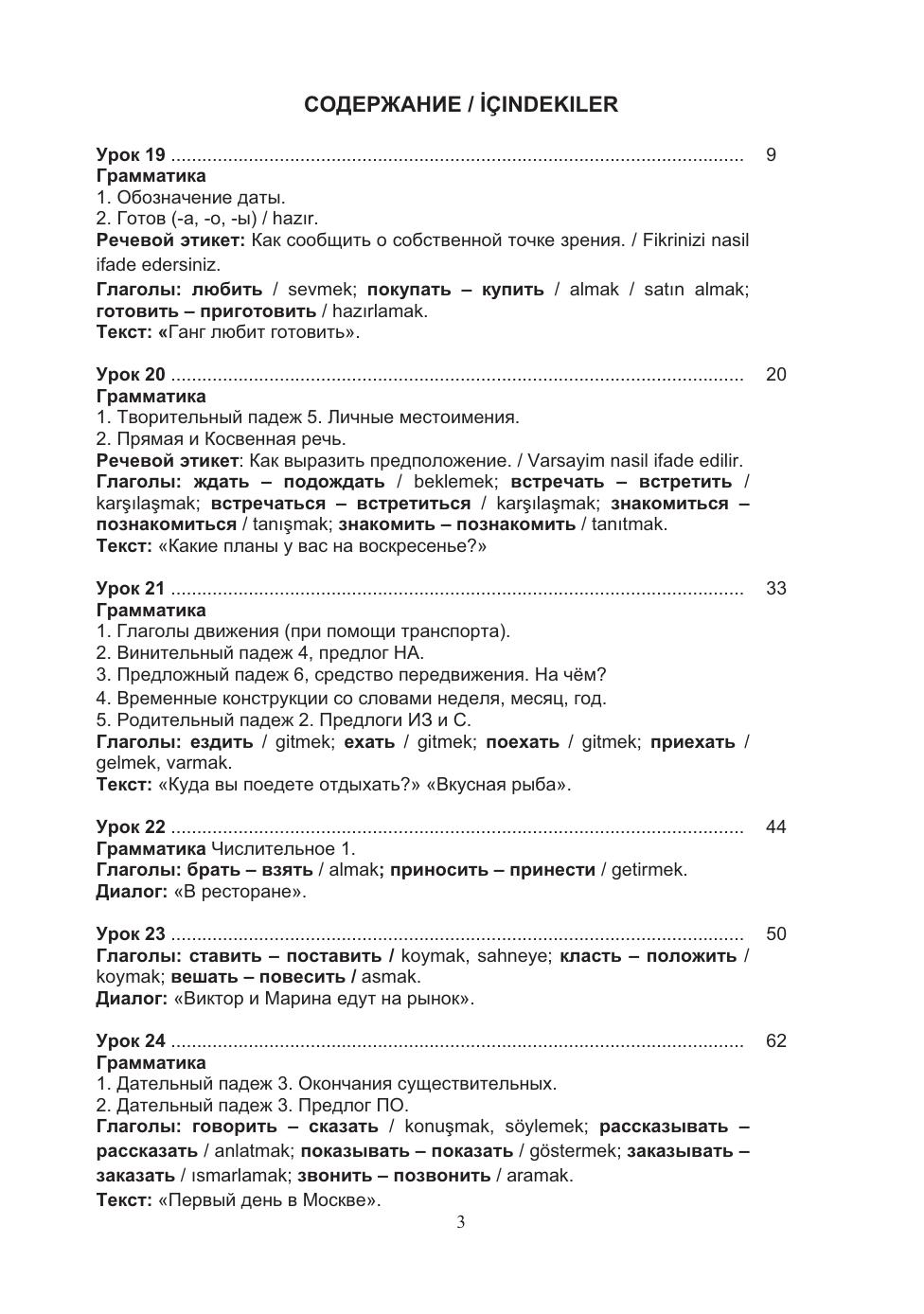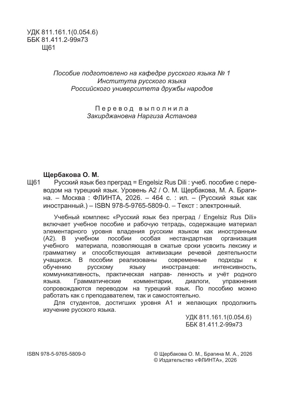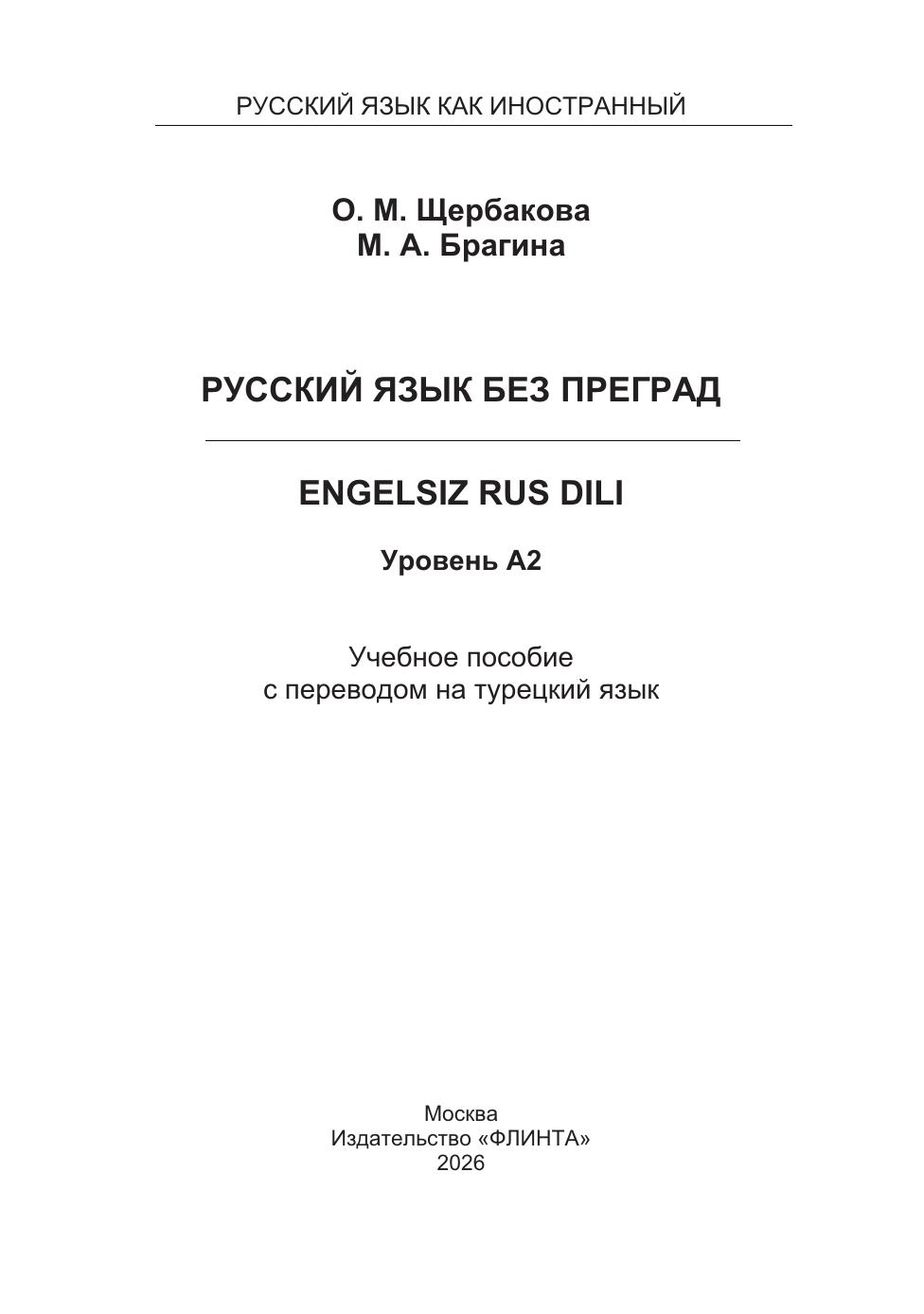 Учебный комплекс «Русский язык без преград / Engelsiz Rus Dili» включает учебное пособие и рабочую тетрадь, содержащие материал элементарного уровня владения русским языком как иностранным (А2). В учебном пособии особая нестандартная организация учебного материала, позволяющая в сжатые сроки усвоить лексику и грамматику и способствующая активизации речевой деятельности учащихся. В пособии реализованы современные подходы к обучению русскому языку иностранцев: интенсивность, коммуникативность, практическая направ- ленность и учёт родного языка. Грамматические комментарии, диалоги, упражнения сопровождаются переводом на турецкий язык. По пособию можно работать как с преподавателем, так и самостоятельно. Для студентов, достигших уровня А1 и желающих продолжить изучение русского языка.