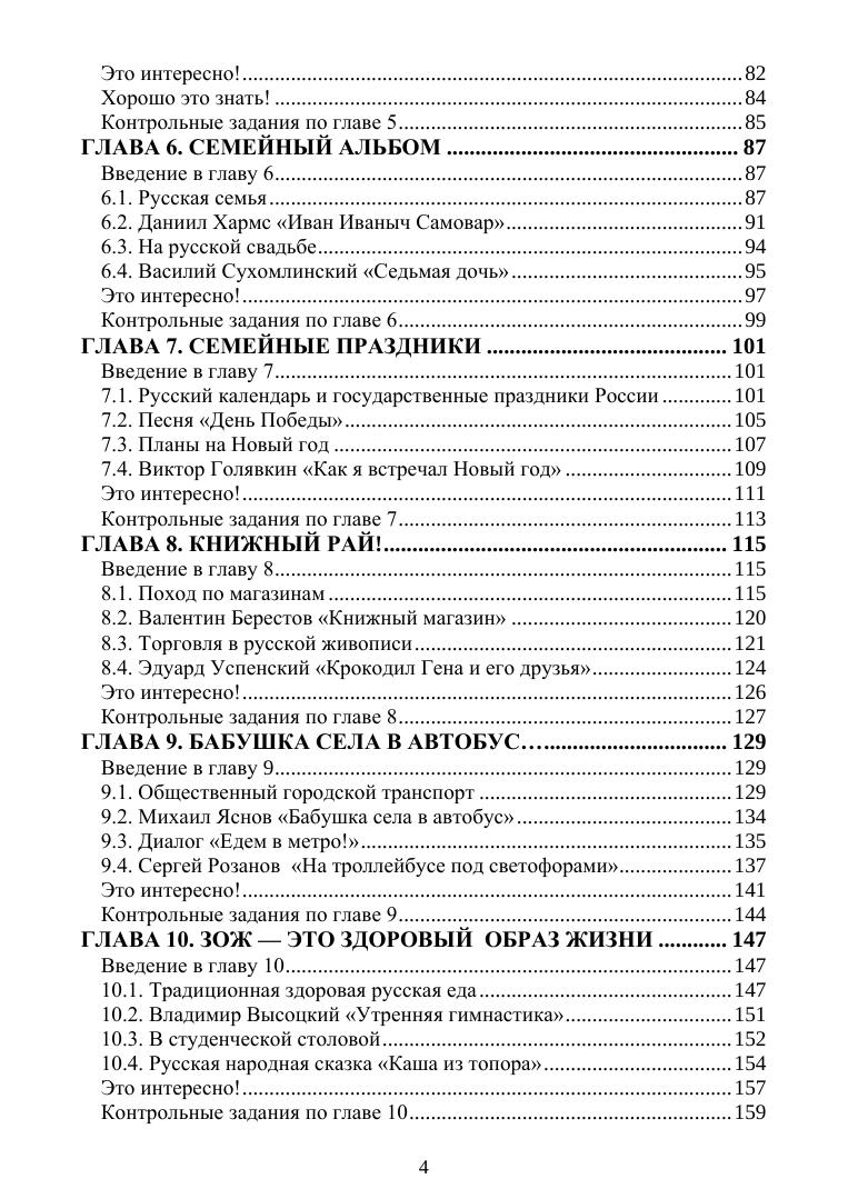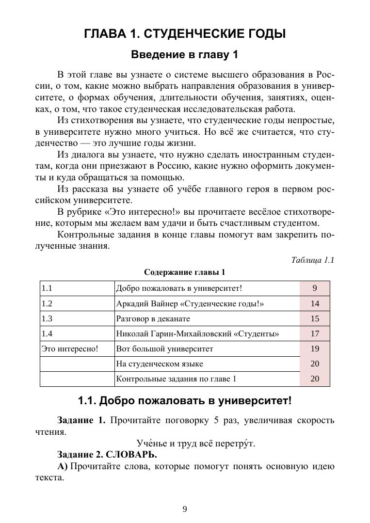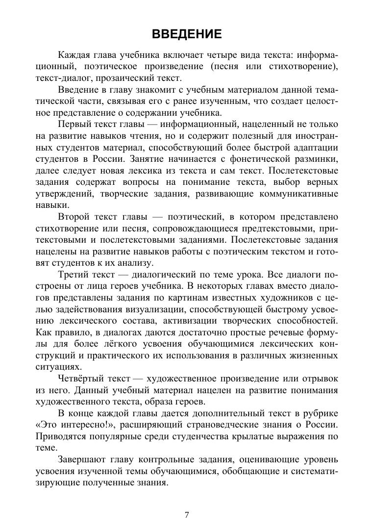 Учебник предназначен для занятий по индивидуальному чтению для иностранных студентов I сертификационного уровня русского языка как иностранного (РКИ). Учебник состоит из двенадцати тематических глав, содержание которых нацелено на: формирование выразительного чтения, ознакомление с текстами разных жанров и форм, расширение лексического запаса, формирование лингвокультурологических знаний о культурных особенностях и традициях России, о ходе студенческой жизни, нормах и правилах общения, закрепление грамматических и словообразовательных навыков, развитие коммуникативной компетенции. Содержание текстов знакомит студентов с русским речевым этикетом и помогает более быстрой адаптации иностранных студентов к жизни в России. Учебник содержит предтекстовые, притекстовые и послетекстовые задания, а также задания творческой направленности. Ответы к заданиям расположены в конце учебника. Рекомендовано к использованию как в групповых аудиторных занятиях, так и самостоятельном обучении.