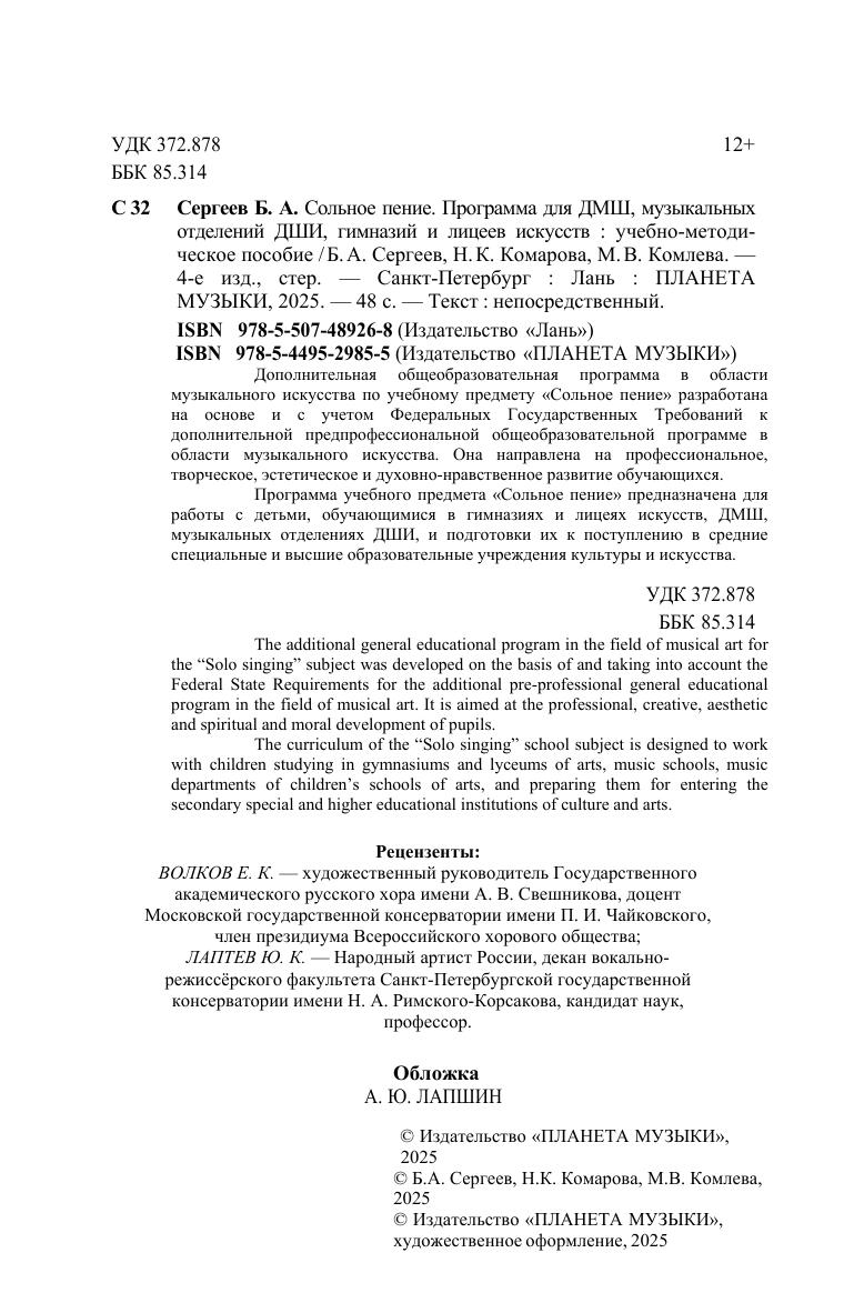 Дополнительная общеобразовательная программа в области музыкального искусства по учебному предмету «Сольное пение» разработана на основе и с учетом Федеральных Государственных Требований к дополнительной предпрофессиональной общеобразовательной программе в области музыкального искусства. Она направлена на профессиональное, творческое, эстетическое и духовно-нравственное развитие обучающихся. Программа учебного предмета «Сольное пение» предназначена для работы с детьми, обучающимися в гимназиях и лицеях искусств, ДМШ, музыкальных отделениях ДШИ, и подготовки их к поступлению в средние специальные и высшие образовательные учреждения культуры и искусства. The additional general educational program in the field of musical art for the “Solo singing” subject was developed on the basis of and taking into account the Federal State Requirements for the additional pre-professional general educational program in the field of musical art. It is aimed at the professional, creative, aesthetic and spiritual and moral development of pupils. The curriculum of the “Solo singing” school subject is designed to work with children studying in gymnasiums and lyceums of arts, music schools, music departments of children's schools of arts, and preparing them for entering the secondary special and higher educational institutions of culture and arts.