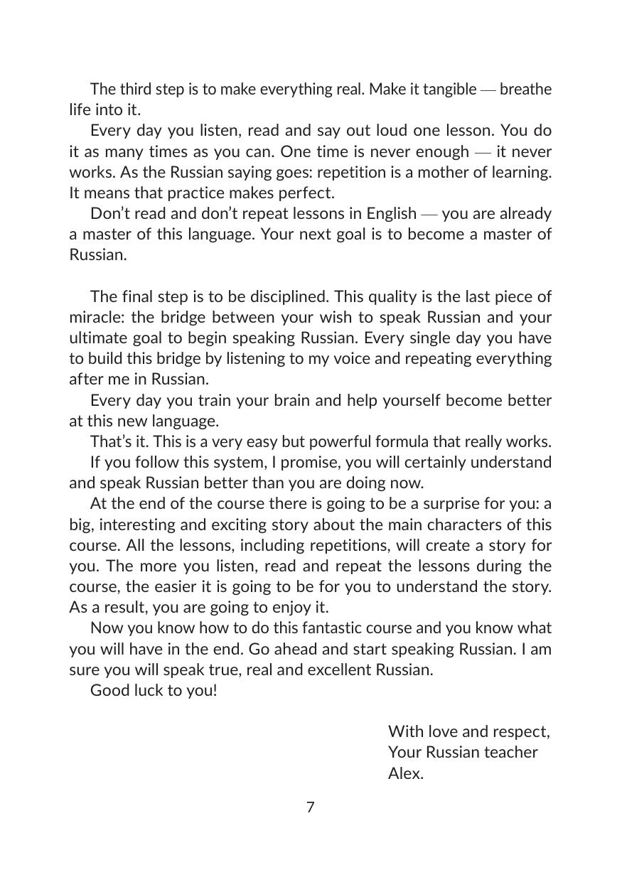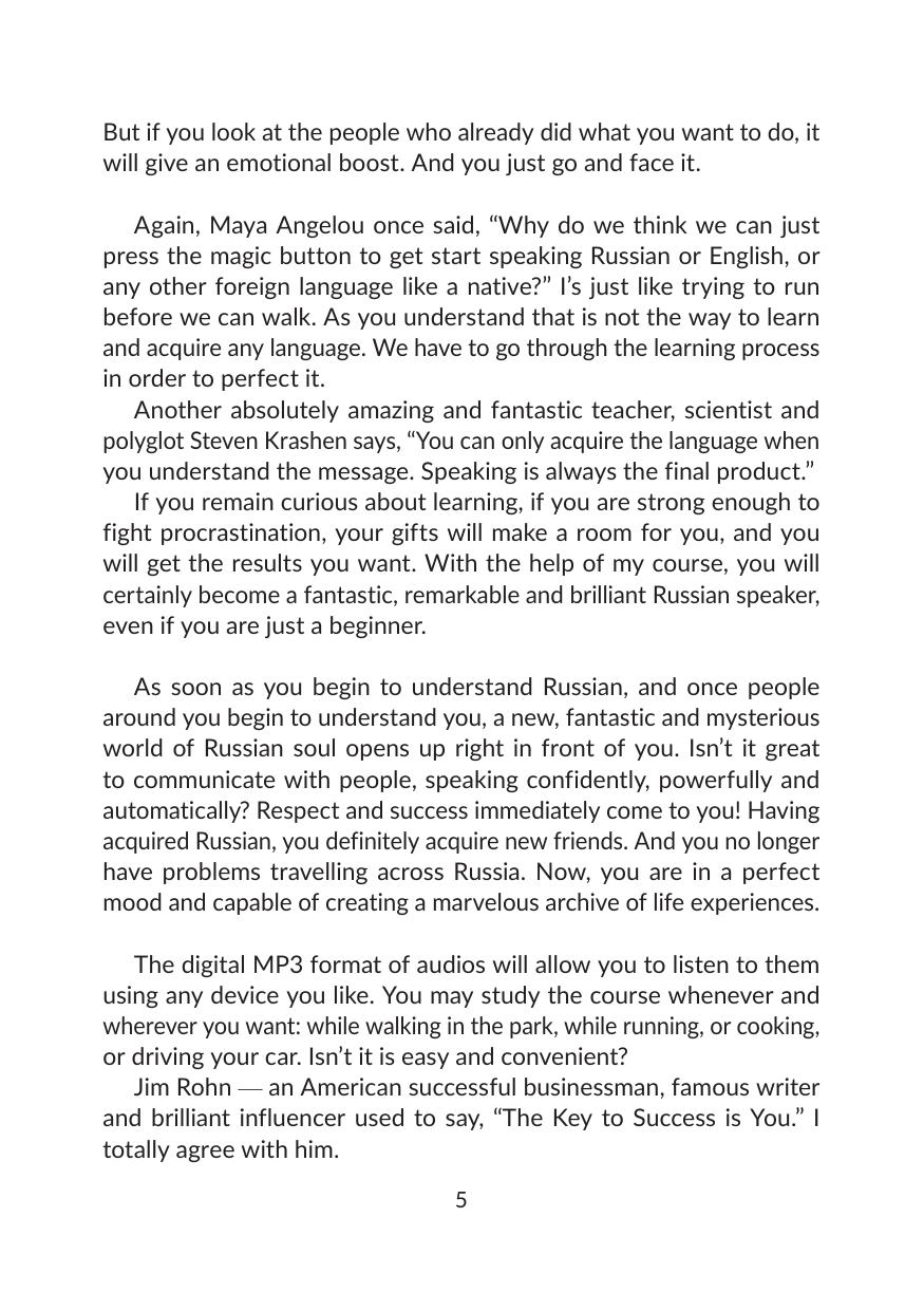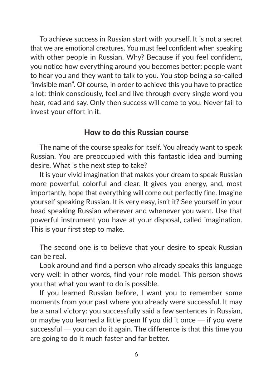 «Я хочу говорить по-русски / I want to speak Russian» — это пособие для тех, кто решил начать понимать русский язык на слух и говорить по-русски. Это трамплин в новый, интересный и загадочный мир русского языка, настоящее приключение, которое вы совершите с главными героями. Вместе с ними вы научи-тесь понимать русский, выражать свои мысли, задавать вопросы и отвечать на них. А аудиоприложение поможет не только сформировать правильное произношение, но и завоевать уважение собеседника.
