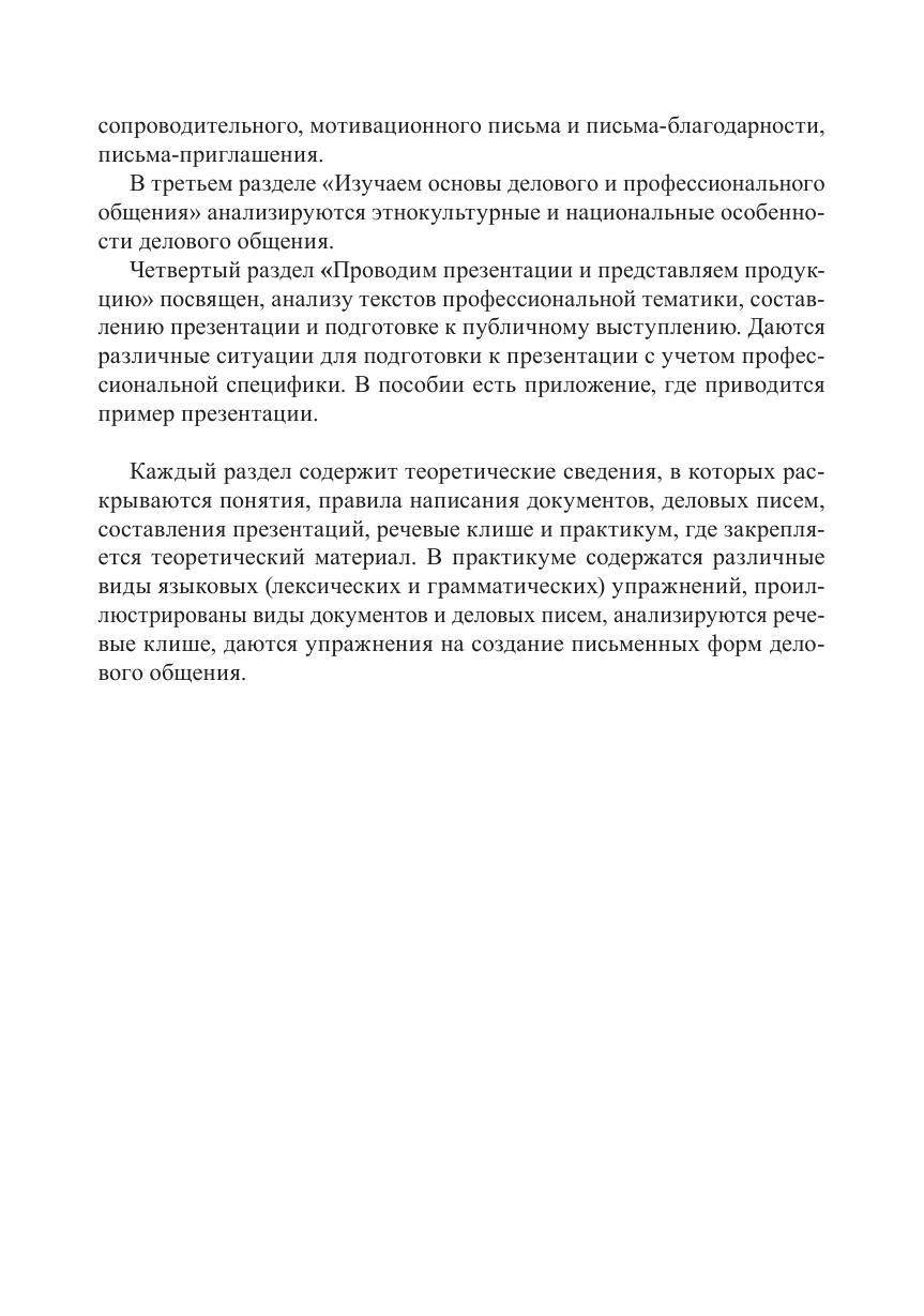 Пособие содержит теоретические сведения, в которых раскрываются понятия, правила написания документов, деловых писем, составления презентаций, речевые клише и практикум, где закрепляется теоретический материал. В практикуме содержатся различные виды языковых (лексических и грамматических) упражнений, проиллюстрированы виды документов и деловых писем, анализируются речевые клише, даются упражнения на создание письменных форм делового общения.