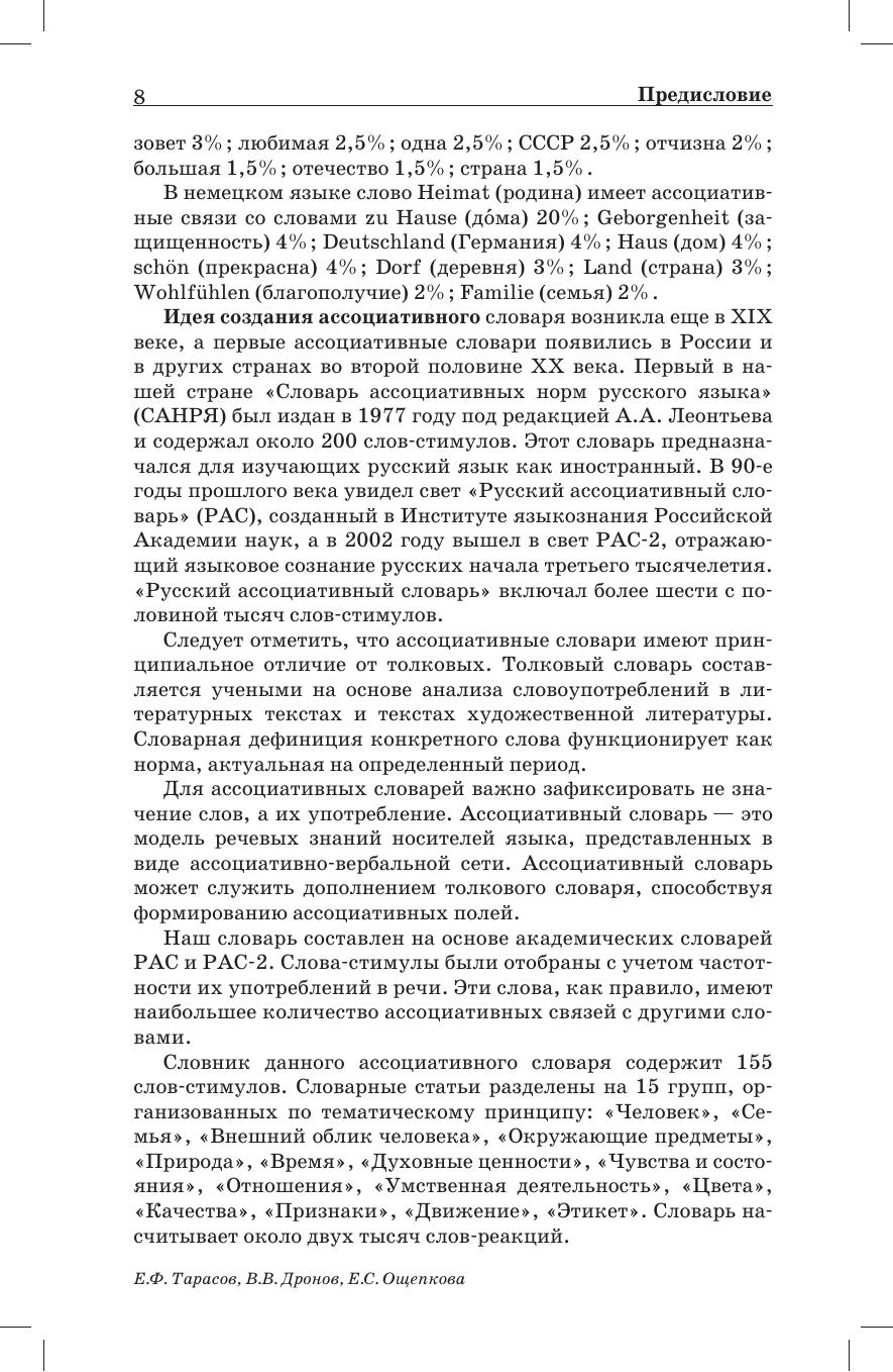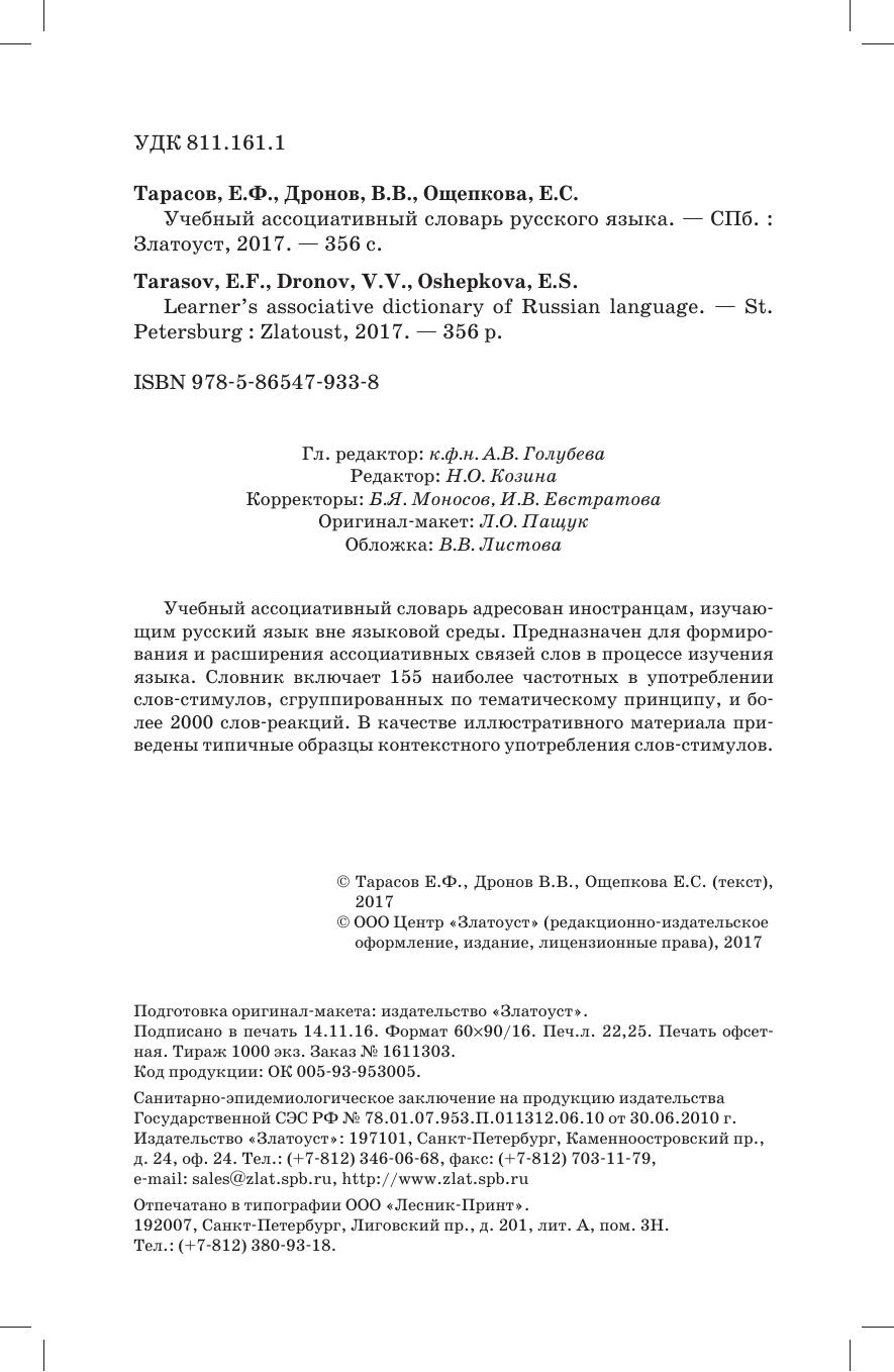 Учебный ассоциативный словарь адресован иностранцам, изучающим русский язык вне языковой среды. Предназначен для формирования и расширения ассоциативных связей слов в процессе изучения языка. Словник включает 155 наиболее частотных в употреблении слов-стимулов, сгруппированных по тематическому принципу, и более 2000 слов-реакций. В качестве иллюстративного материала приведены типичные образцы контекстного употребления слов-стимулов.