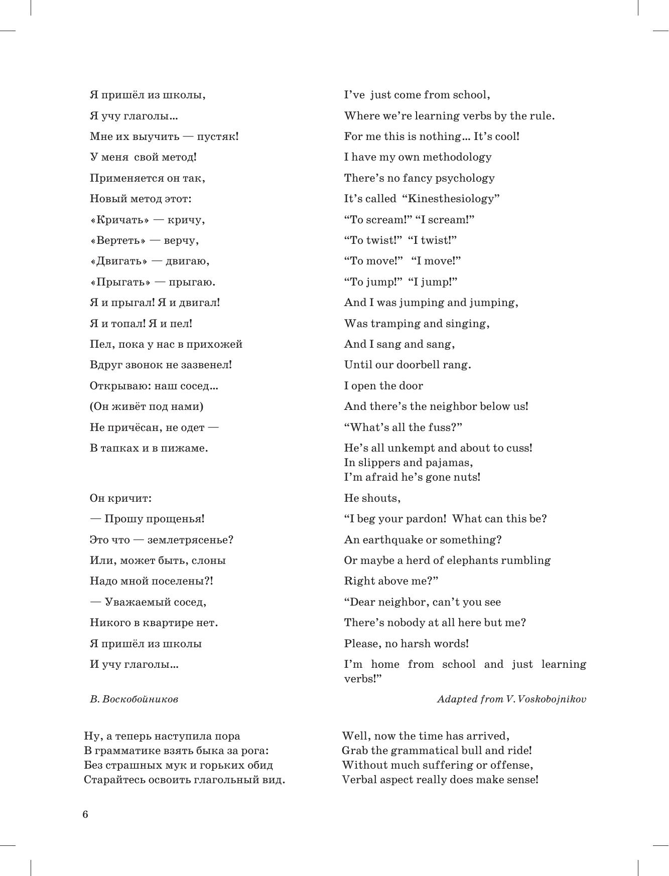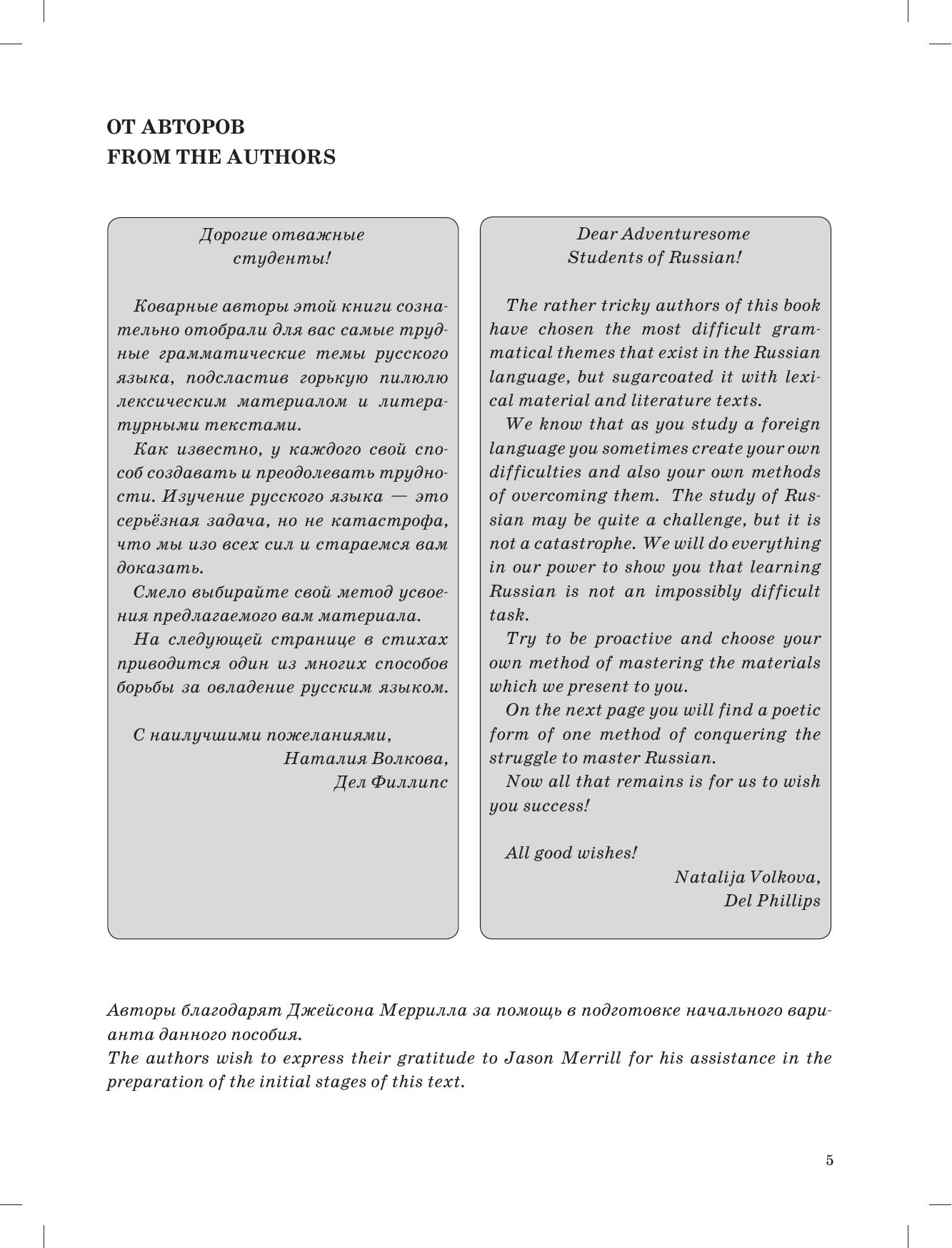 Пособие по грамматике русского языка предназначено для иностранных учащихся среднего и продвинутого этапов обучения. Сборник заданий в форме рабочей тетради состоит из шести наиболее сложных разделов русской грамматики. Задания, теоретический комментарий и малознакомый лексический материал обеспечены переводом на английский язык. Содержащиеся в книге интересные тексты, шутки, стихи, загадки, пословицы и поговорки делают процесс обучения более увлекательным.