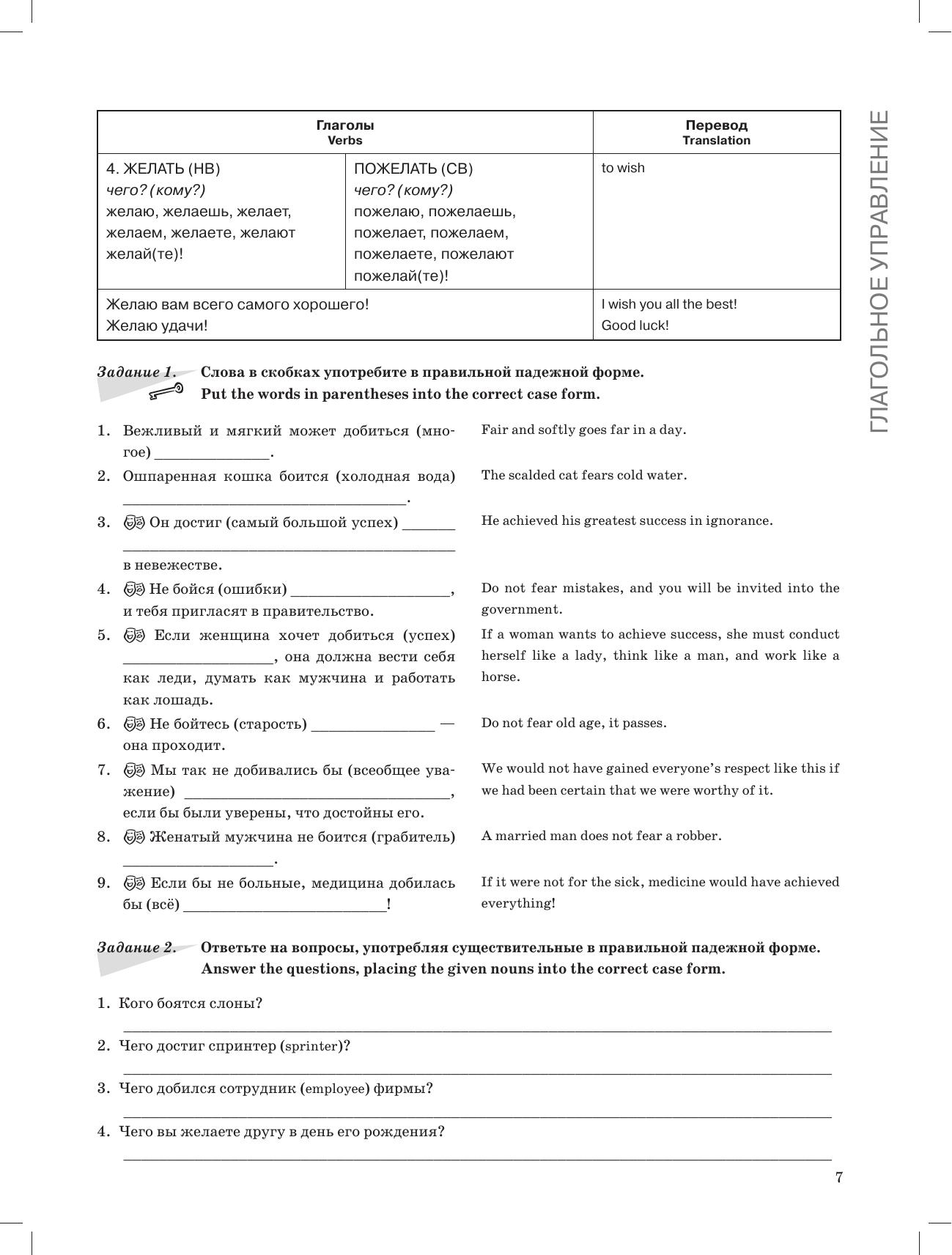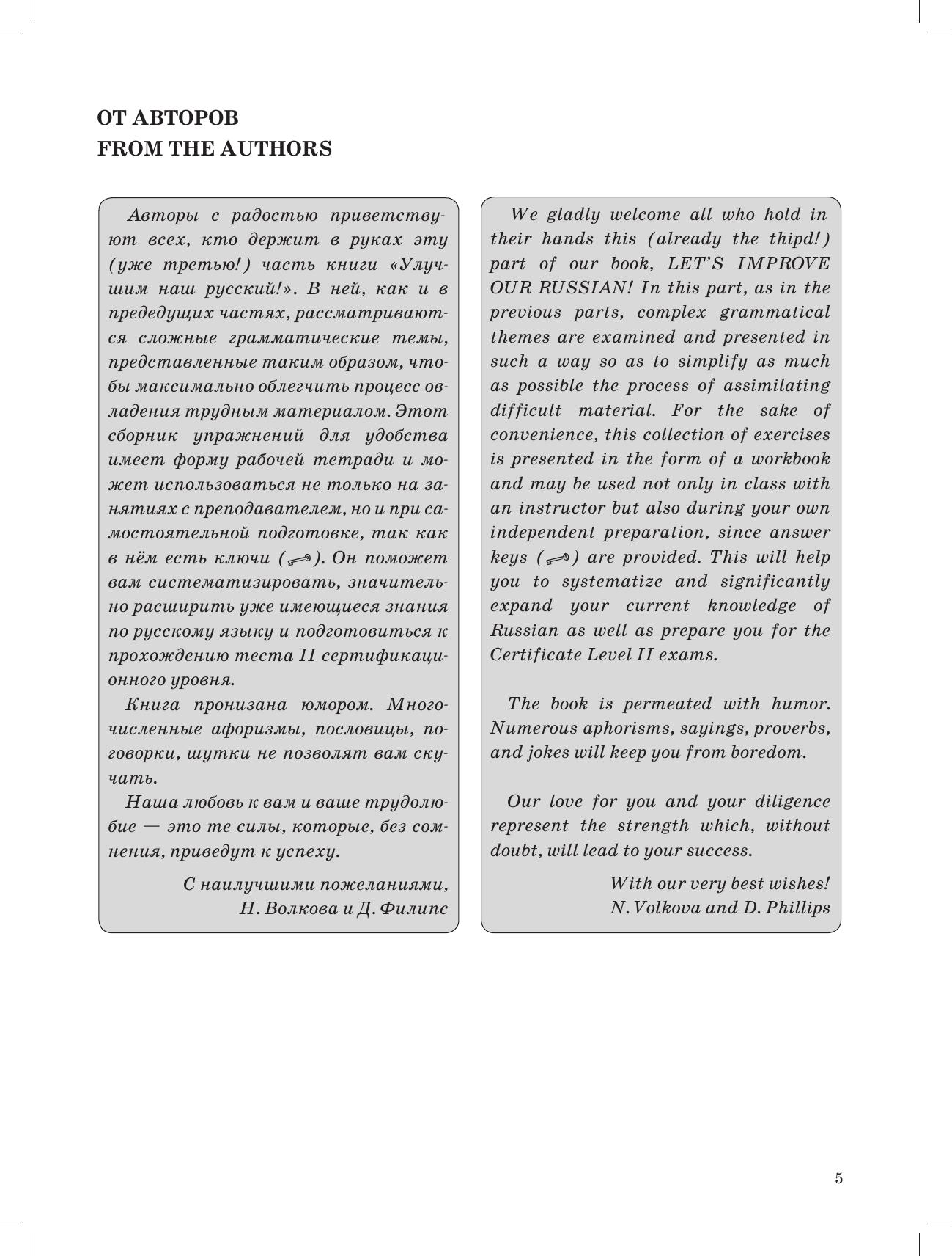 Книга пронизана юмором: процесс обучения оживляют многочисленные афоризмы, пословицы, поговорки и шутки. Все они, а также грамматические пояснения, формулировки заданий и некоторые слова и словосочетания, переведены на английский язык, что, несомненно, облегчает восприятие материала англоязычными учащимися, а также может быть интересно для тех, кто изучает не только русский, но и английский языки.