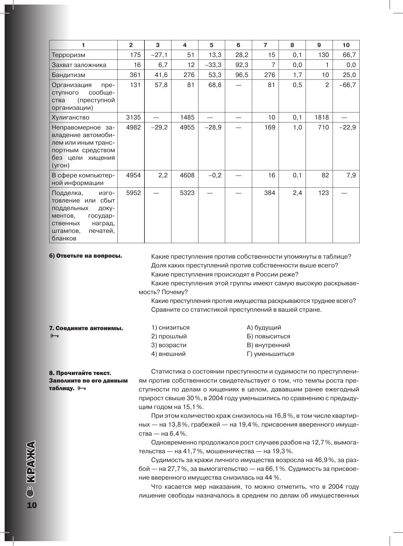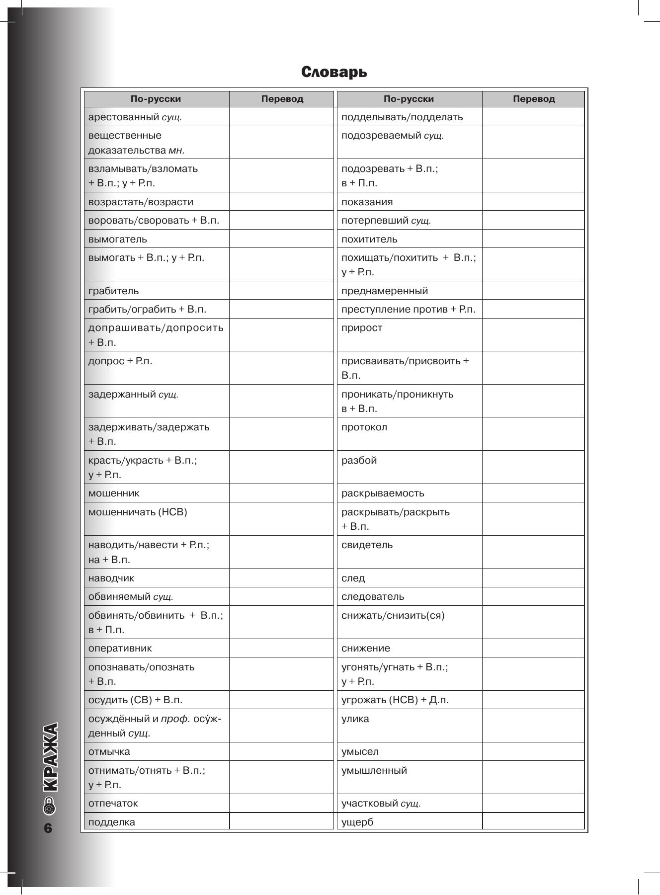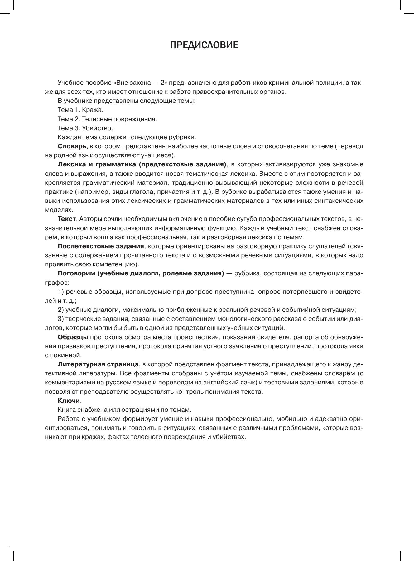 Специализированный курс для сотрудников зарубежных правоохранительных органов, использующих русский язык в работе (уровень B2). В двух частях. В первую часть вошли темы: «Угон транспортного средства», «Дорожно-транспортные происшествия», «Незаконное использование транспортных средств». Вторая часть включает темы: «Кража», «Телесные повреждения», «Убийство». Для домашнего чтения предлагаются фрагменты популярных современных детективов. Ключи, поурочный русско-английский словарь.