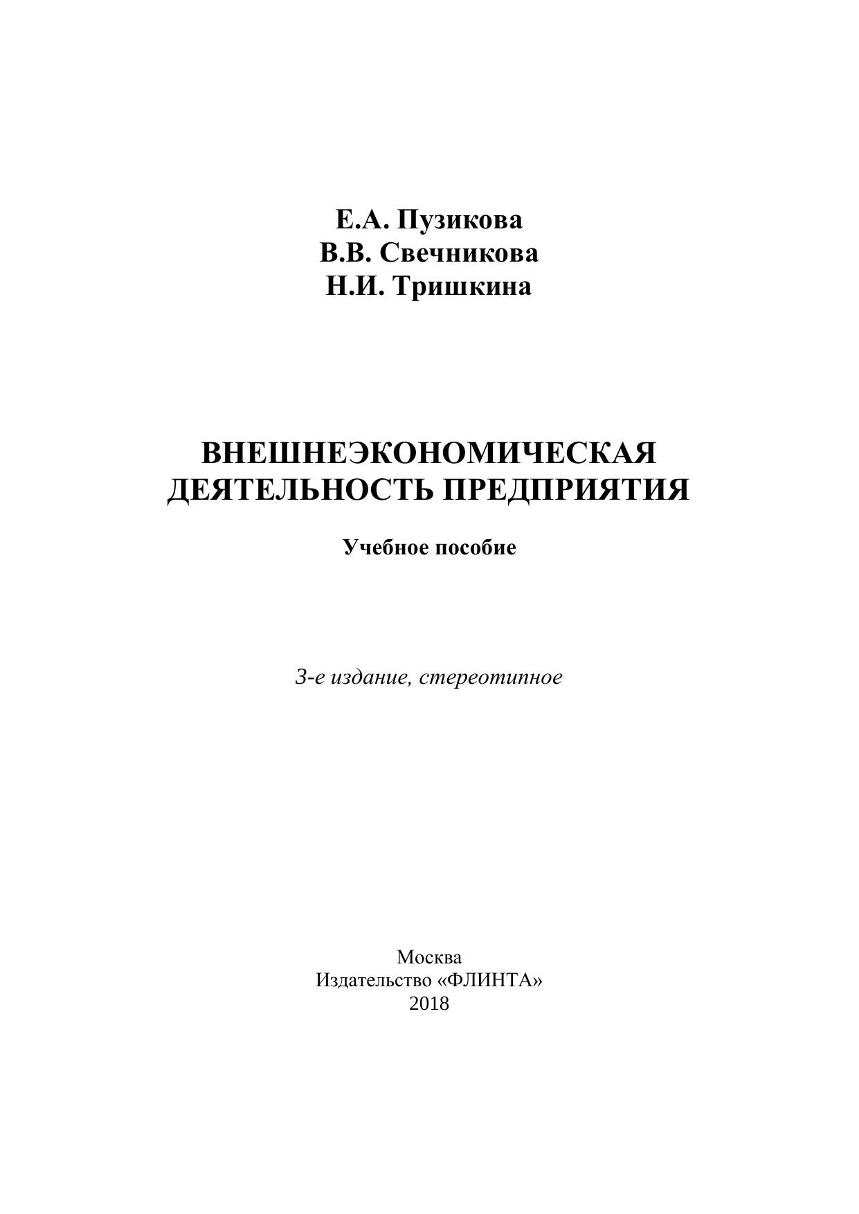 В пособии рассмотрены темы учебного курса «Внешнеэкономческая деятельность предприятия». Пособие предназначено для студентов, изучающих теоретические основы внешнеэкономической деятельности предприятия (направление подготовки — 38.03.01 Экономика).