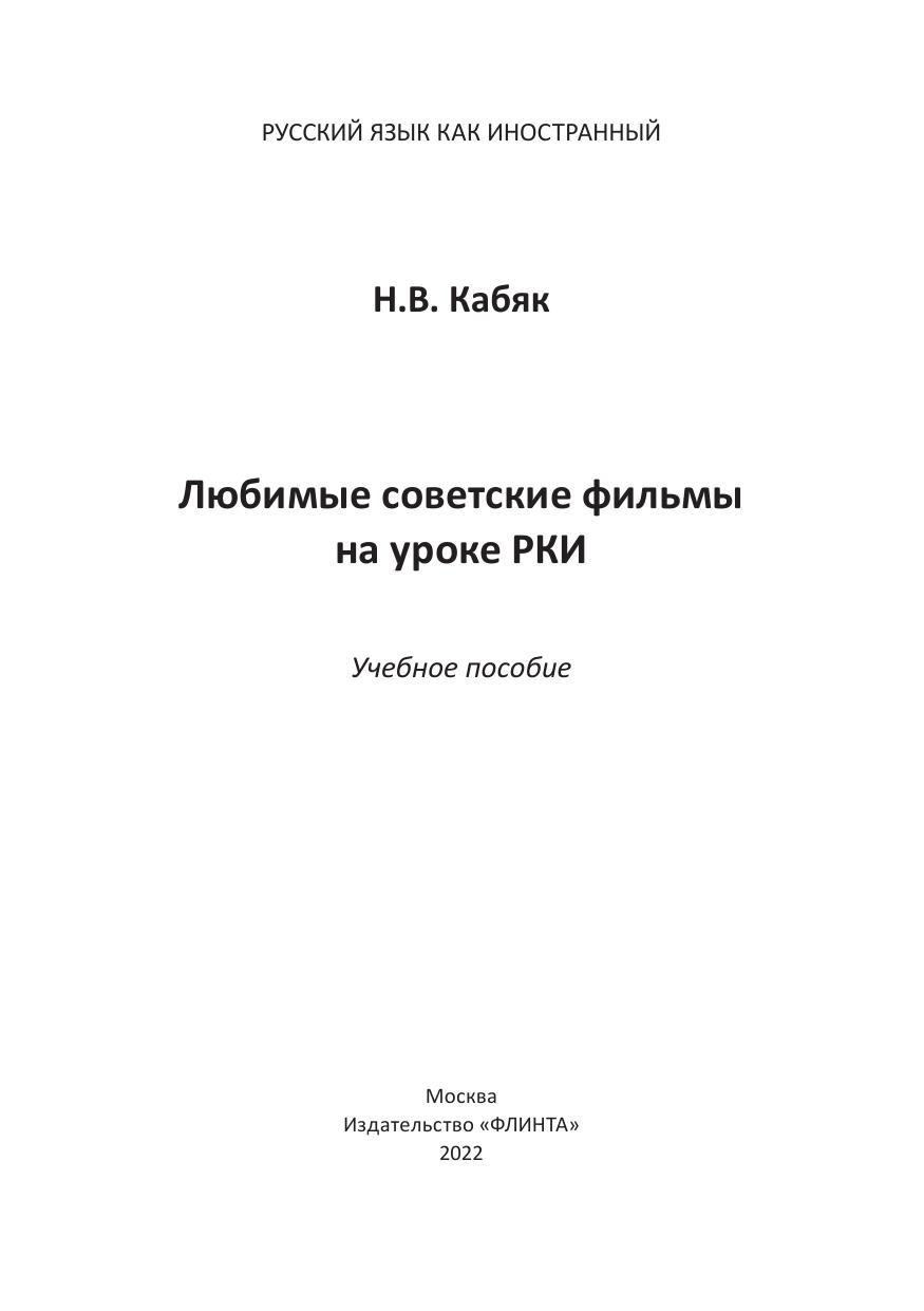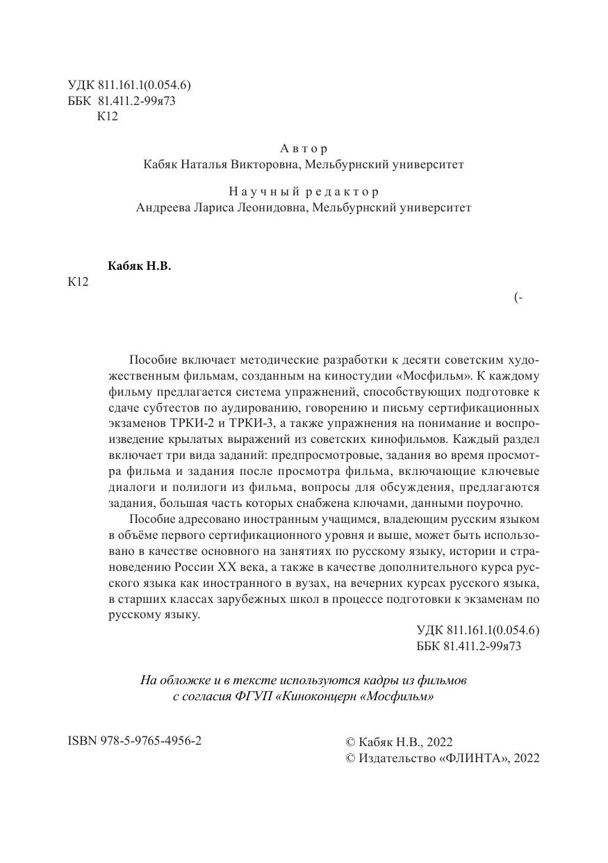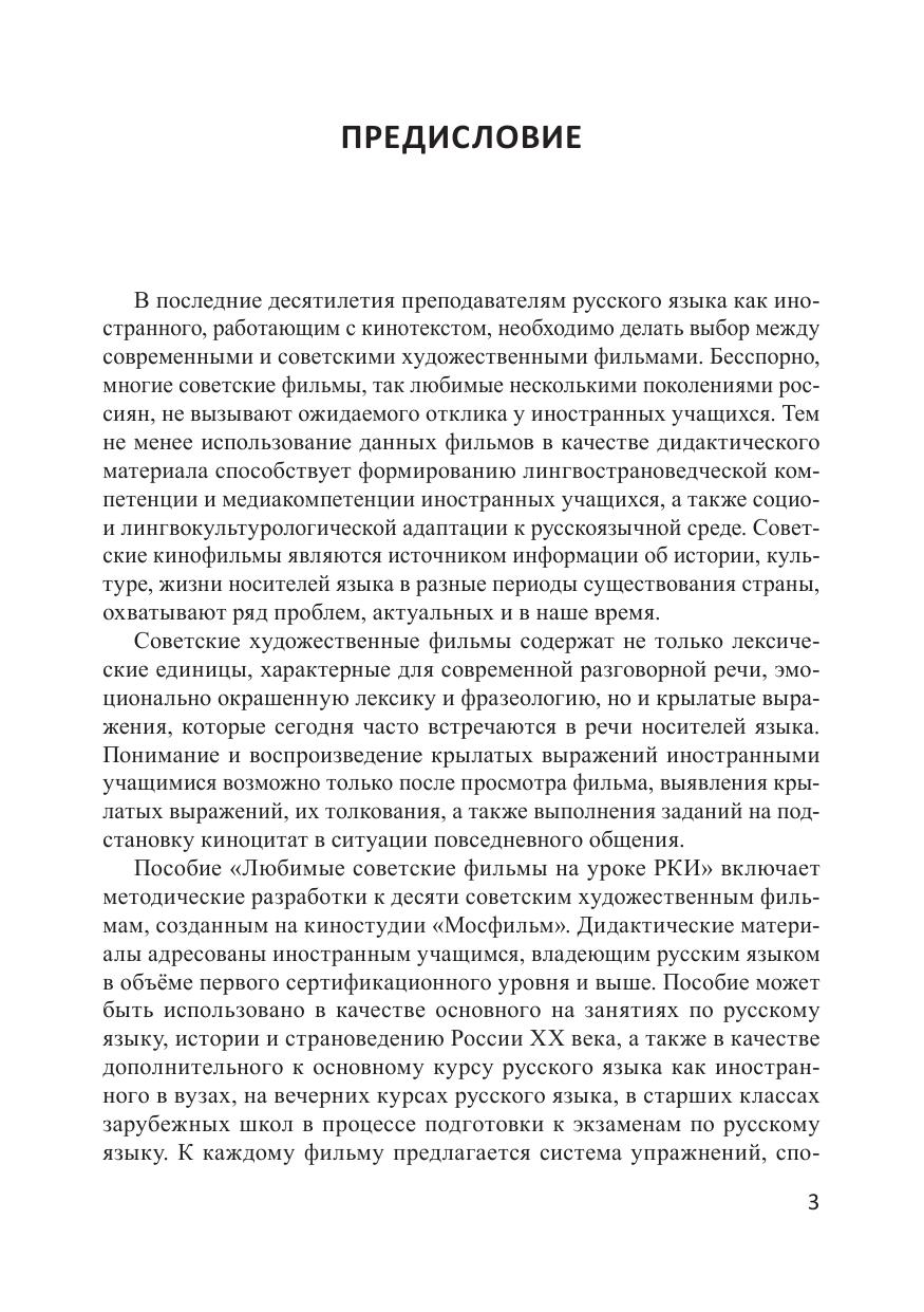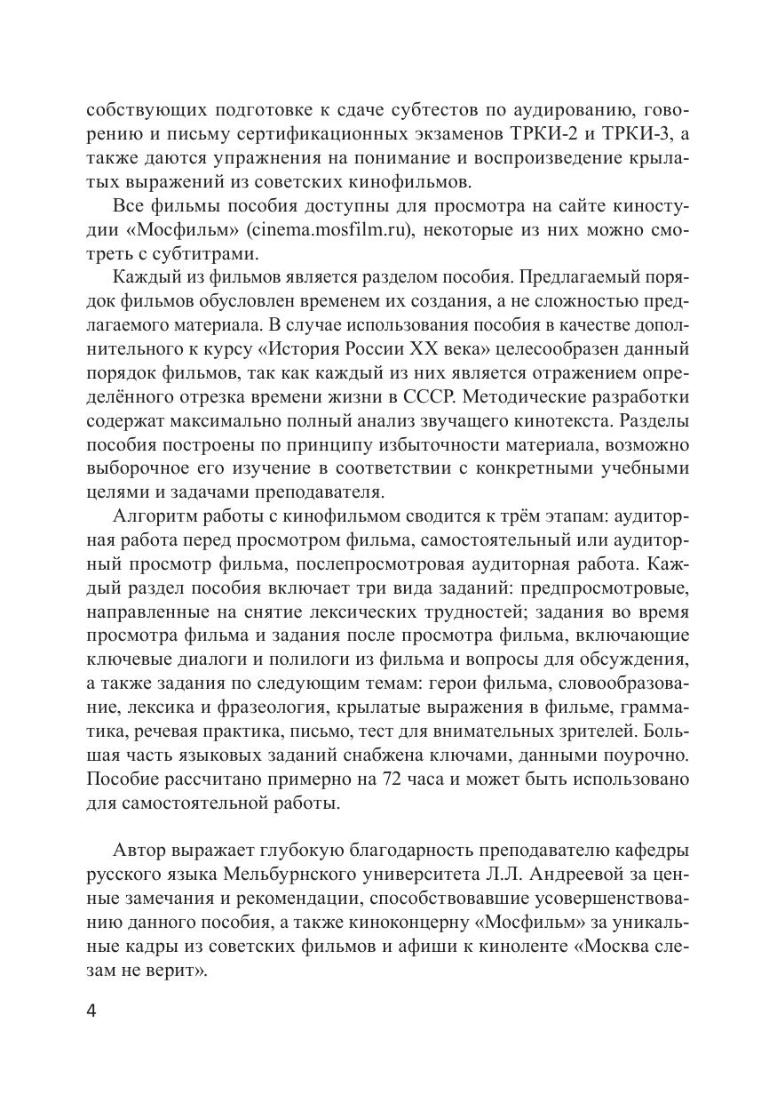Пособие включает методические разработки к десяти советским художественным фильмам, созданным на киностудин «Мосфильм». К каждому фильму предлагается система упражнений, способствующих подготовке к сдаче субтестов по аудированию, говорению и письму сертификационных экзаменов ТРКИ-2 и ТРКИ-3, а также упражнения на понимание и воспроизведение крылатых выражений из советских кинофильмов. Каждый раздел включает три вида заданий: предпросмотровые, задания во время просмотра фильма и задания после просмотра фильма, включающие ключевые диалоги и полилоги из фильма, вопросы для обсуждения, предлагаются задания, большая часть которых снабжена ключами, данными поурочно.