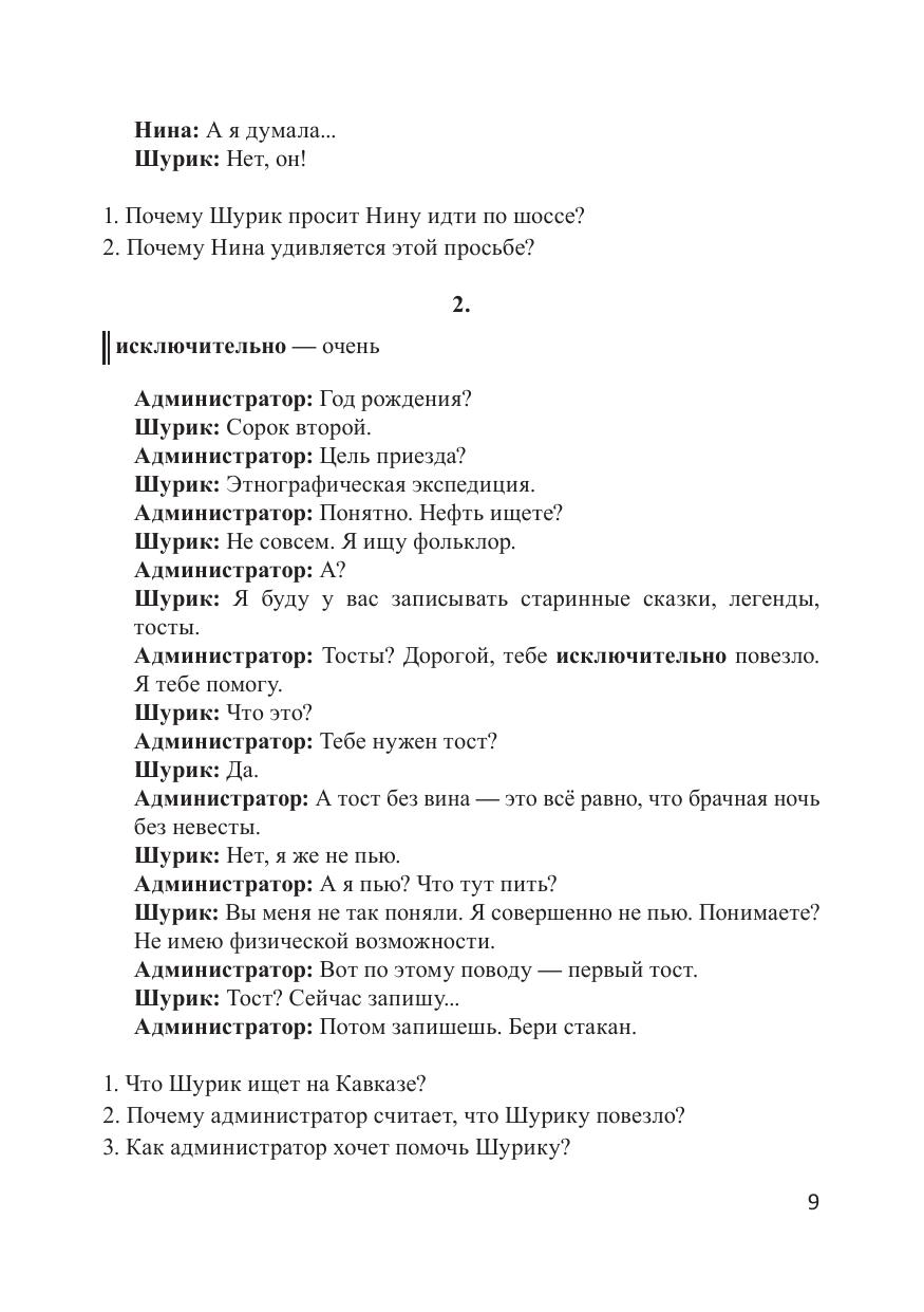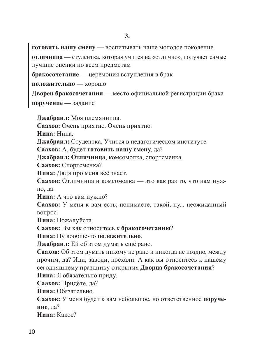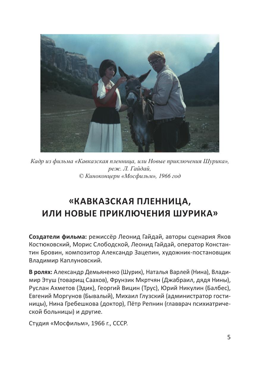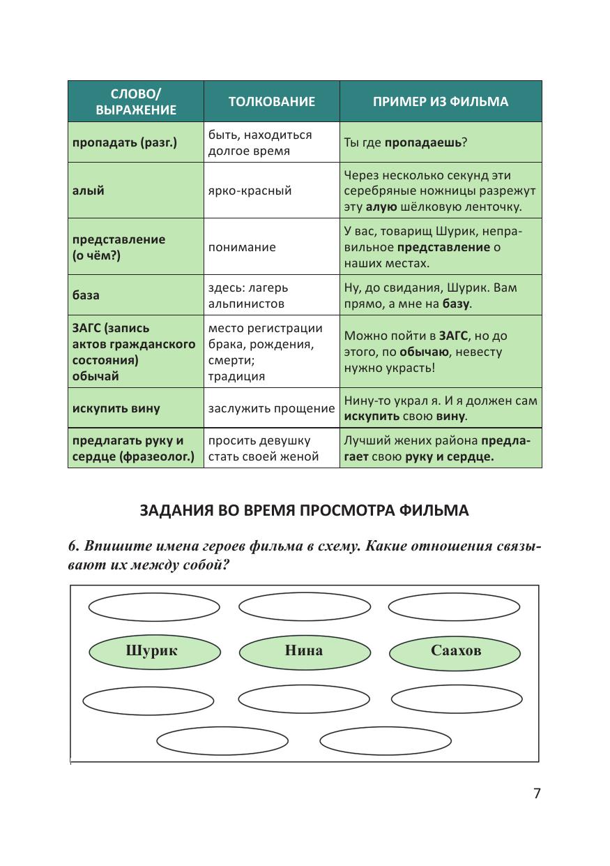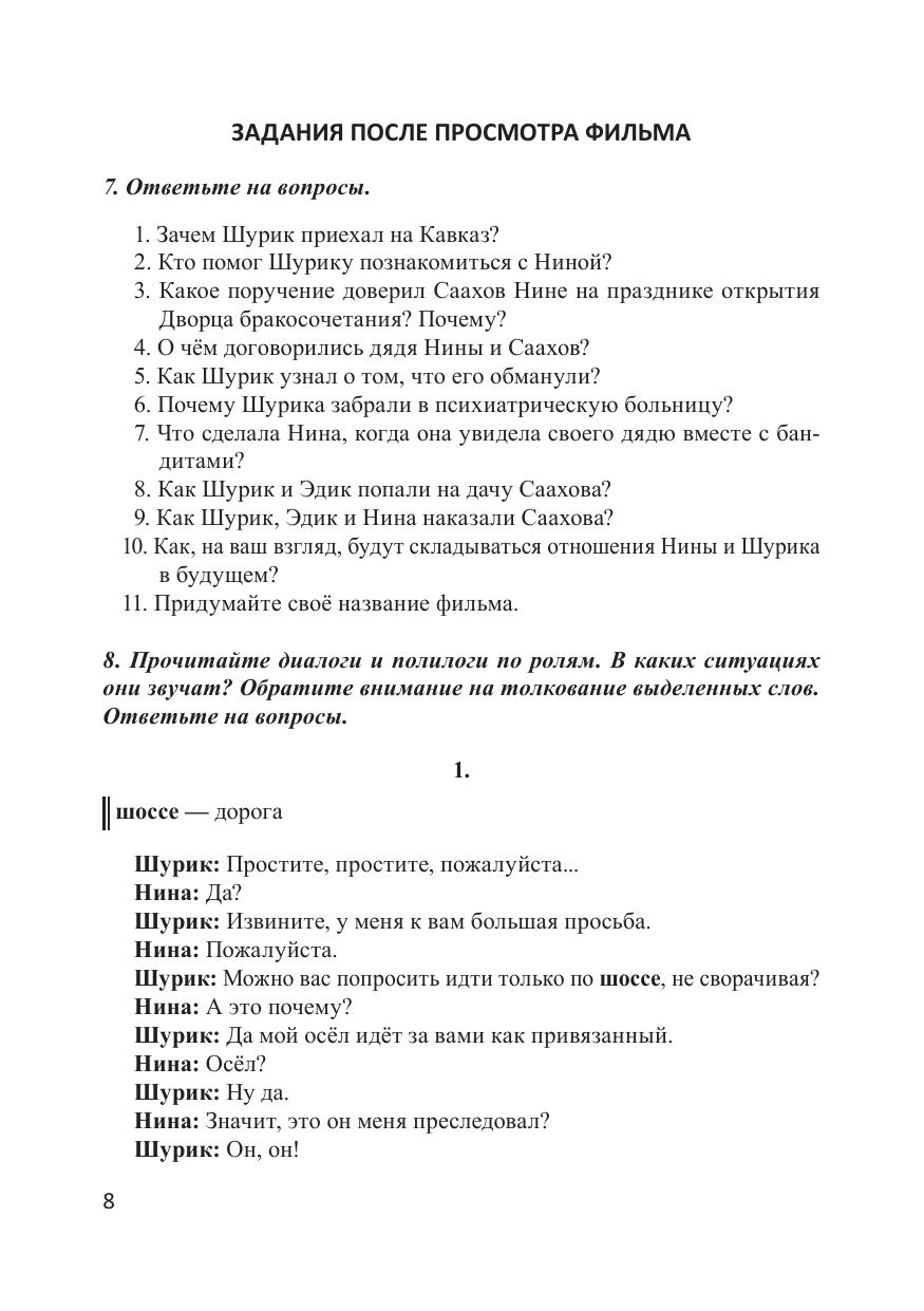 Пособие включает методические разработки к десяти советским художественным фильмам, созданным на киностудин «Мосфильм». К каждому фильму предлагается система упражнений, способствующих подготовке к сдаче субтестов по аудированию, говорению и письму сертификационных экзаменов ТРКИ-2 и ТРКИ-3, а также упражнения на понимание и воспроизведение крылатых выражений из советских кинофильмов. Каждый раздел включает три вида заданий: предпросмотровые, задания во время просмотра фильма и задания после просмотра фильма, включающие ключевые диалоги и полилоги из фильма, вопросы для обсуждения, предлагаются задания, большая часть которых снабжена ключами, данными поурочно.