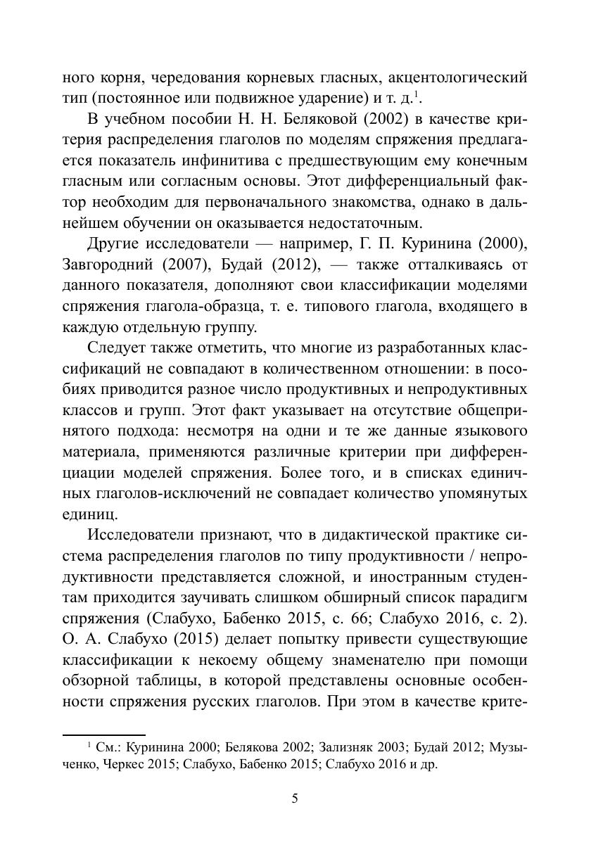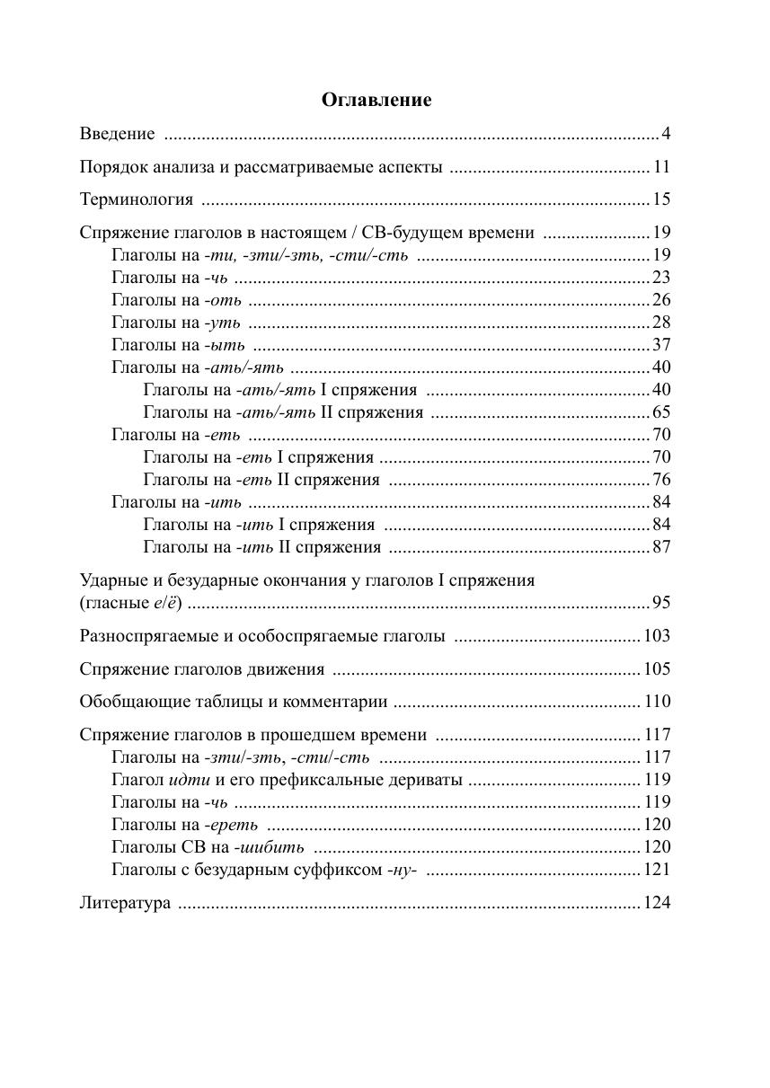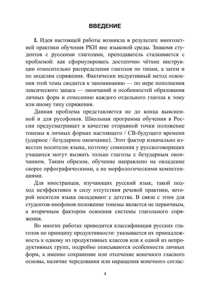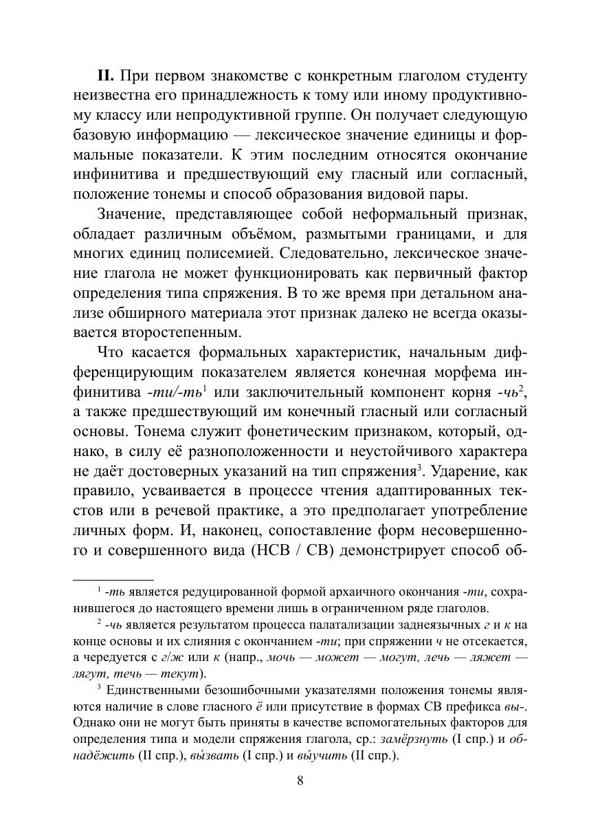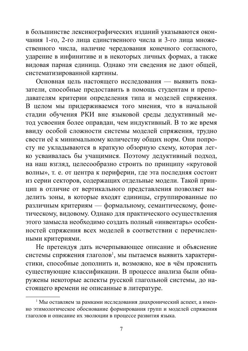 В книге, помимо традиционно указываемых формальных и фонетических индикаторов, рассматриваются не описанные ранее семантические и видовые характеристики, которые являются, по мнению автора, нетривиальными признаками принадлежности глагола к определённому типу и модели спряжения.