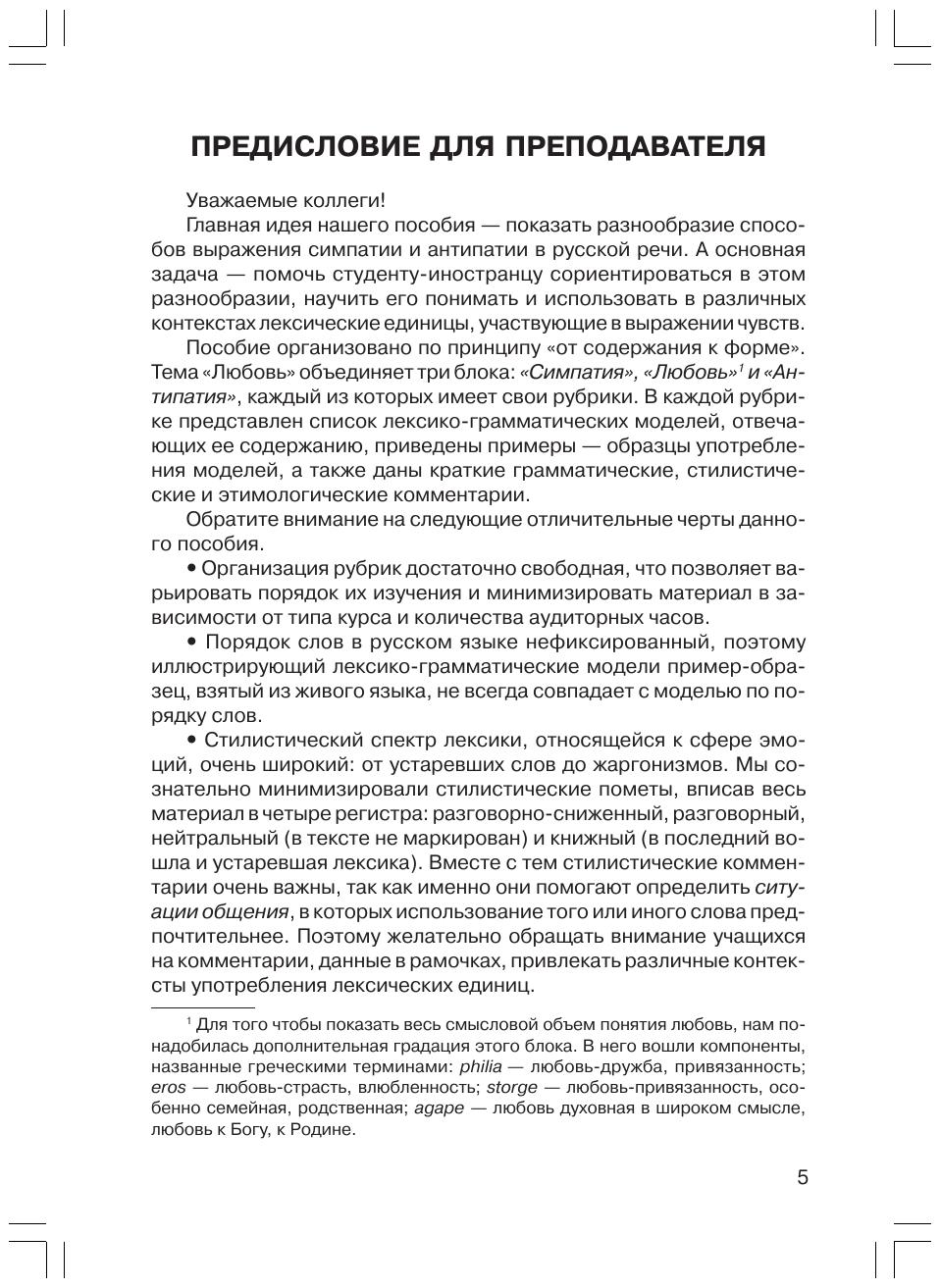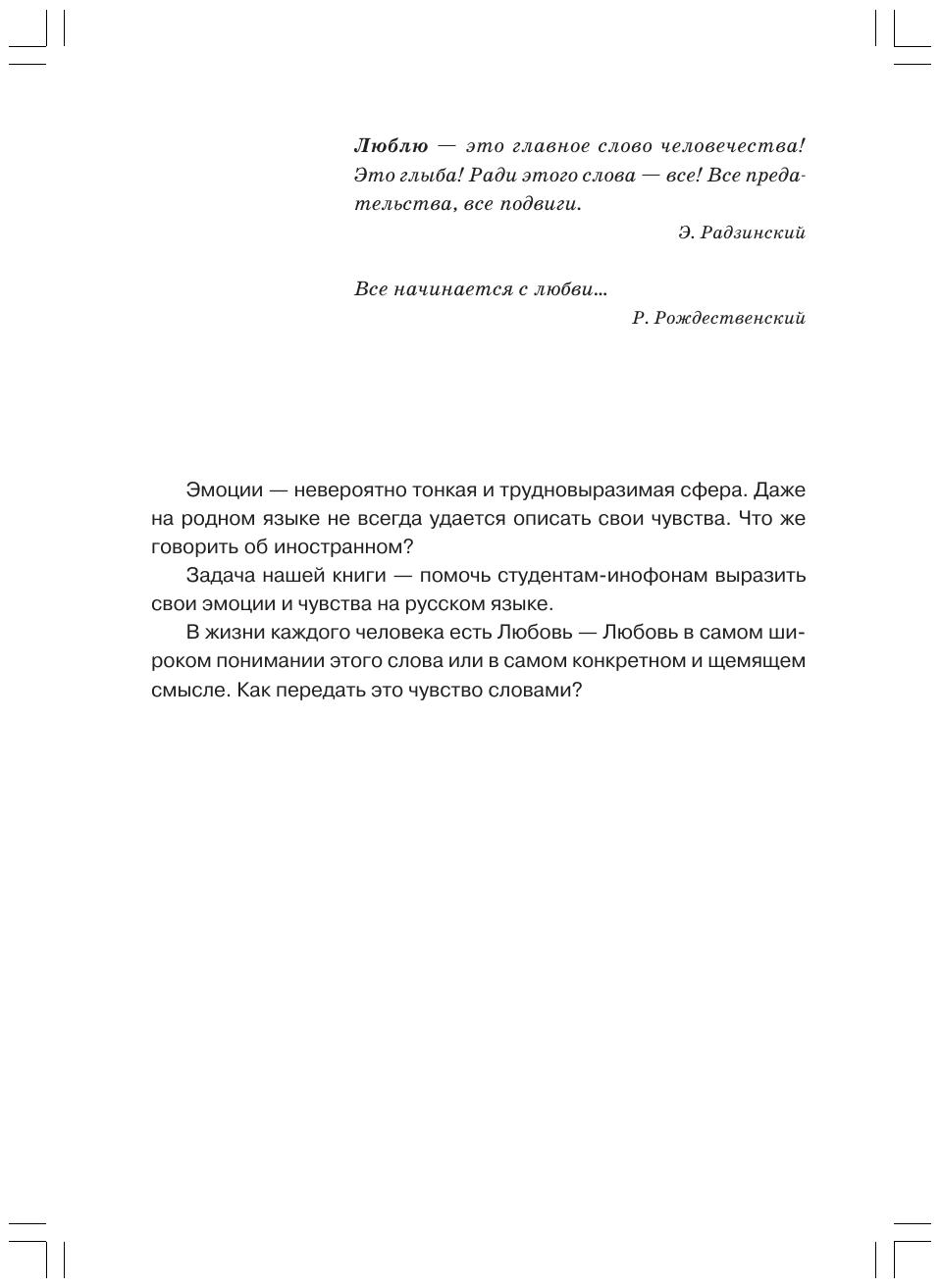 В учебном пособии представлены лексико?грамматические модели, входящие в поле концепта «Любовь», их текстовые реализации и комментарии, ориентированные на студента-инофона. Пособие может быть рекомендовано изучающим русский язык как иностранный с различным уровнем подготовки.