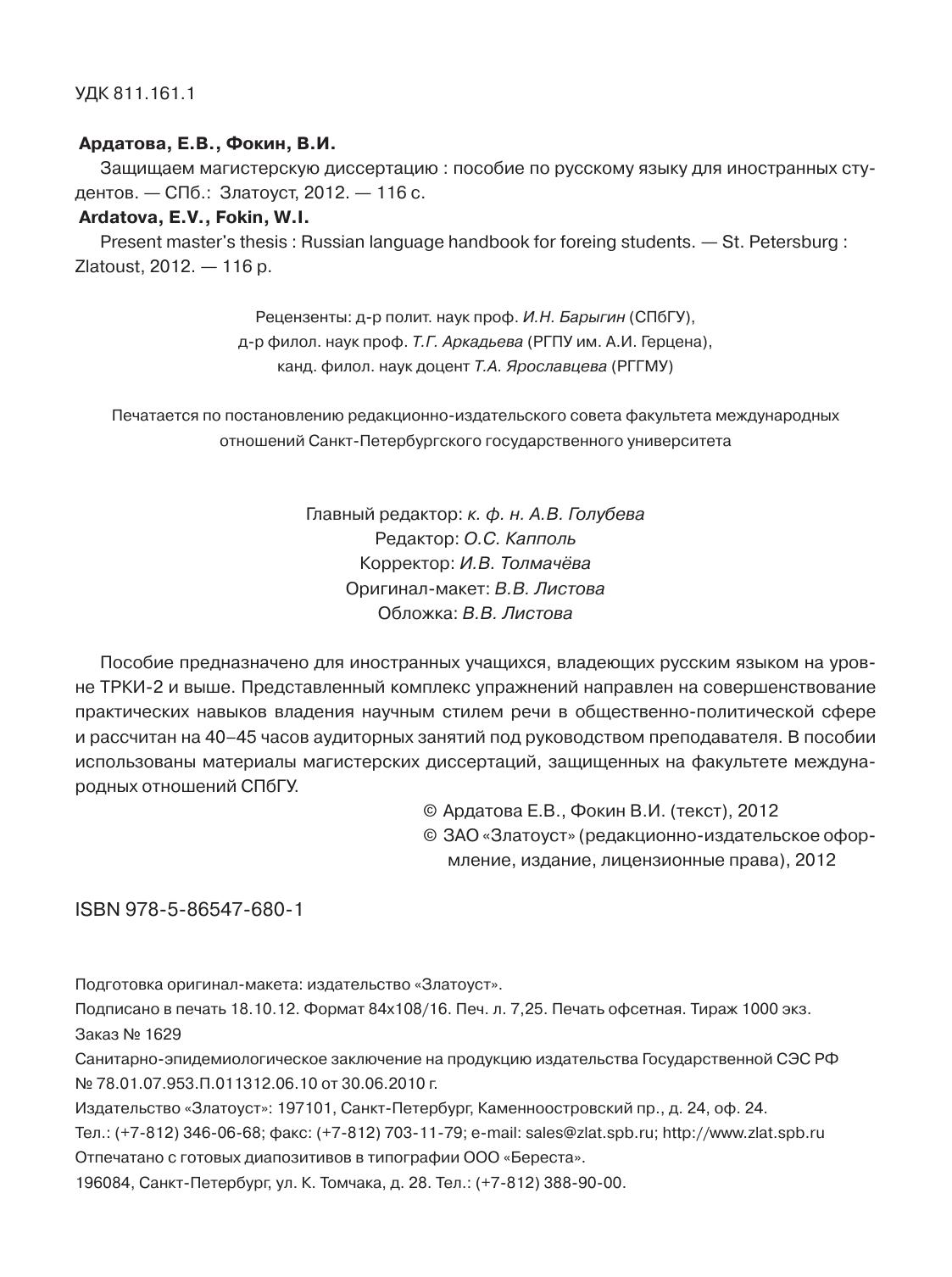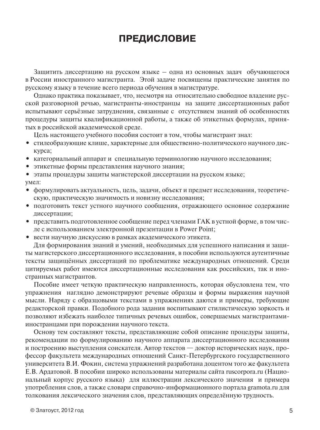 Пособие предназначено для иностранных учащихся, владеющих русским языком на уровне ТРКИ-2 и выше. Представленный комплекс упражнений направлен на совершенствование практических навыков владения научным стилем речи в общественно-политической сфере и рассчитан на 40–45 часов аудиторных занятий под руководством преподавателя. В пособии использованы материалы магистерских диссертаций, защищенных на факультете международных отношений СПбГУ.