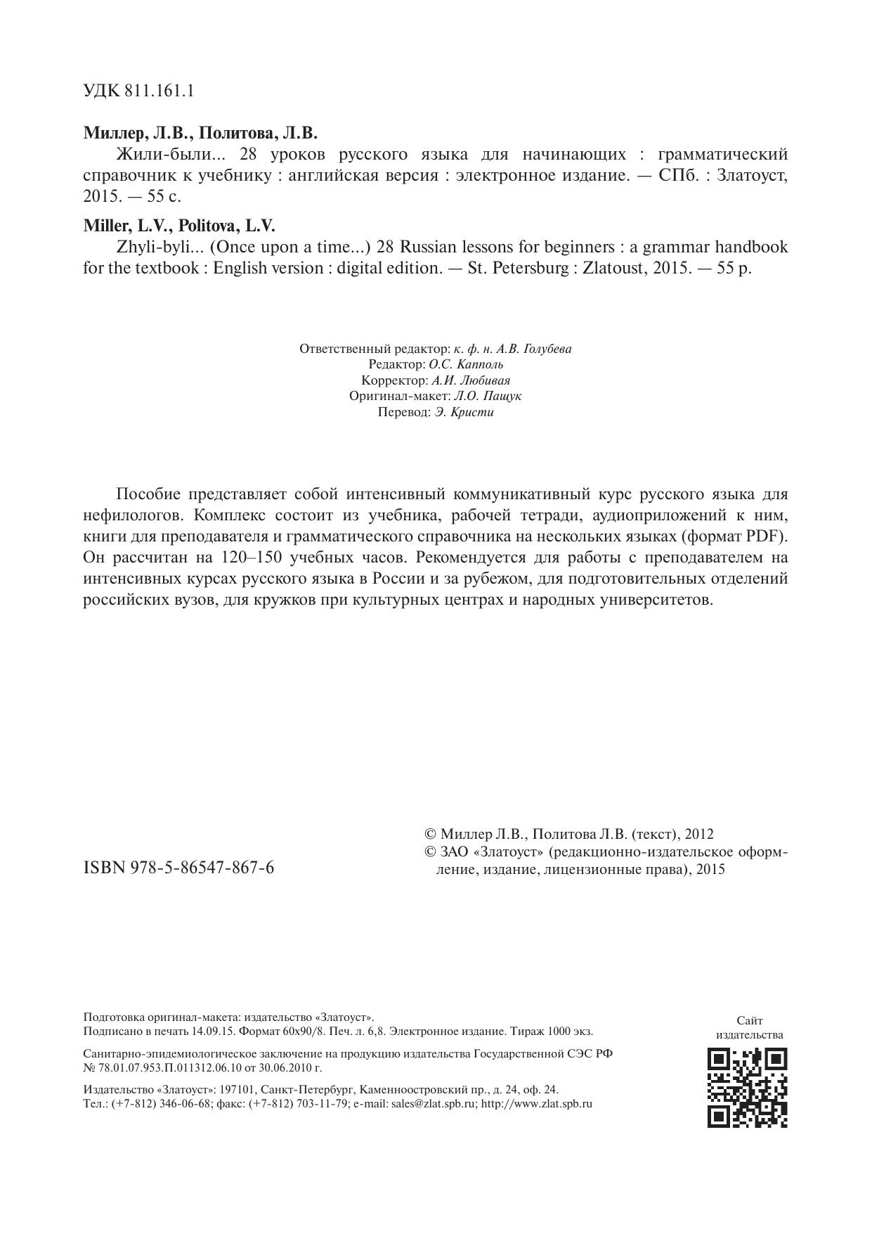 Пособие представляет собой интенсивный коммуникативный курс русского языка для нефилологов. Комплекс состоит из учебника, рабочей тетради, аудиоприложений к ним, книги для преподавателя и грамматического справочника на нескольких языках (формат PDF). Он рассчитан на 120–150 учебных часов. Рекомендуется для работы с преподавателем на интенсивных курсах русского языка в России и за рубежом, для подготовительных отделений российских вузов, для кружков при культурных центрах и народных университетов.