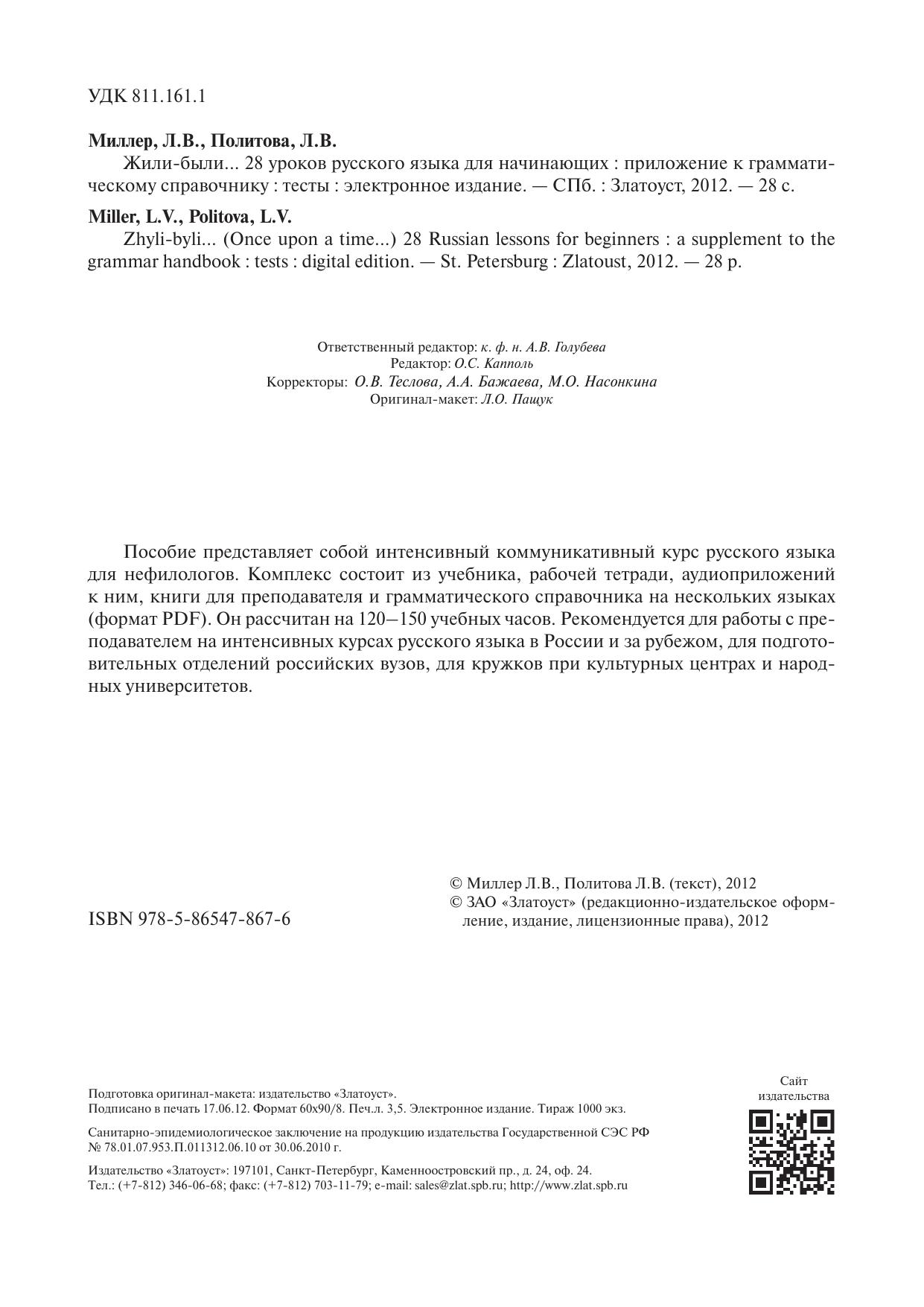 Пособие представляет собой интенсивный коммуникативный курс русского языка для нефилологов. Комплекс состоит из учебника, рабочей тетради, аудиоприложений к ним, книги для преподавателя и грамматического справочника на нескольких языках (формат PDF). Он рассчитан на 120–150 учебных часов. Рекомендуется для работы с преподавателем на интенсивных курсах русского языка в России и за рубежом, для подготовительных отделений российских вузов, для кружков при культурных центрах и народных университетов.